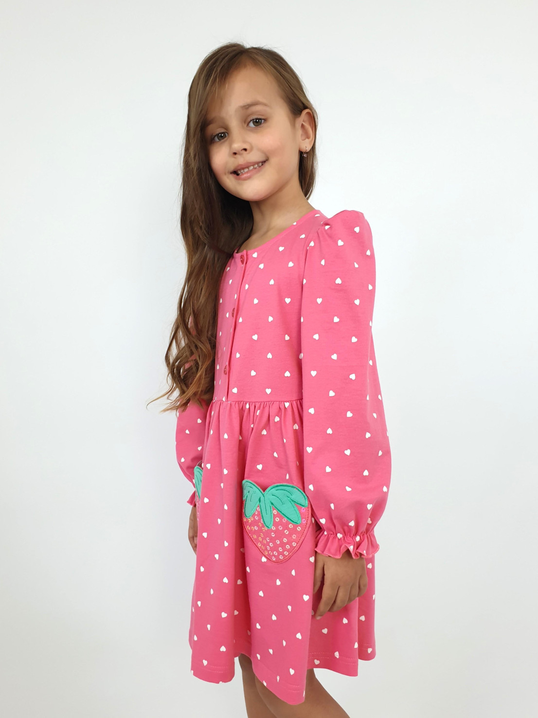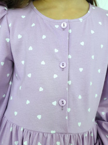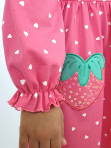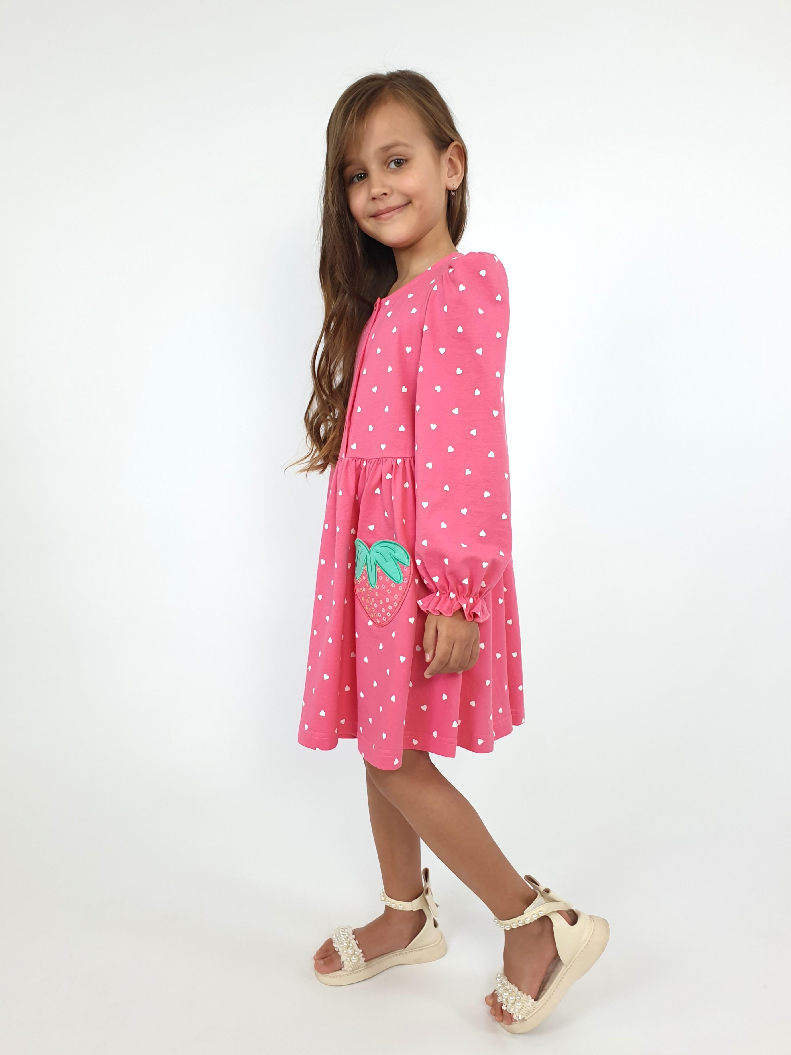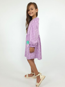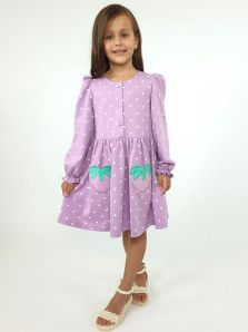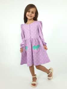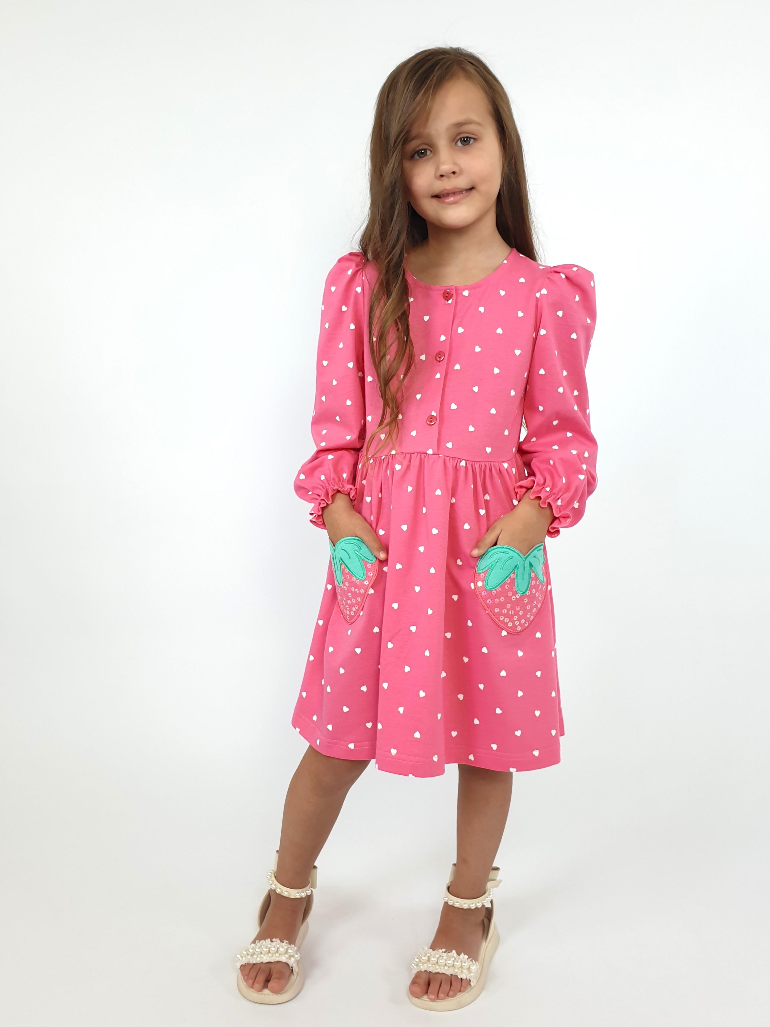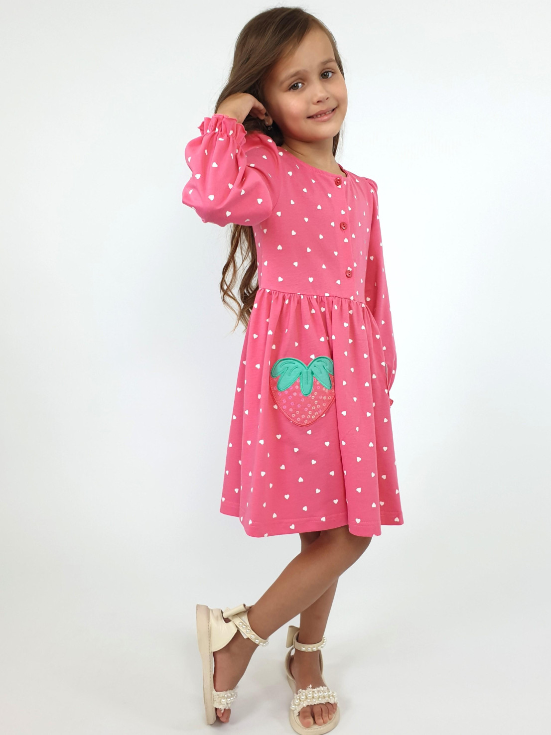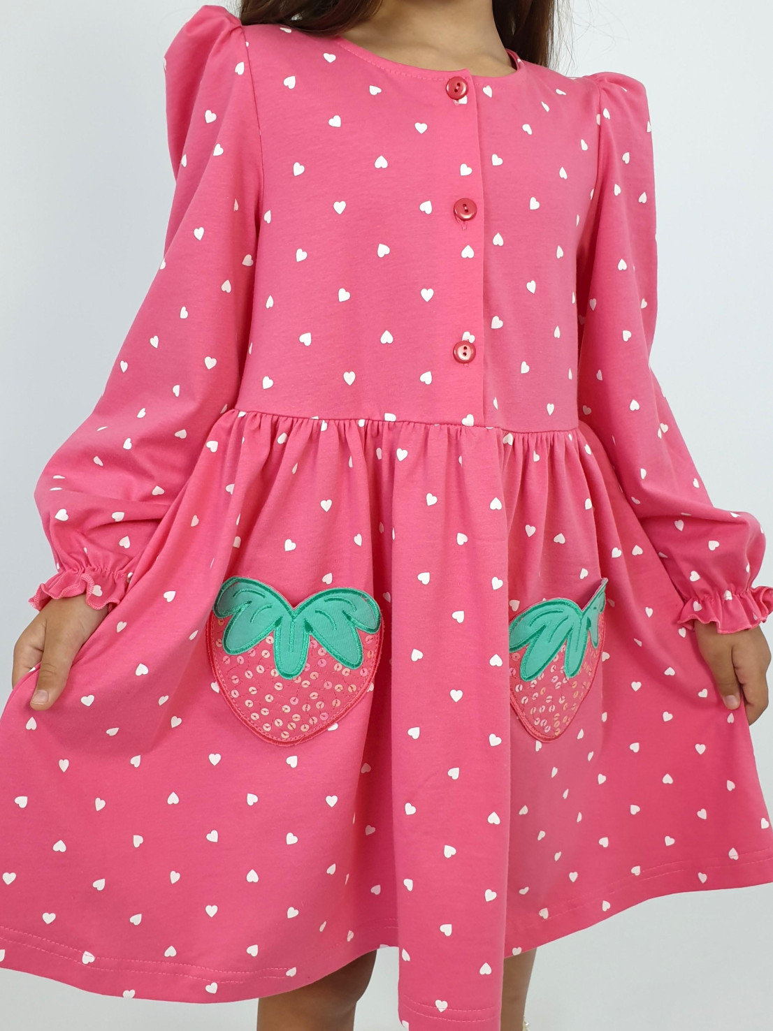 Кулирное полотно (набивка):100% х/б. Платье-с отрезной юбкой в сборку,два кармана с вышивкой(пайетки).Длинный рукав с резинкой внизу,сборка по окату.Горловина окантована и подшита,застежка центральная на пуговицы.