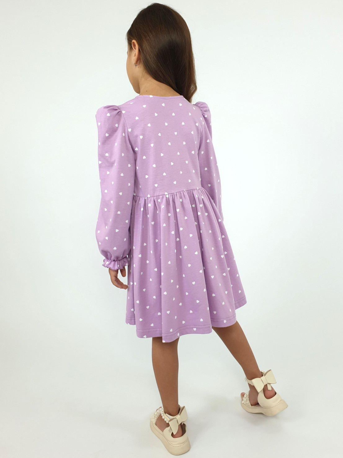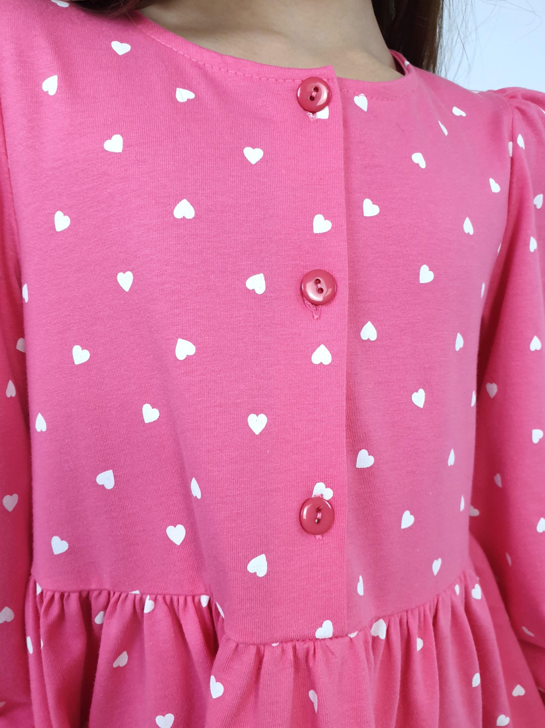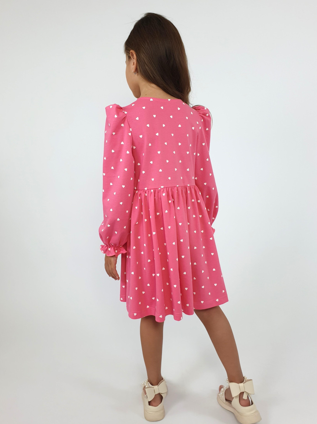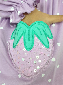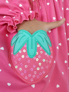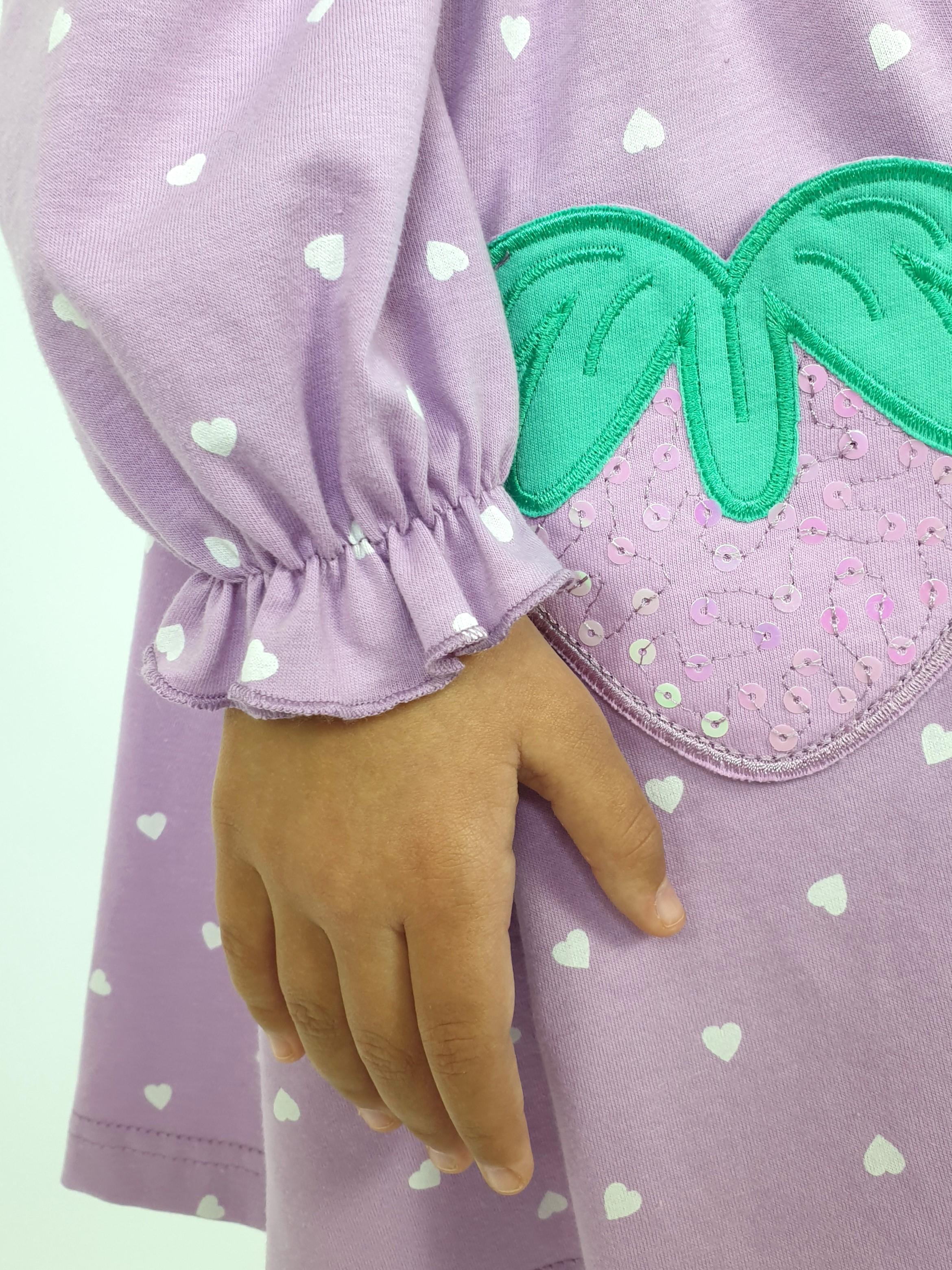 Кулирное полотно (набивка):100% х/б. Платье-с отрезной юбкой в сборку,два кармана с вышивкой(пайетки).Длинный рукав с резинкой внизу,сборка по окату.Горловина окантована и подшита,застежка центральная на пуговицы.