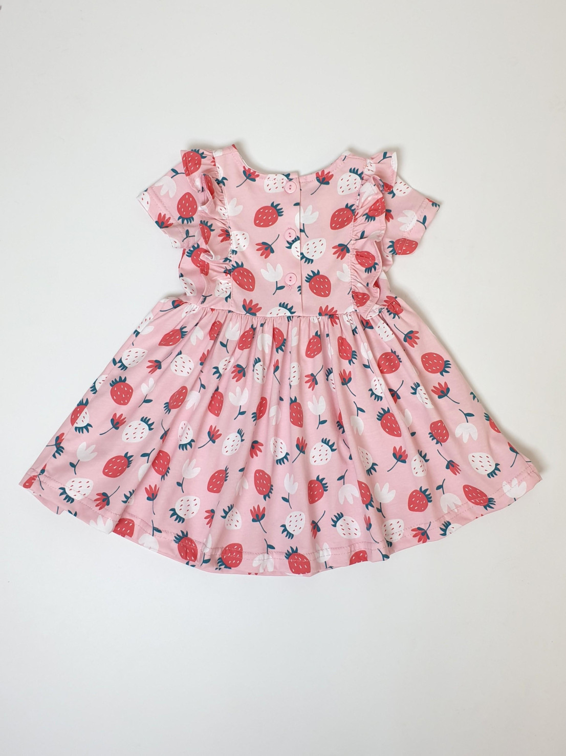 Кулирное полотно:100% х/б. Платье- полуприлегающего силуэта,короткий рукав. Отрезная юбка со сборкой, рельефы с рюшей. Горловина окантована и подшита. Застежка сзади на пуговицы.