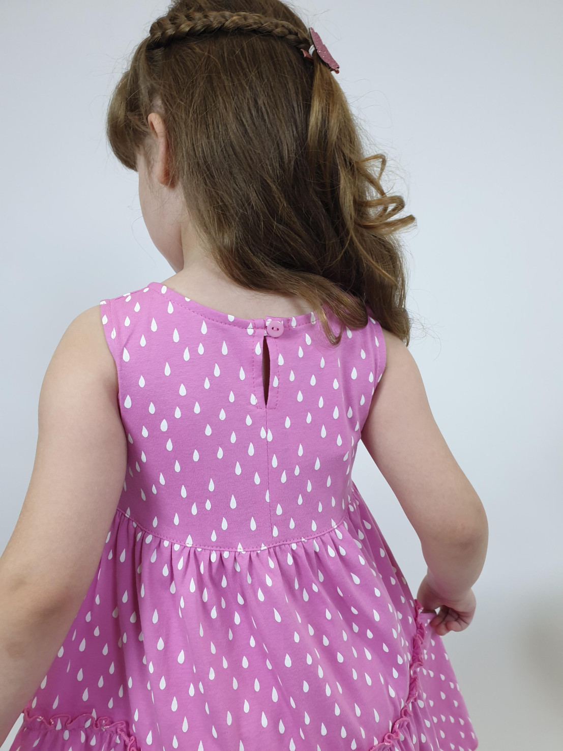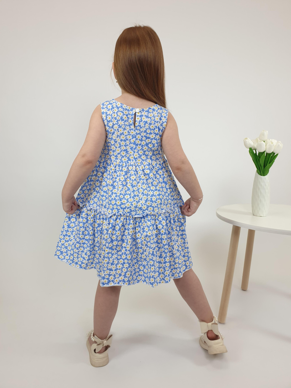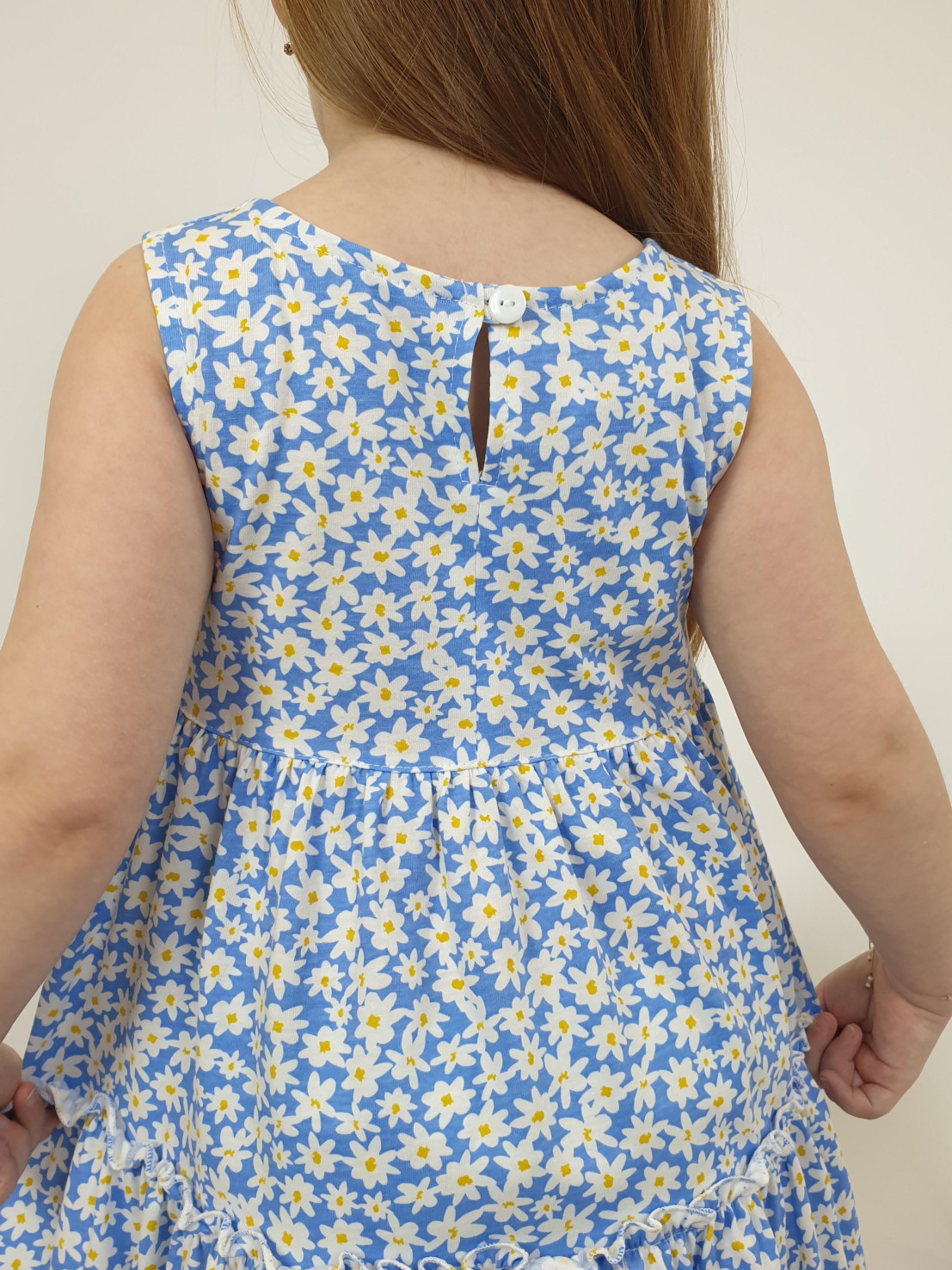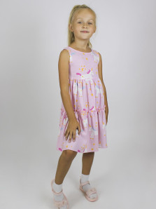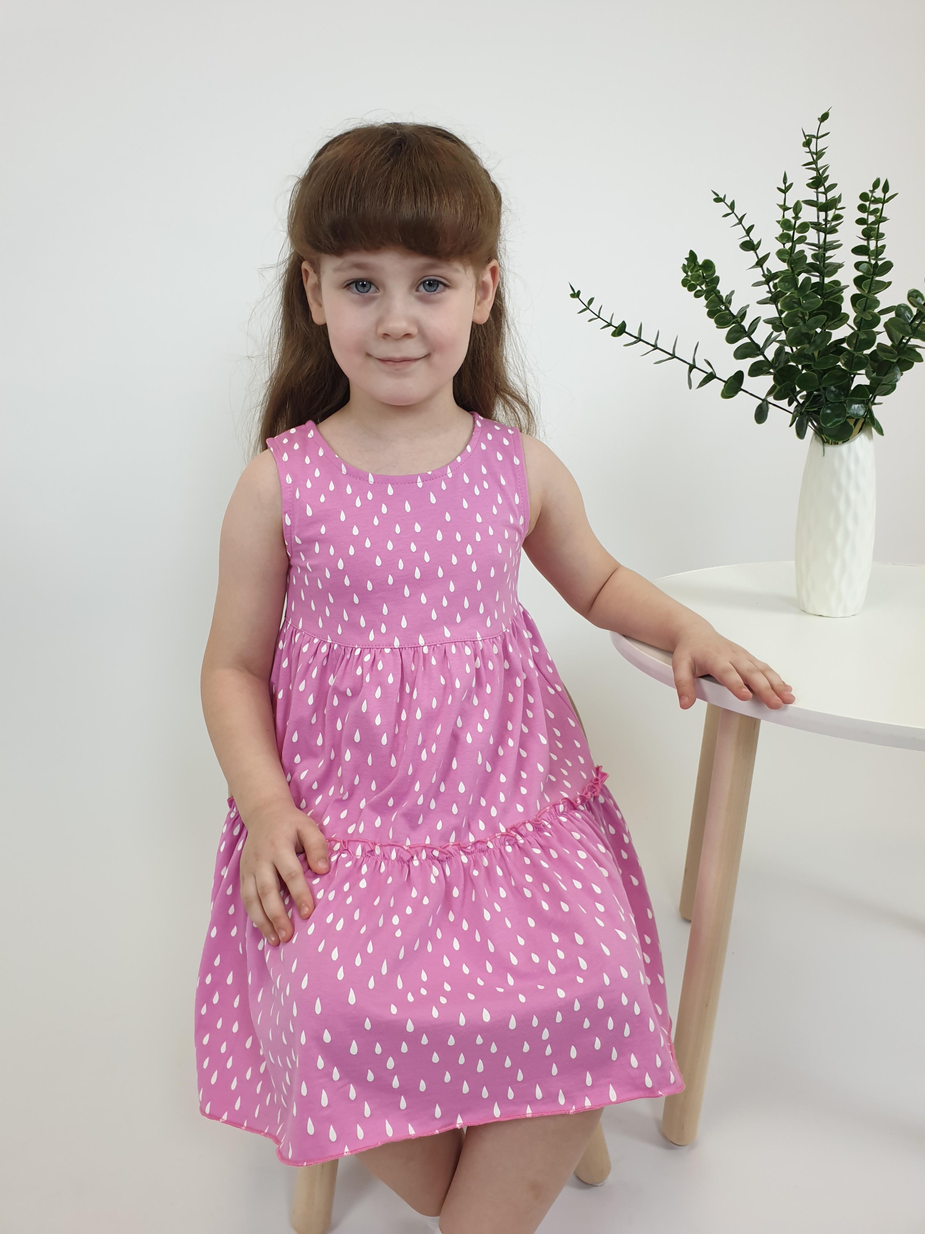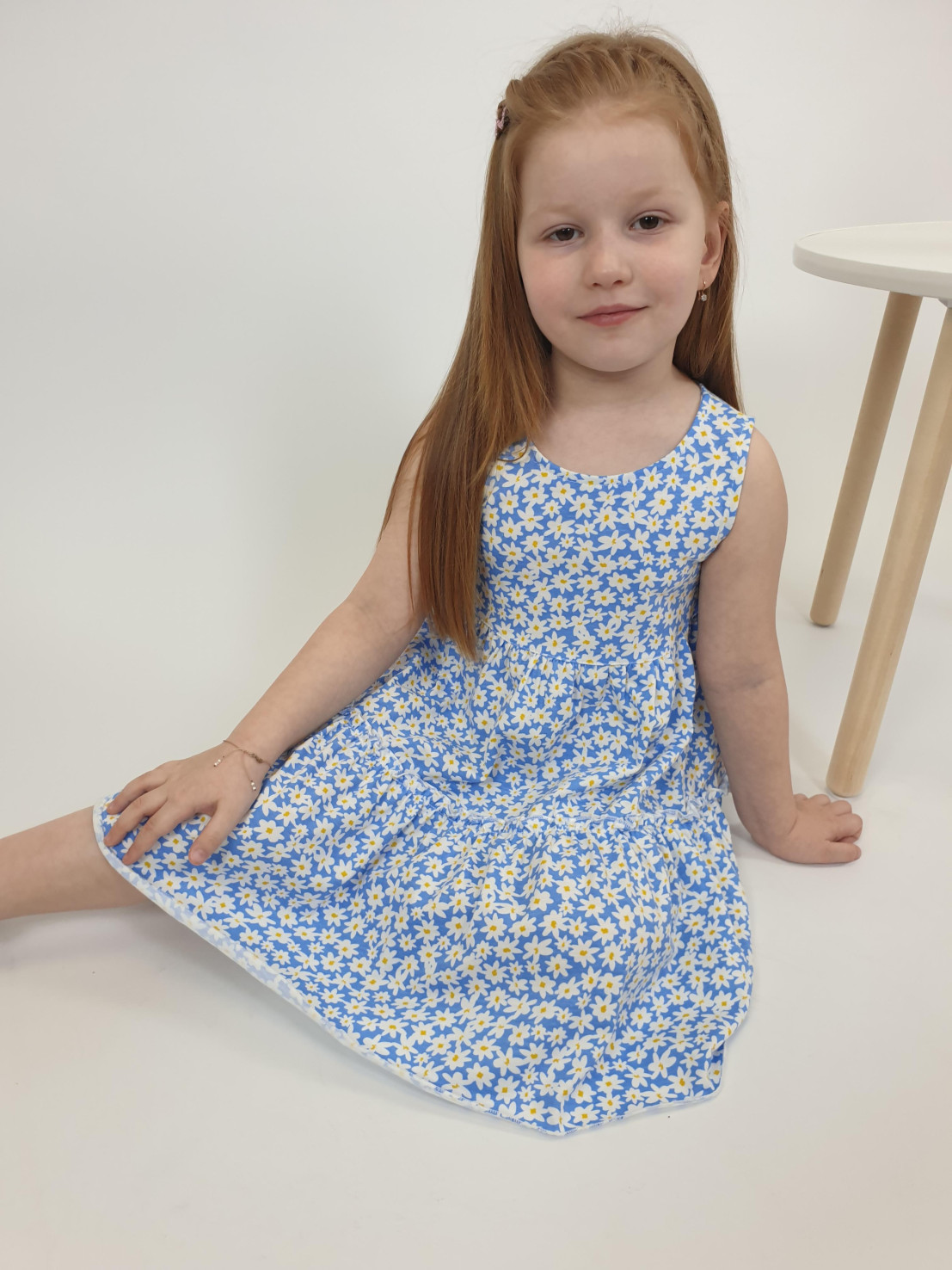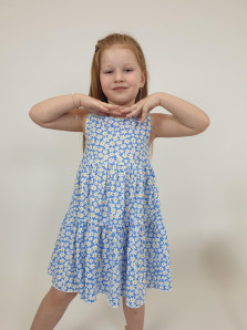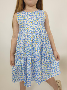 Кулирное полотно:100% х/б. Платье-силуэт трапеция,без рукава.Юбка переда и спинки из двух воланов.Горловина,пройма окантованы и подшиты.Застежка на спинке "щель"пуговица.