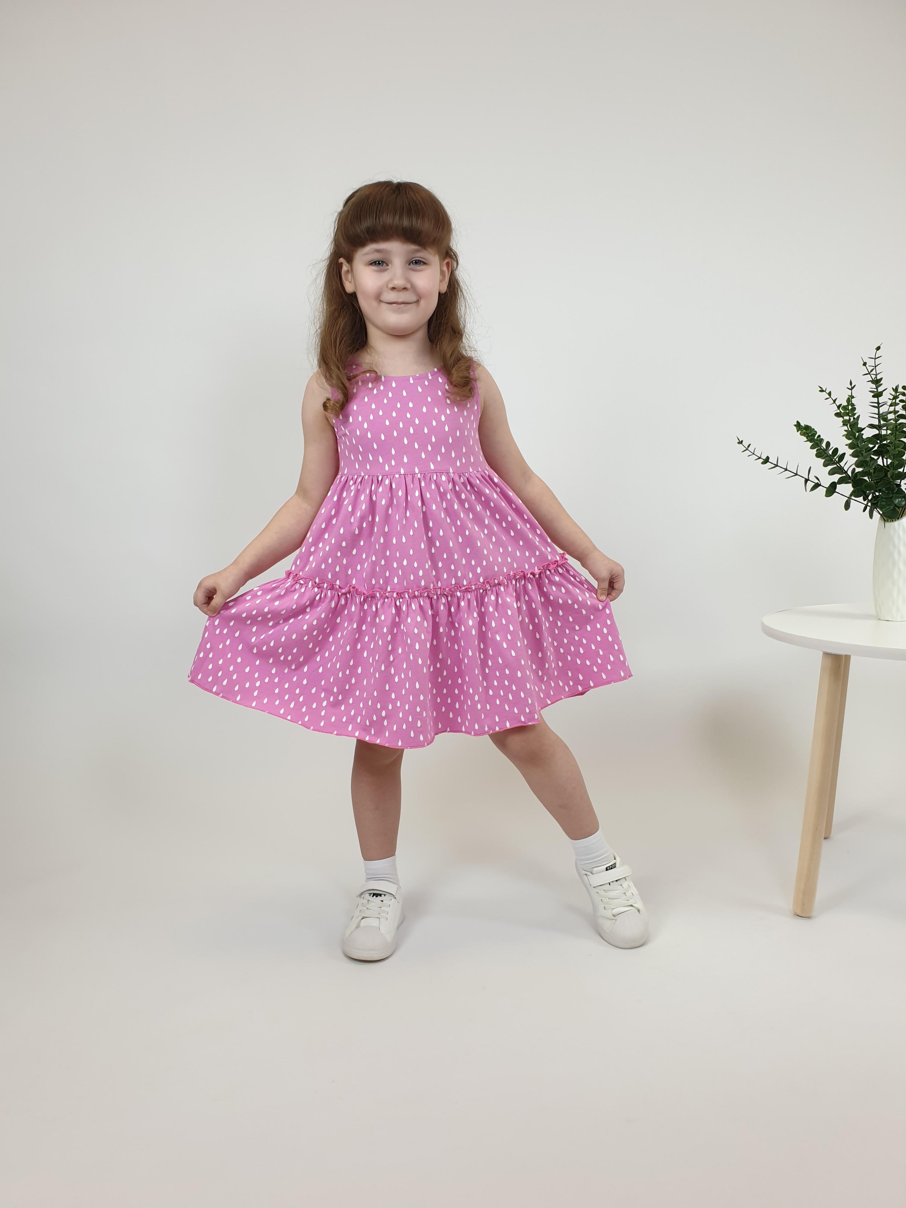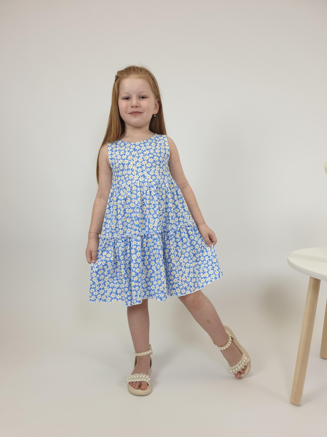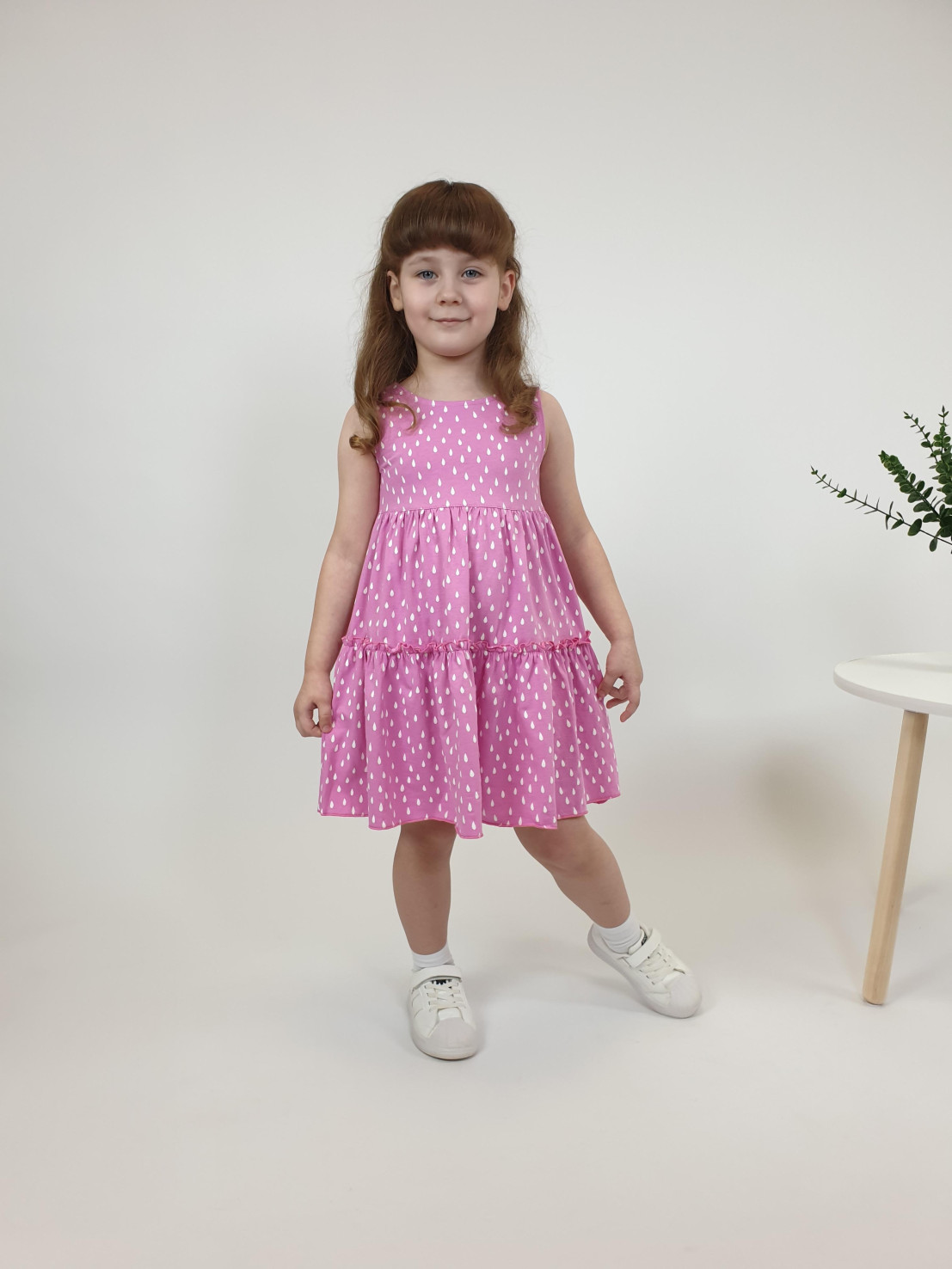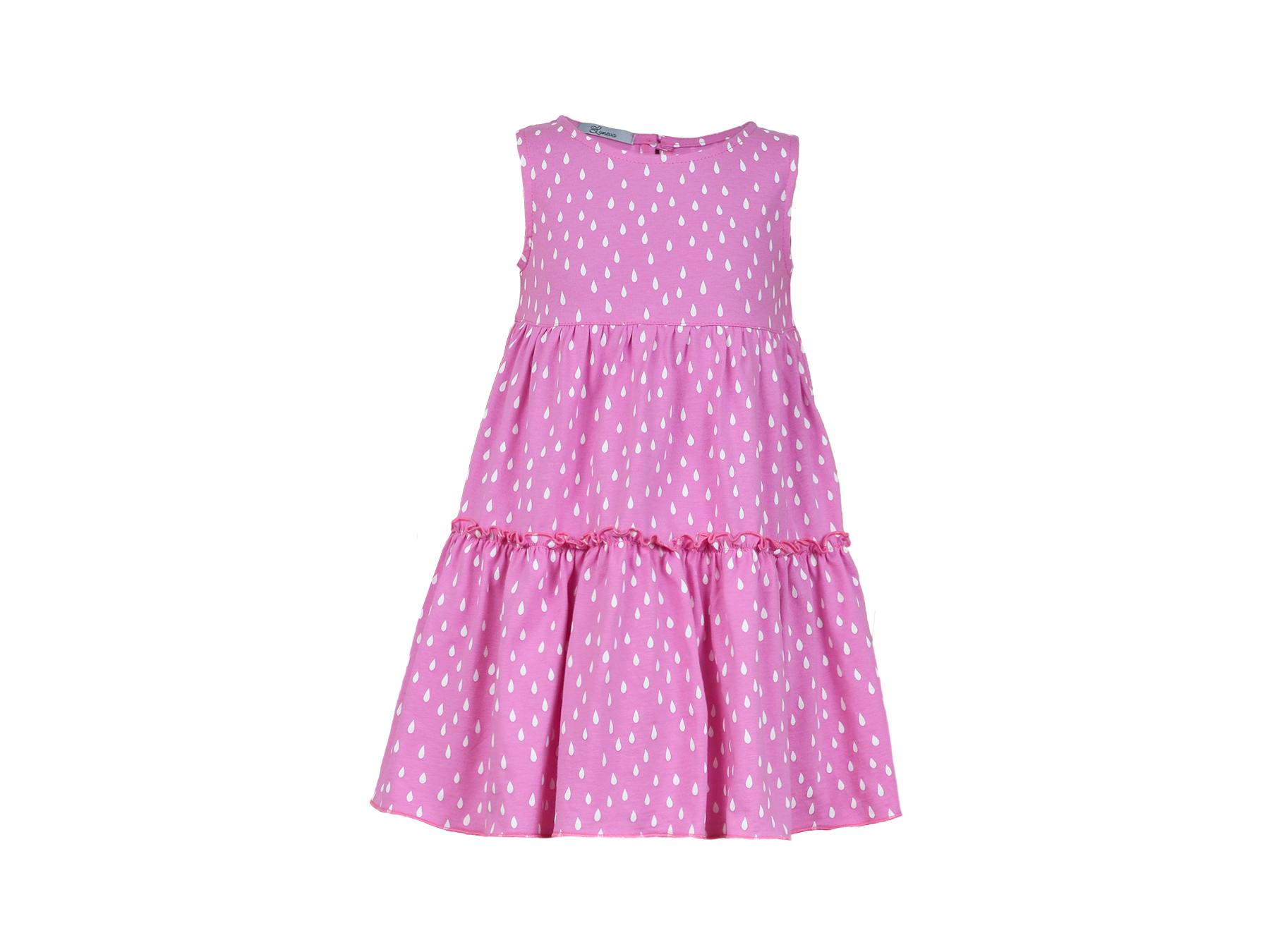 Кулирное полотно:100% х/б. Платье-силуэт трапеция,без рукава.Юбка переда и спинки из двух воланов.Горловина,пройма окантованы и подшиты.Застежка на спинке "щель"пуговица.