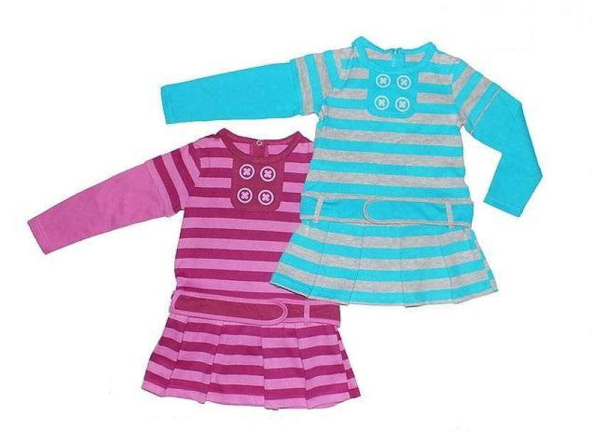 Платье. Кулирная гладь, 100% х/б, сочетание полосы и гладкокрашеной. Приталенный силуэт, отрезное по линии бедер, на переде декоративная планка. Печать на планке. Юбка со складками, с настрачными шлевками и отлетным поясом. Пояс застегивается на контактную ленту. Застежка центральная на спинке на кнопки. Рукав втачной, двойной – нижний длинный, верхний – короткий. Горловина, пояс окантованы. Низ рукавов и низ изделия подшиты.