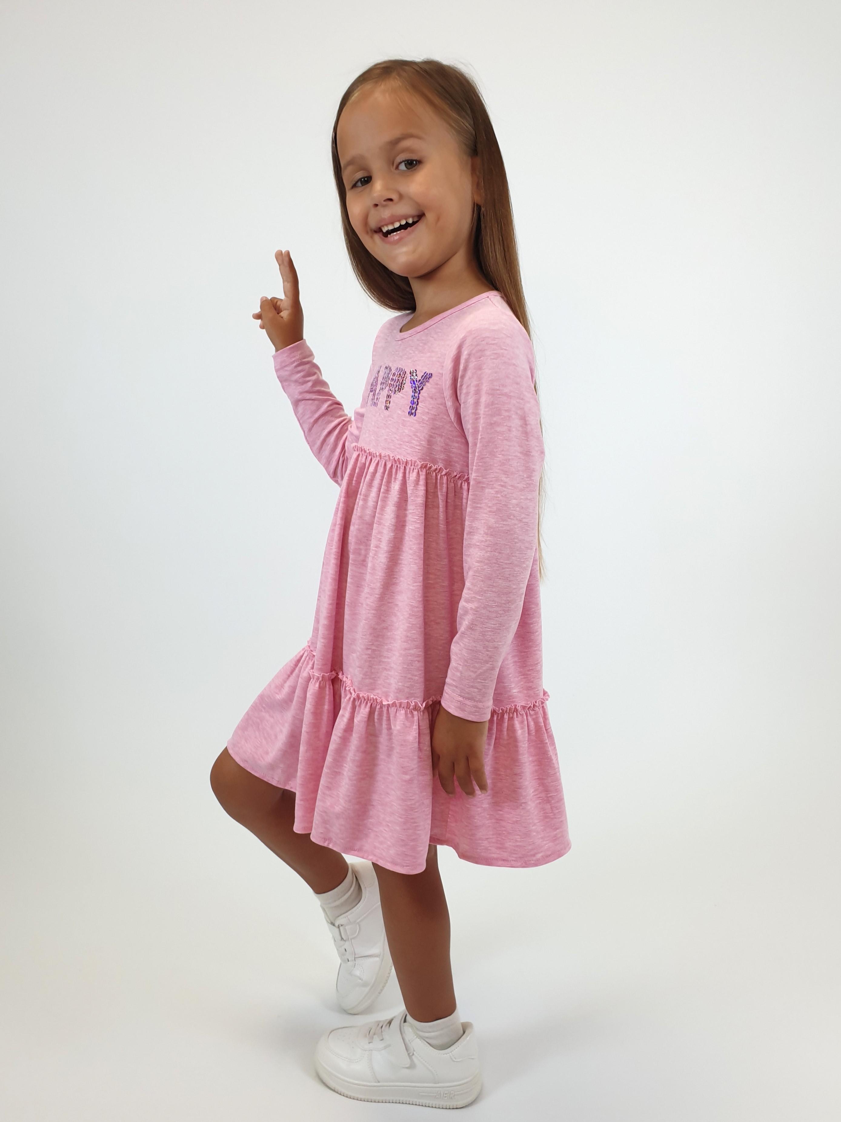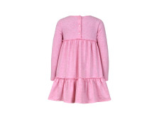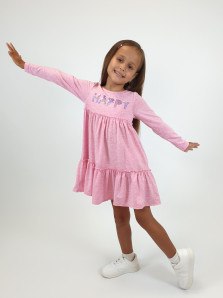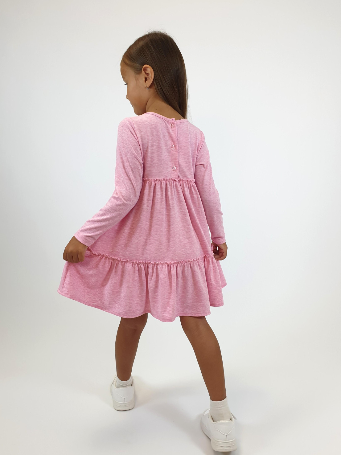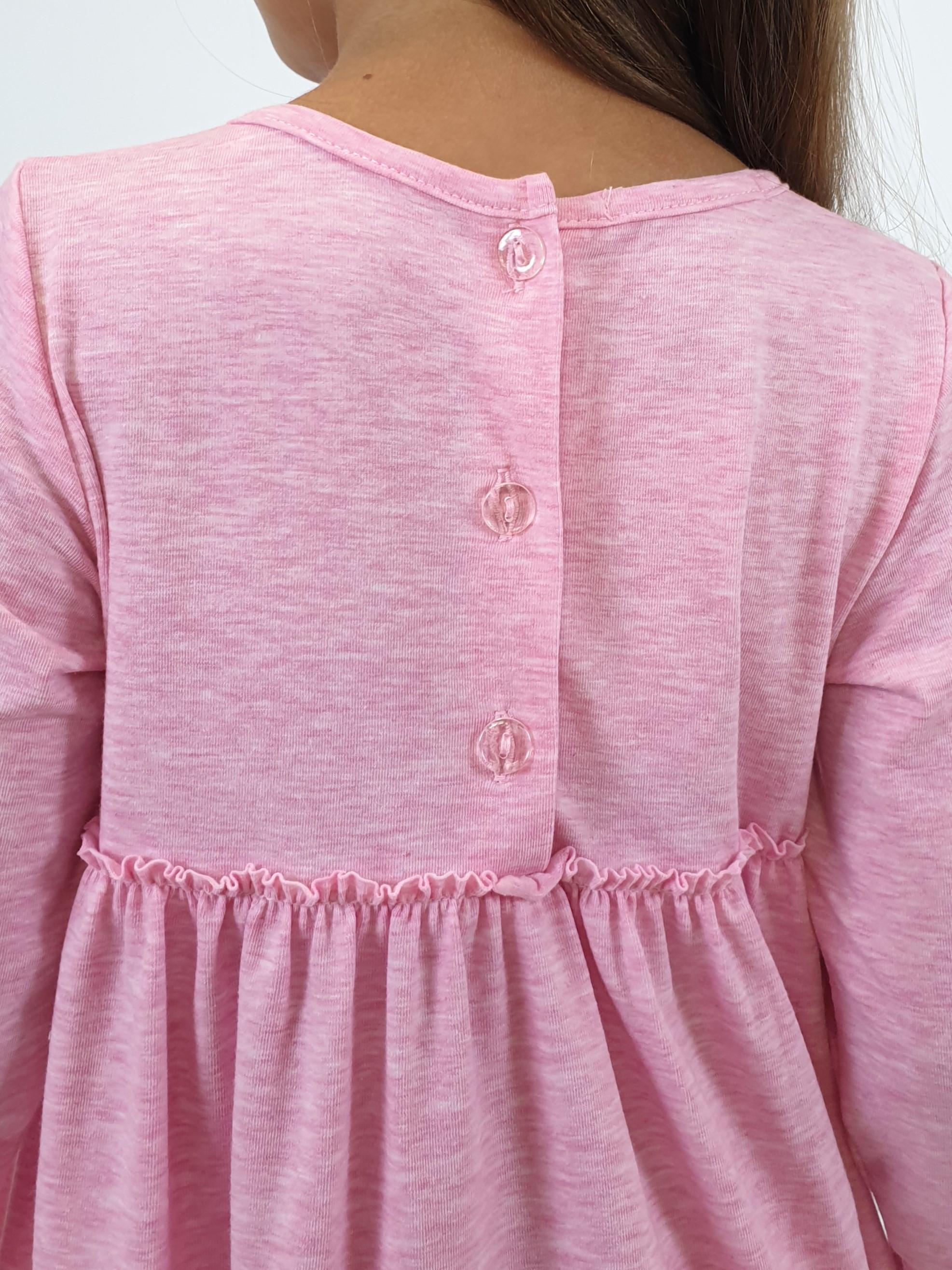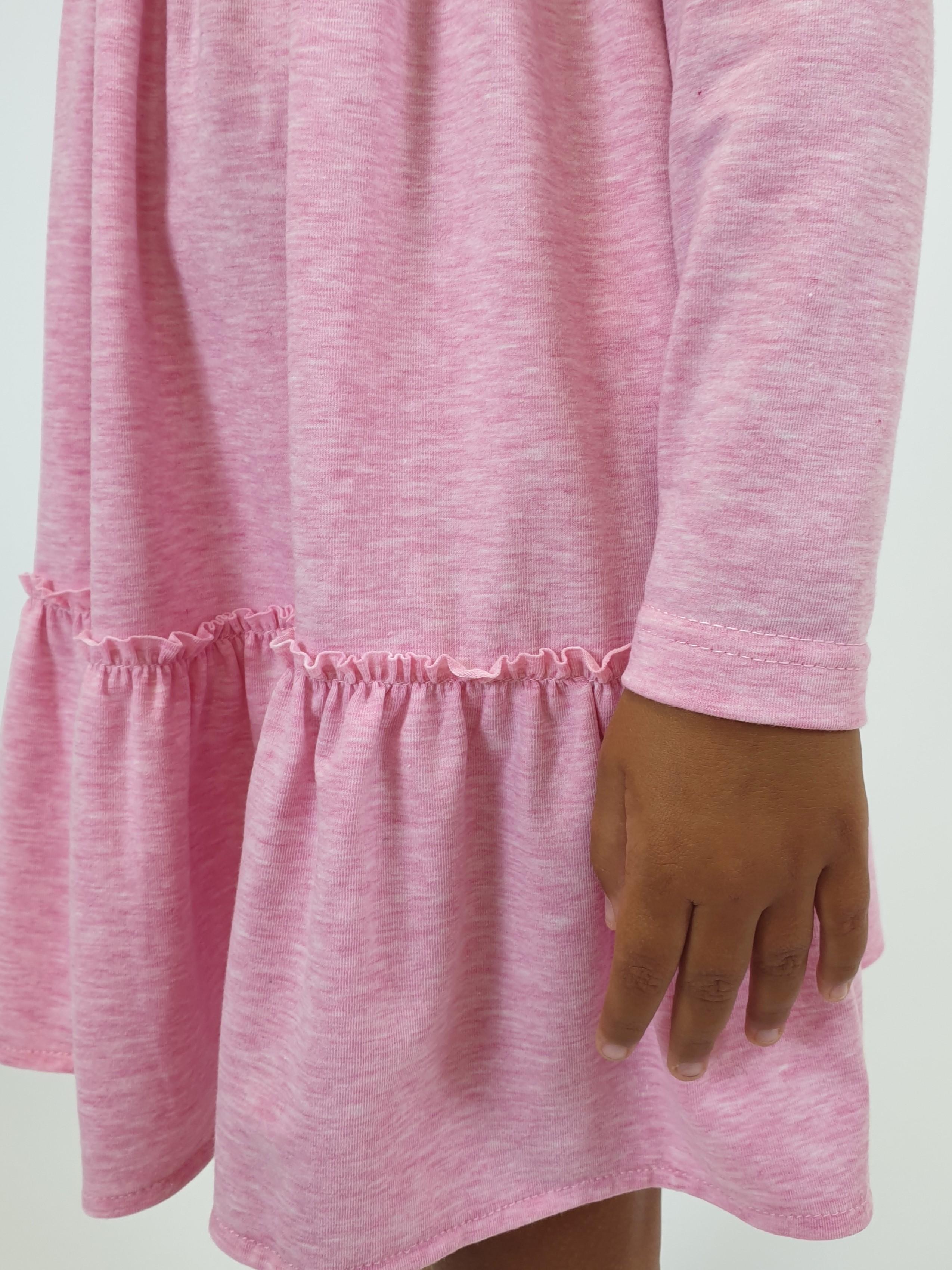 Кулирное полотно:меланжированное 30%х/б,70%п/э. Платье-силуэт трапеция,длинный втачной рукав.Кокетка переда с вышивкой,застежка по кокетке спинки на пуговицы.Юбка переда и спинки из двух воланов.Горловина окантована.