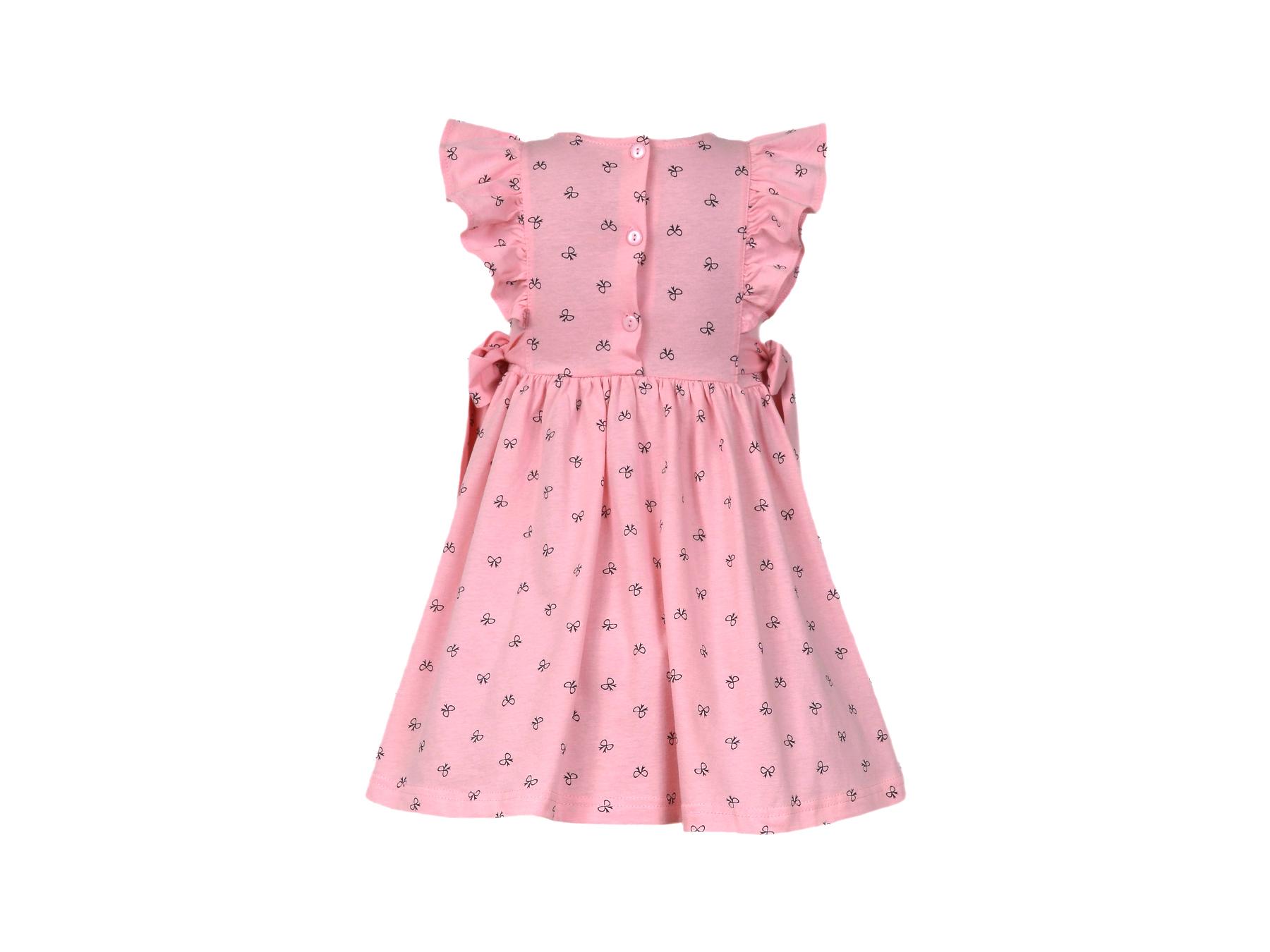 Кулирное полотно:100% х/б. Платье- полуприлегающего силуэта,без рукава.Отрезная юбка со сборкой,рельефы с рюшей.В рельефы вставлены пояса и завязаны на бант.Горловина,пройма окантованы и подшиты,застежка сзади на пуговицы.