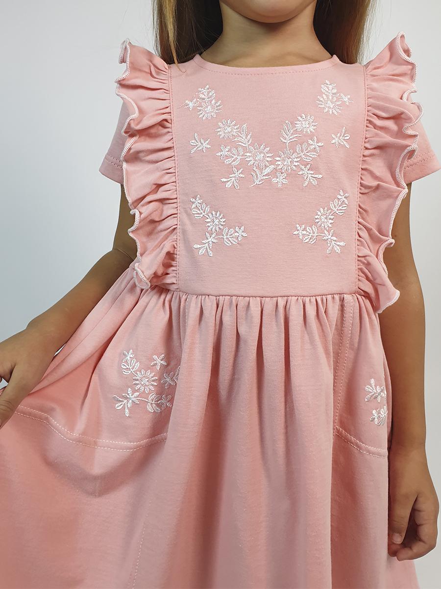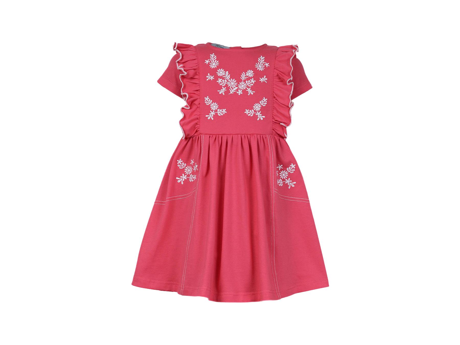 Кулирное полотно:100% х/б. Платье-полуприлегающего силуэта,короткий рукав.Отрезная юбка со сборкой рельефами.Лиф с рельефами и рюшей.Вышивка на боковых клиньях юбки и центральной вставке переда.Горловина окантована и подшита,застежка сзади на пуговицы.