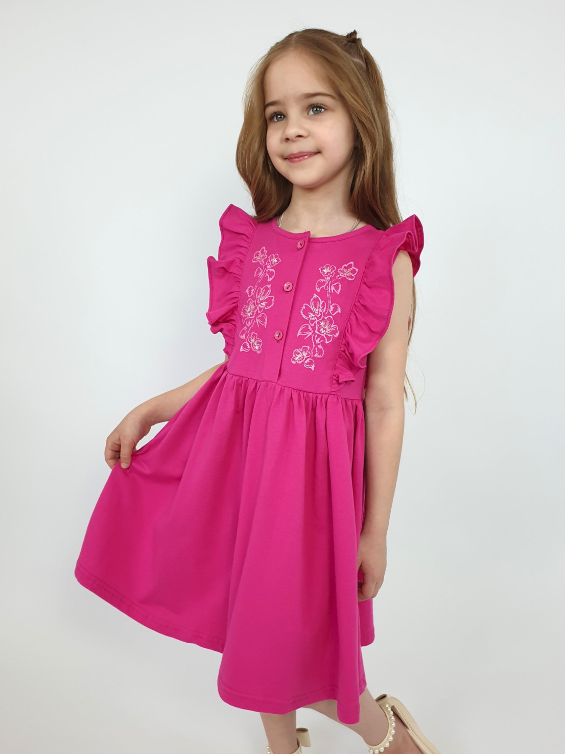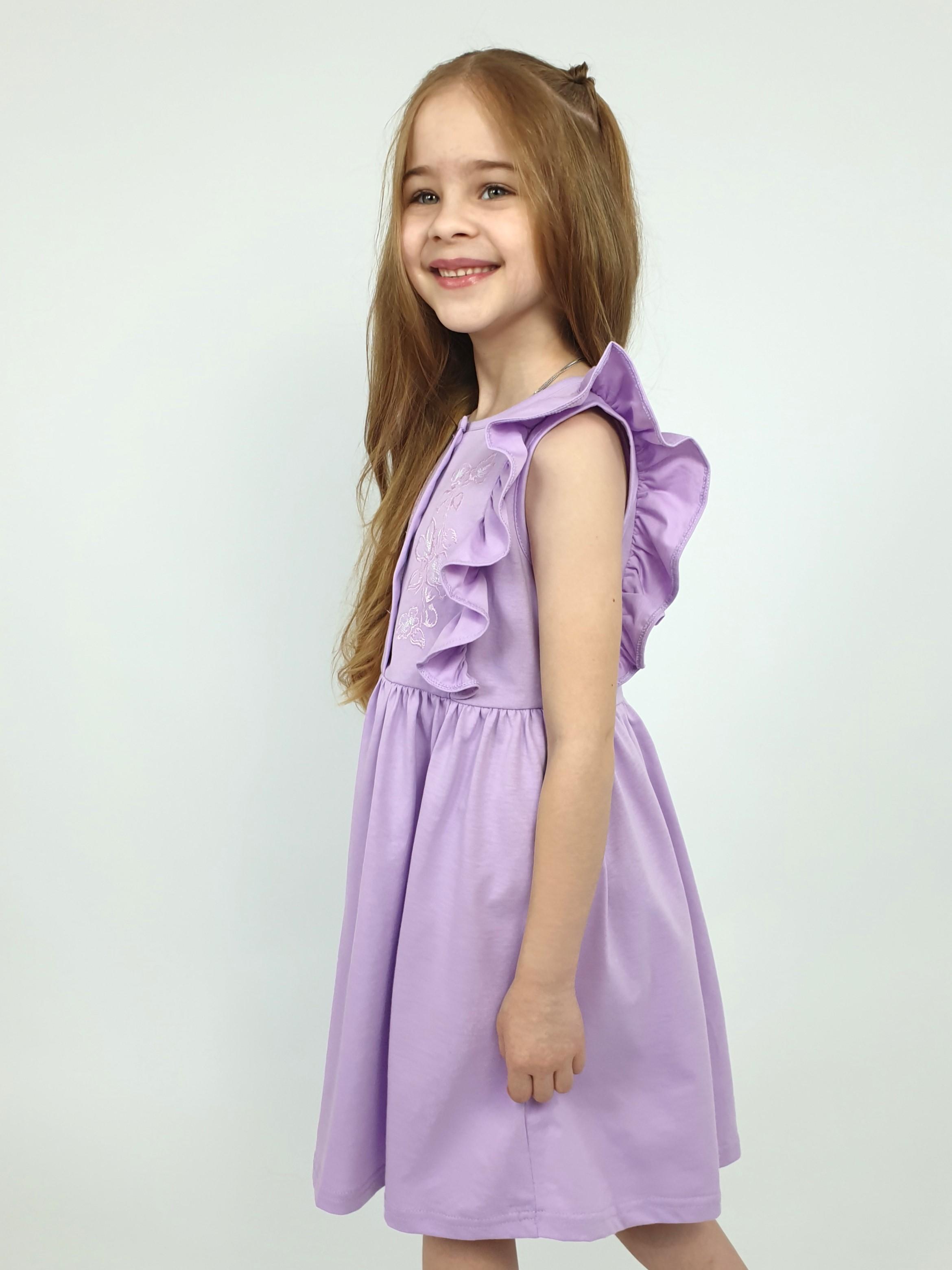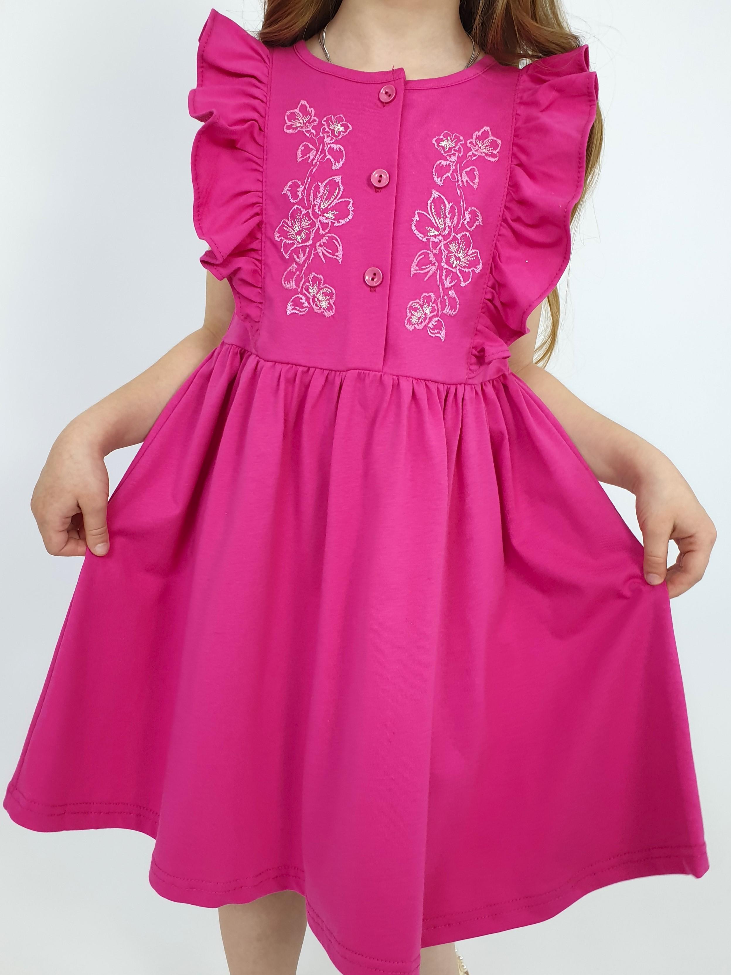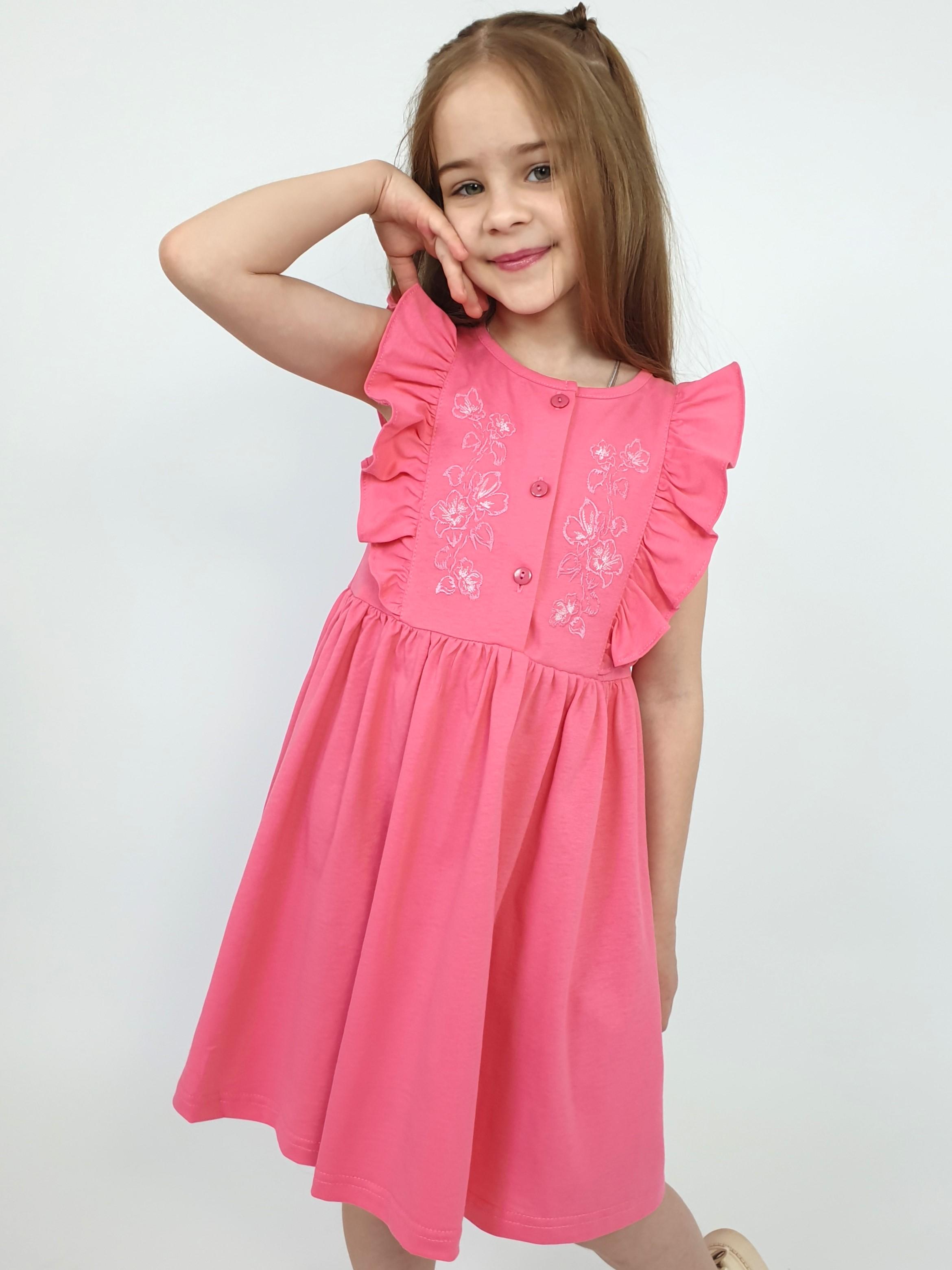 Летнее платье для девочки выполнено из качественного кулирного полотна ( 100% хлопок). Модель полуприлегающего силуэта ,декорирована оригинальным принтом с вышивкой и рюшами . Застёжка по центру на пуговицы.Такое платье идеально подойдёт как на каждый день, так и при особых случаях. Материал легкий, приятный на ощупь, устойчивый к частым стиркам.