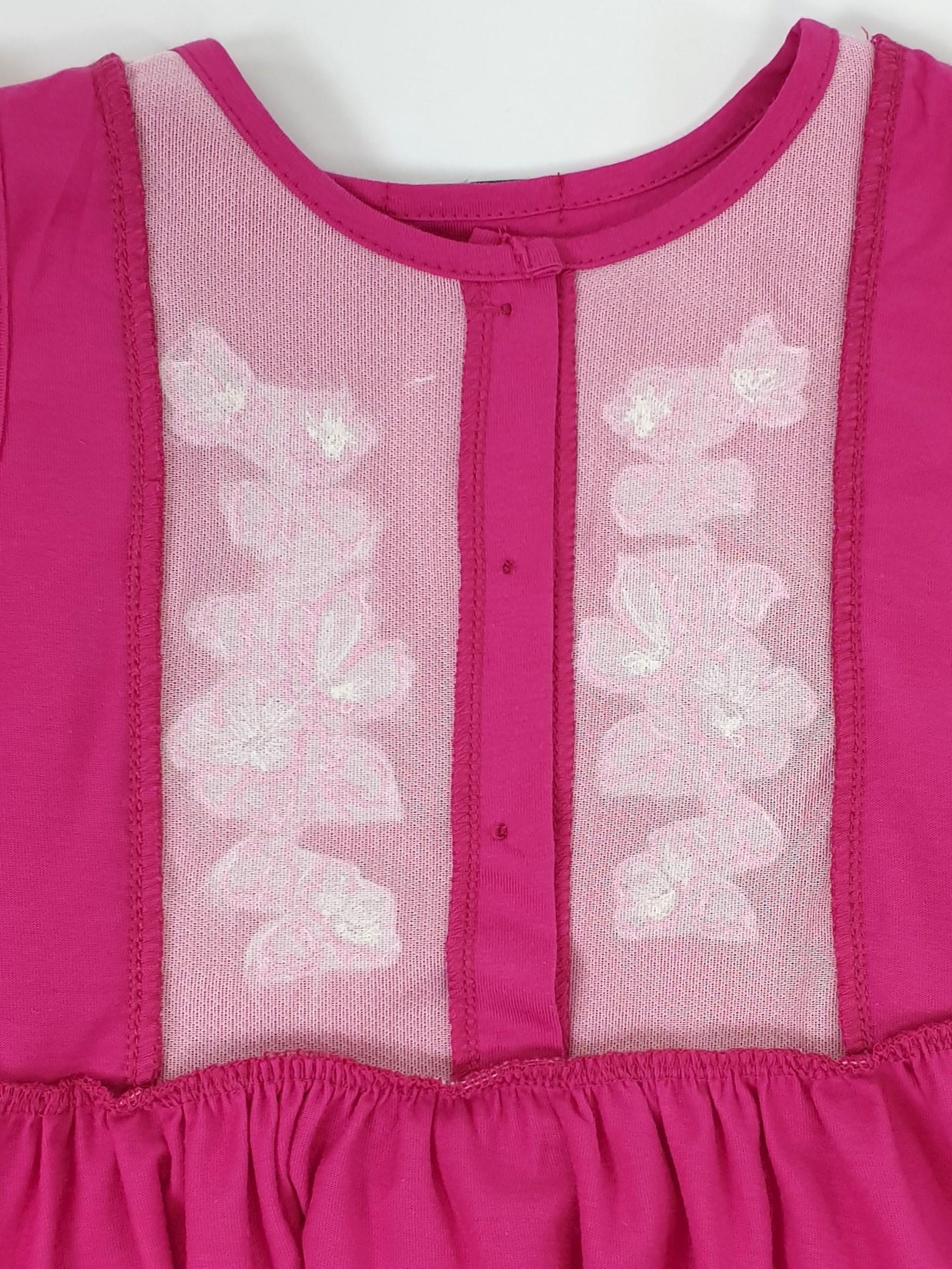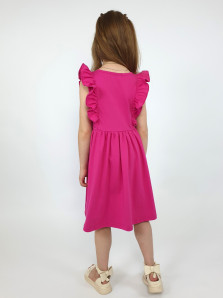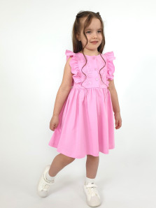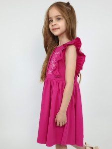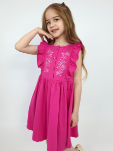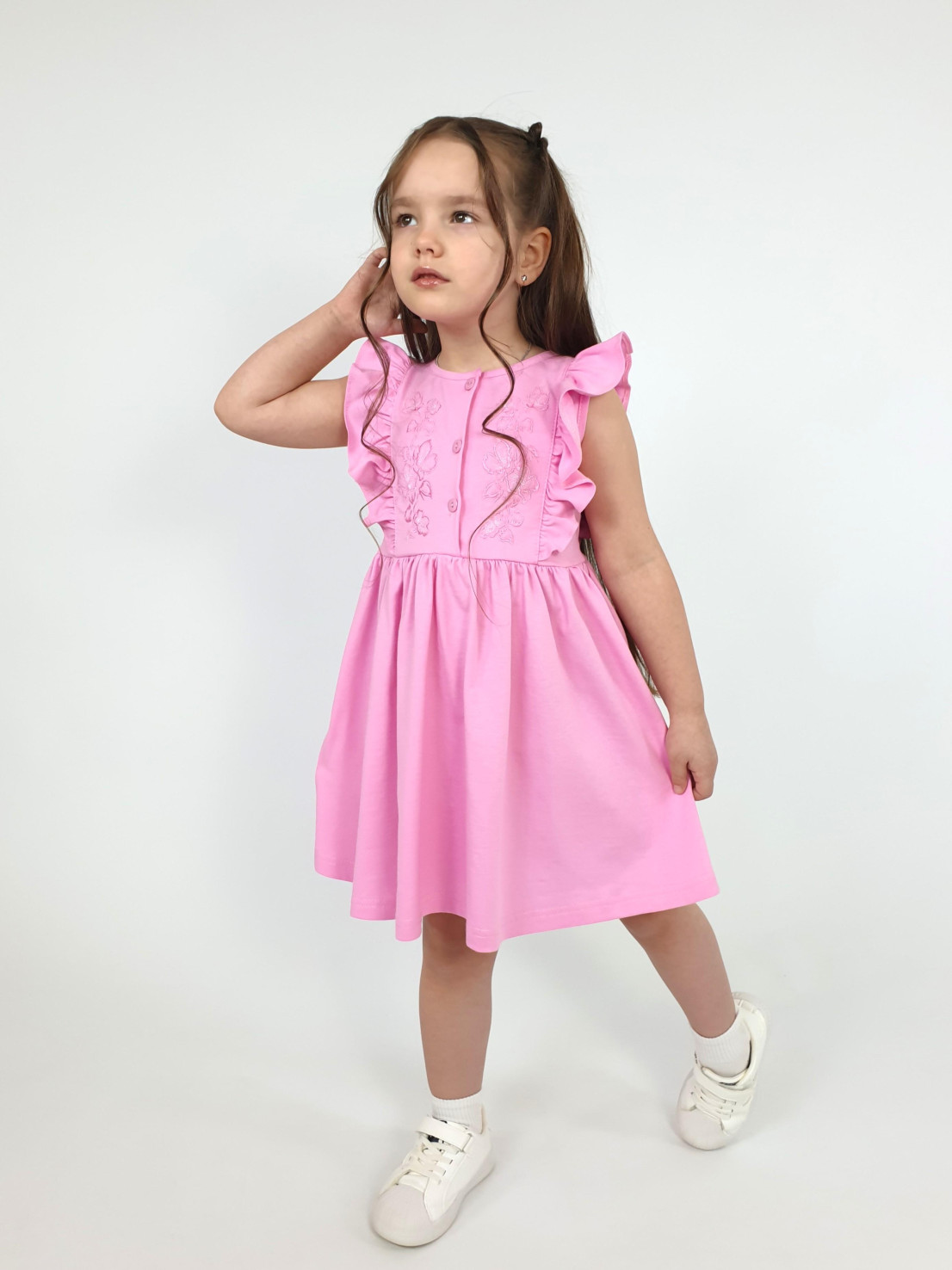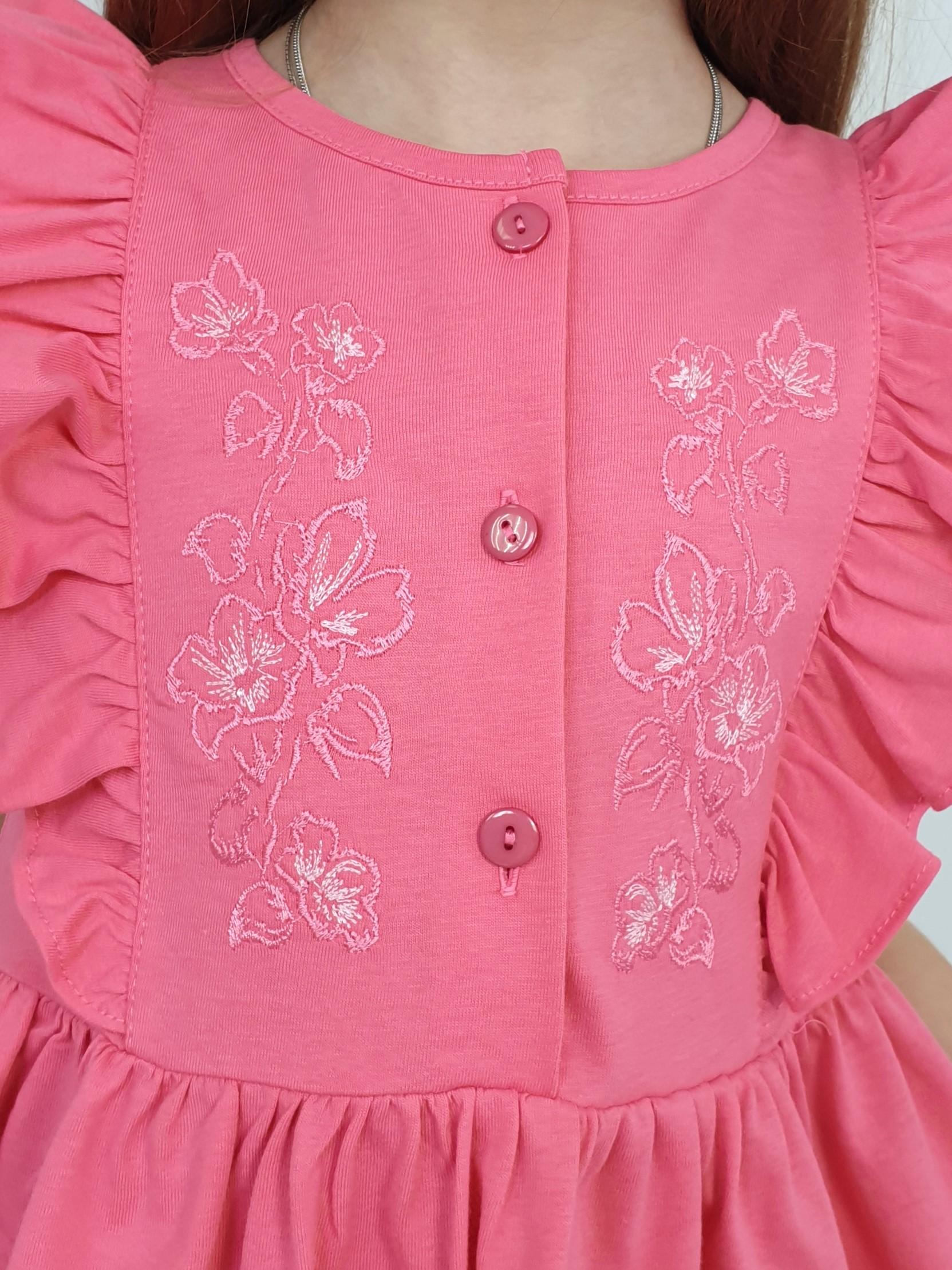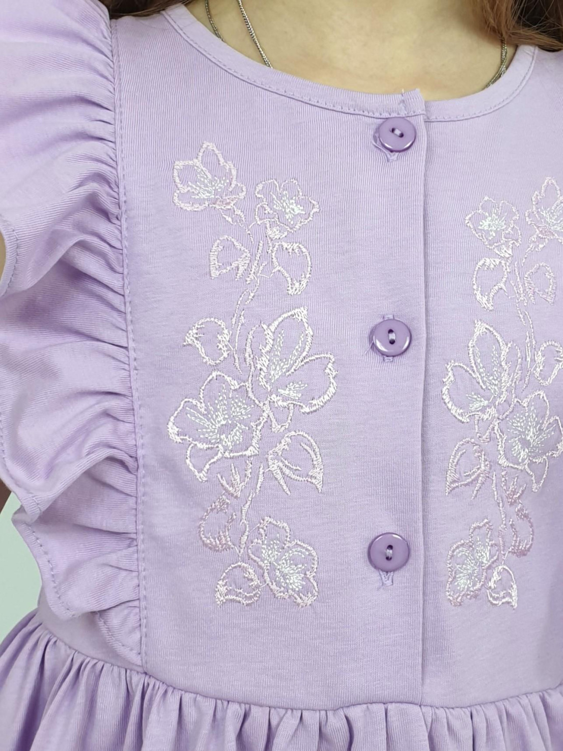 Летнее платье для девочки выполнено из качественного кулирного полотна ( 100% хлопок). Модель полуприлегающего силуэта ,декорирована оригинальным принтом с вышивкой и рюшами . Застёжка по центру на пуговицы.Такое платье идеально подойдёт как на каждый день, так и при особых случаях. Материал легкий, приятный на ощупь, устойчивый к частым стиркам.