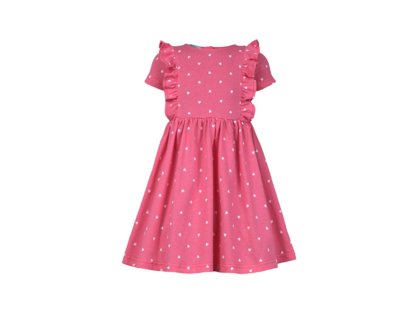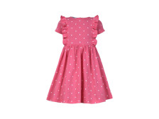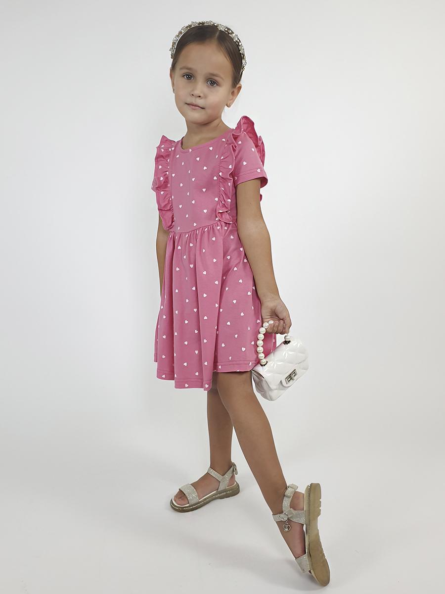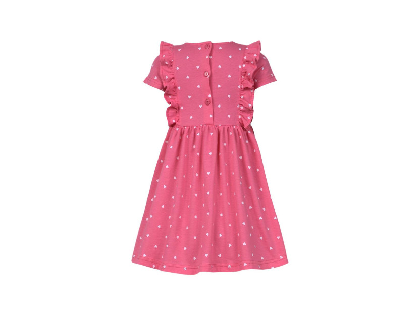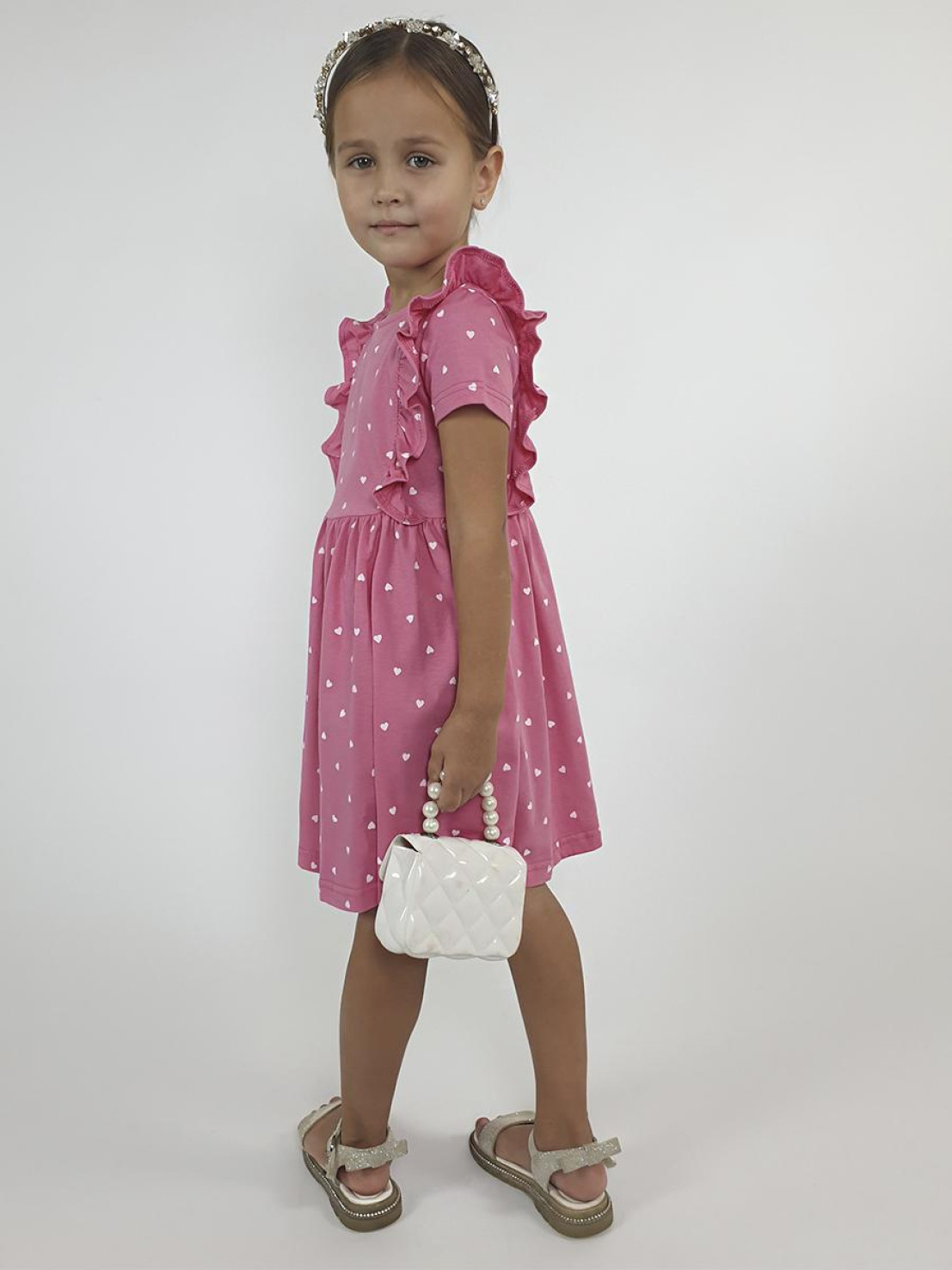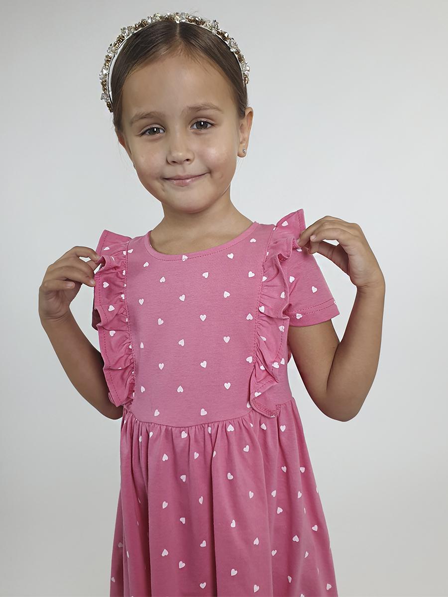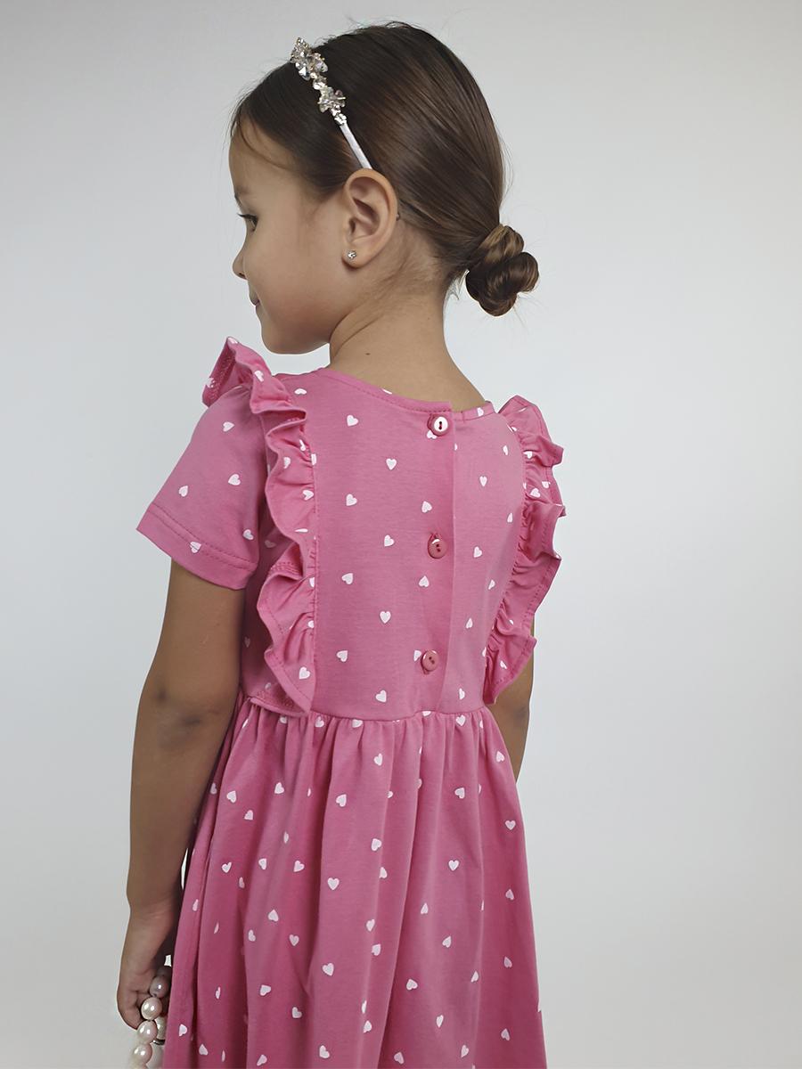 Кулирное полотно:100% х/б. Платье- полуприлегающего силуэта,короткий рукав. Отрезная юбка со сборкой, рельефы с рюшей. Горловина окантована и подшита. Застежка сзади на пуговицы.