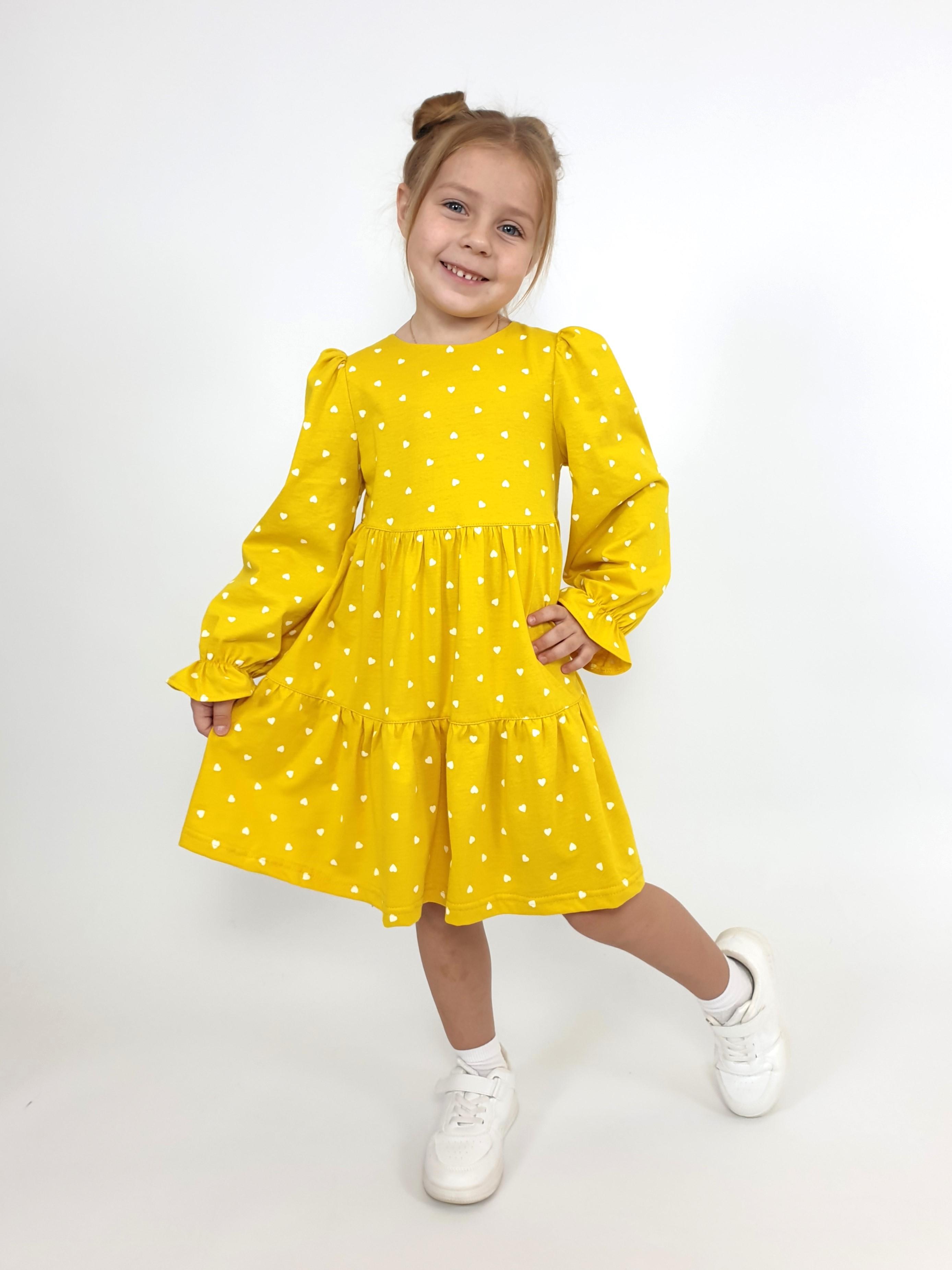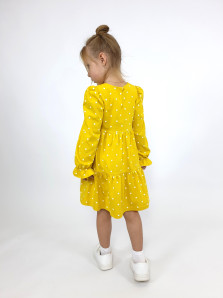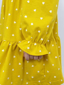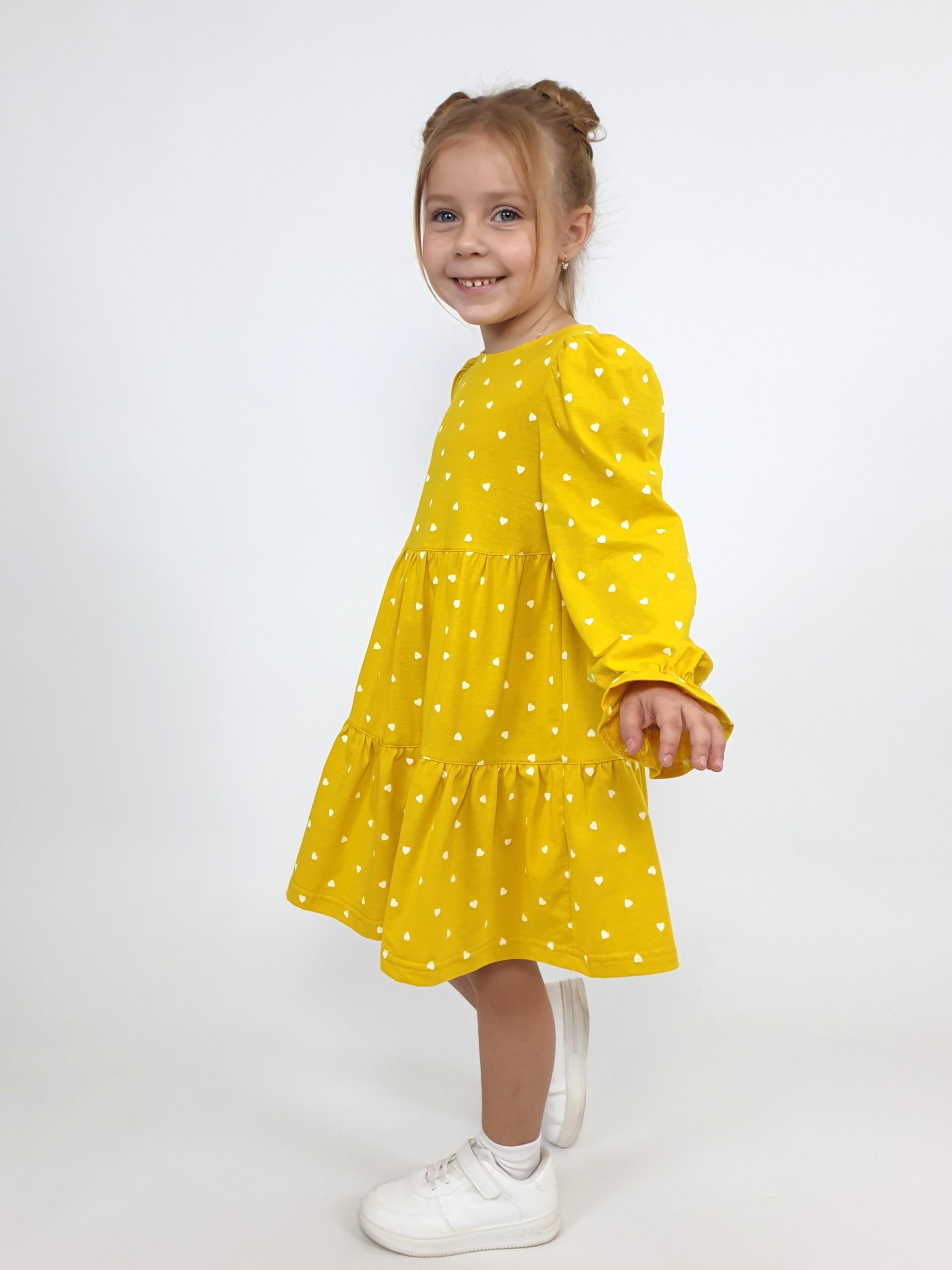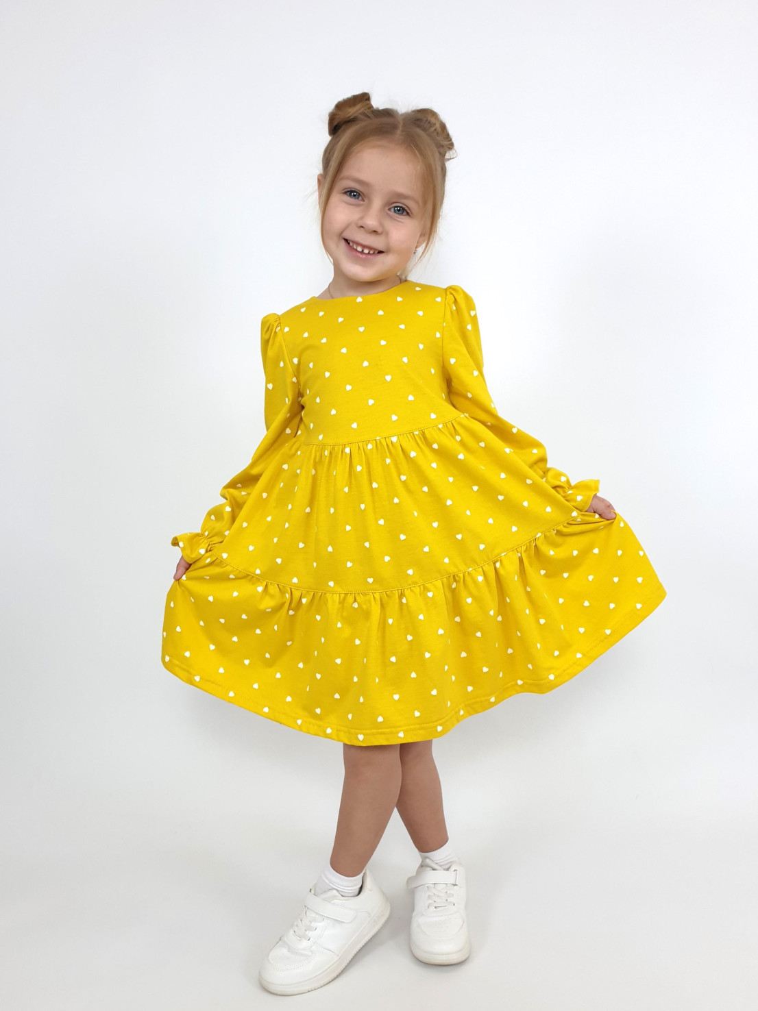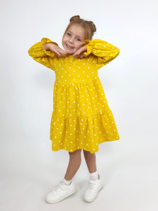 Кулирное полотно:100% х/б. Платье-силуэт трапеция,длинный втачной рукав сборка по окату,внизу собран на резинку.Юбка переда и спинки из двух воланов.Горловина обработана обтачкой,застежка на пуговицу по спинке.