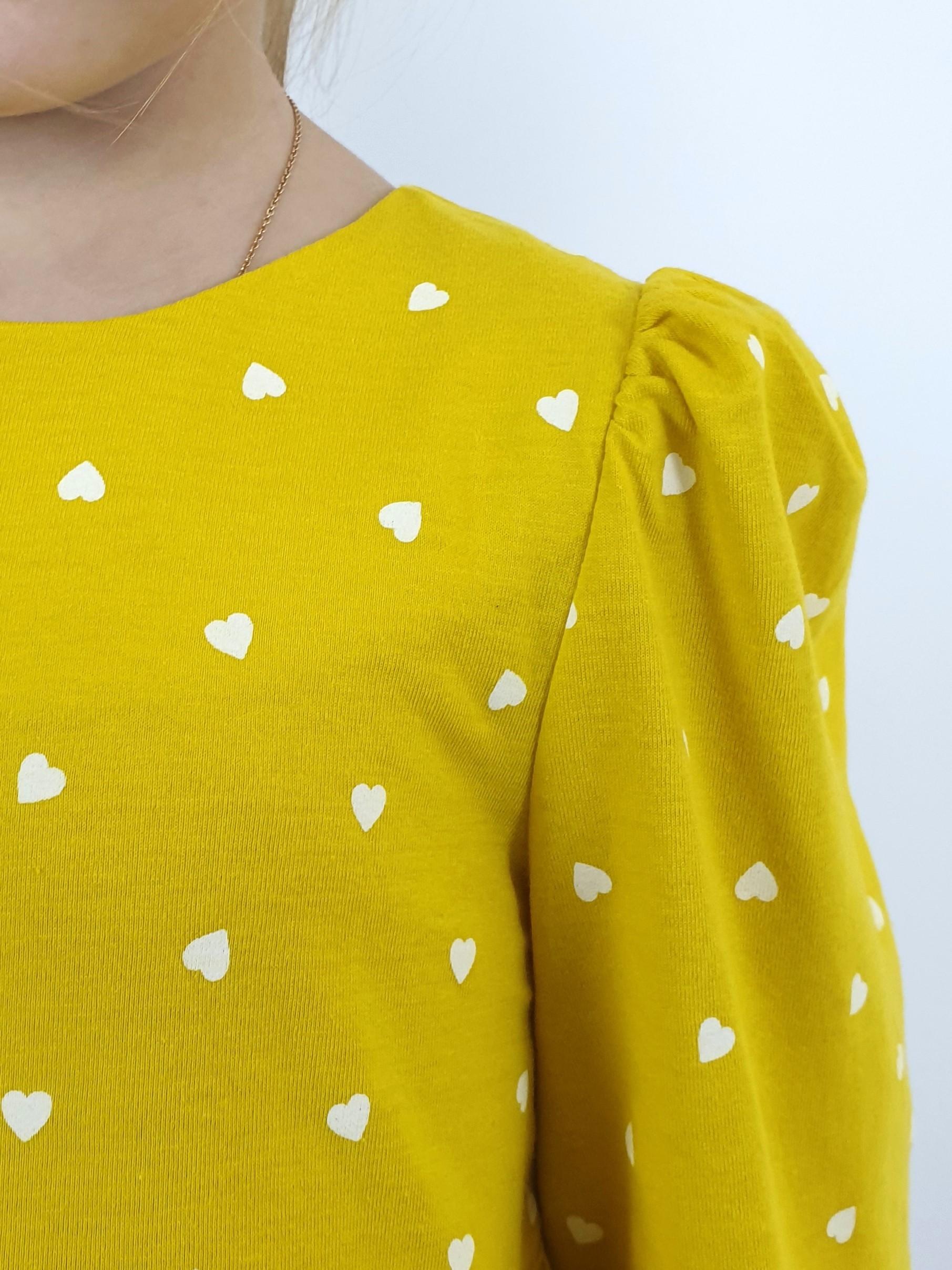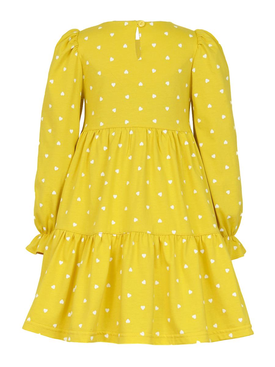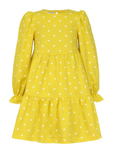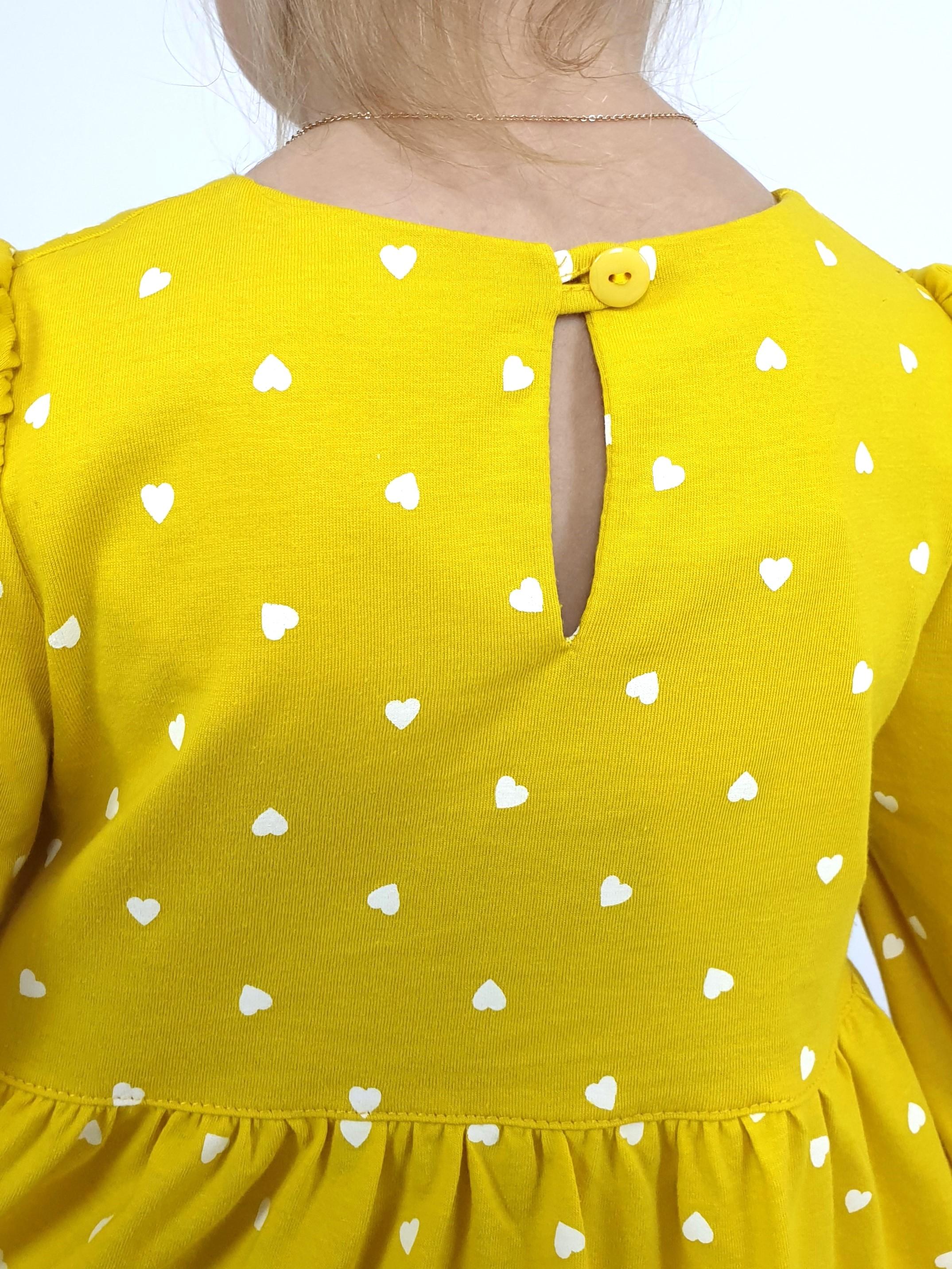 Кулирное полотно:100% х/б. Платье-силуэт трапеция,длинный втачной рукав сборка по окату,внизу собран на резинку.Юбка переда и спинки из двух воланов.Горловина обработана обтачкой,застежка на пуговицу по спинке.