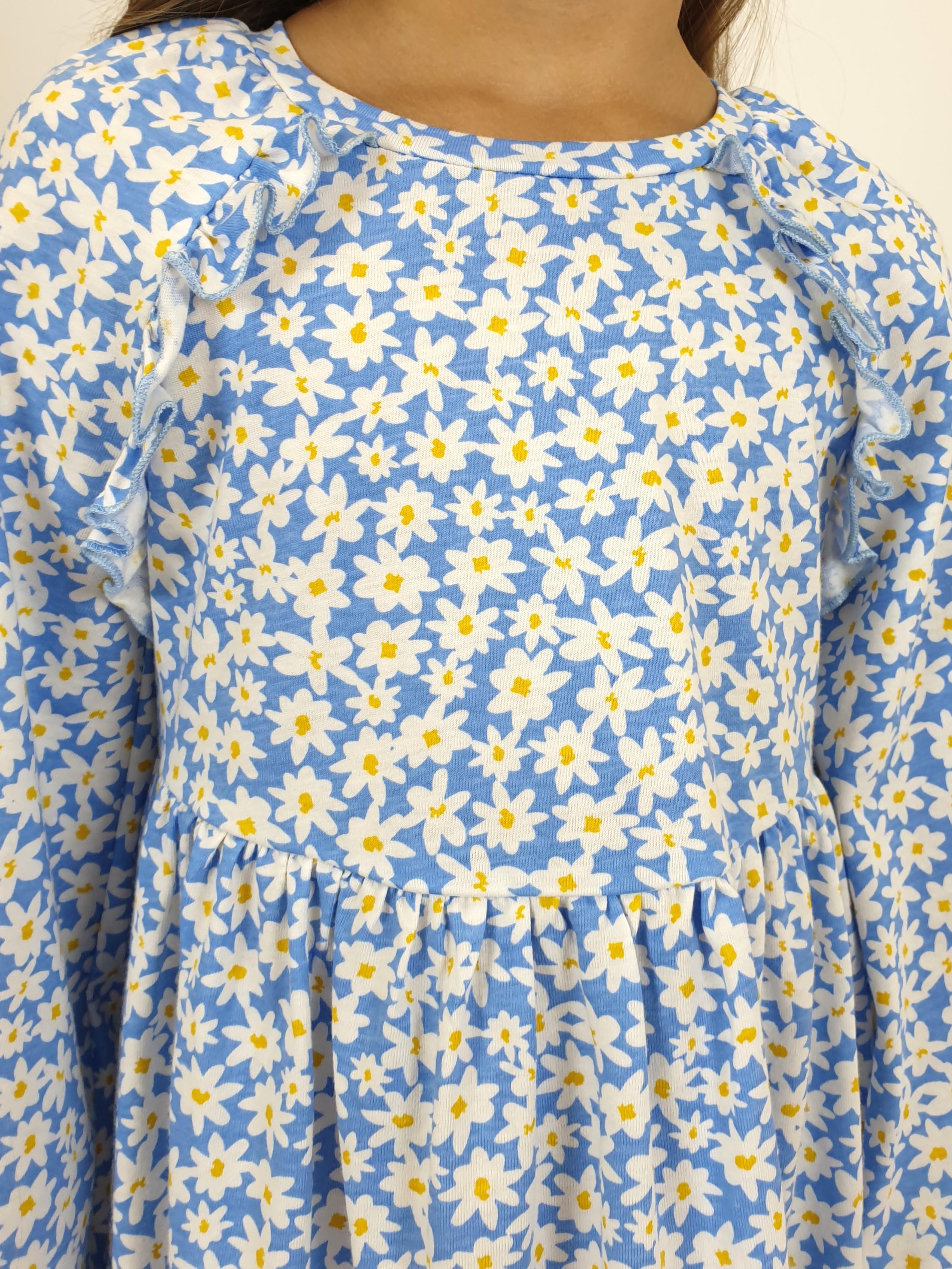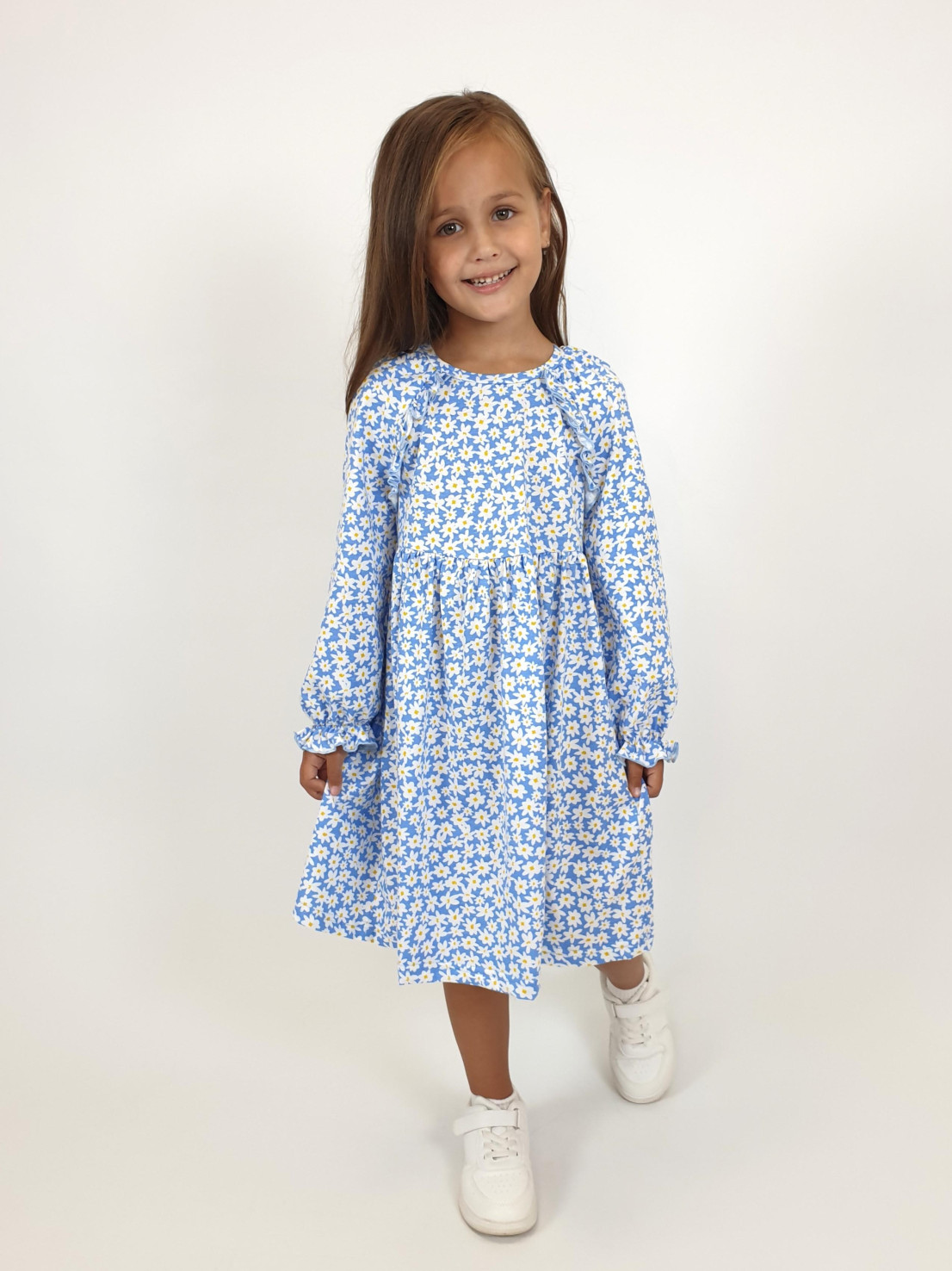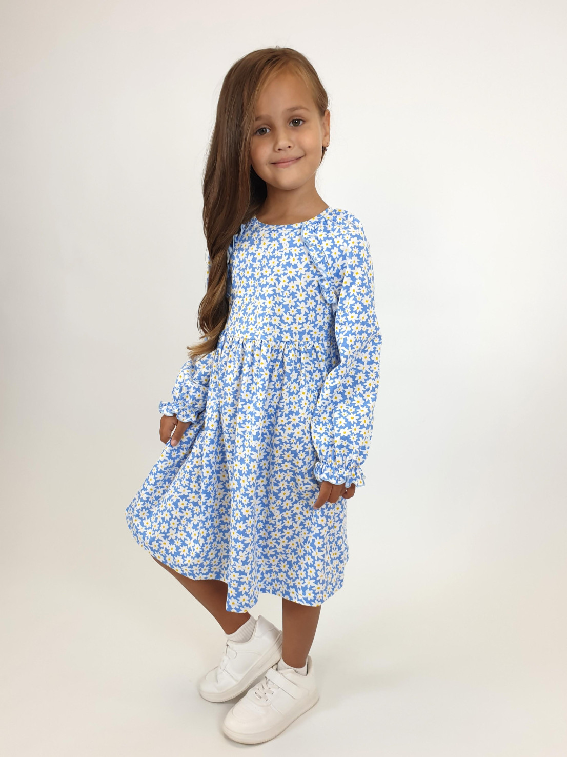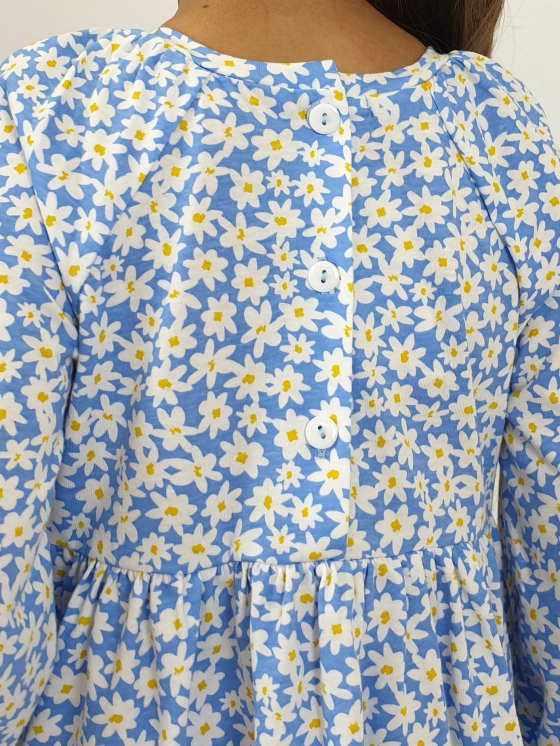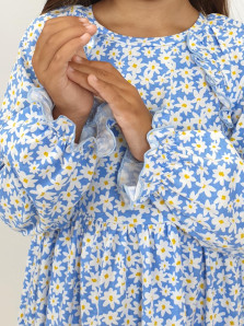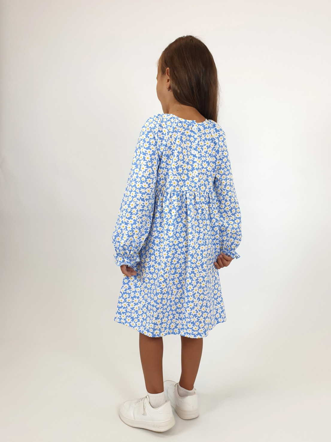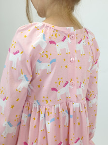Кулирное полотно:100% х/б. Платье-отрезная юбка со сборкой.Длинный рукав реглан,собран внизу на резинку.В пройме рюша на переде.Горловина обработана планкой,застежка по спинке на пуговицы.