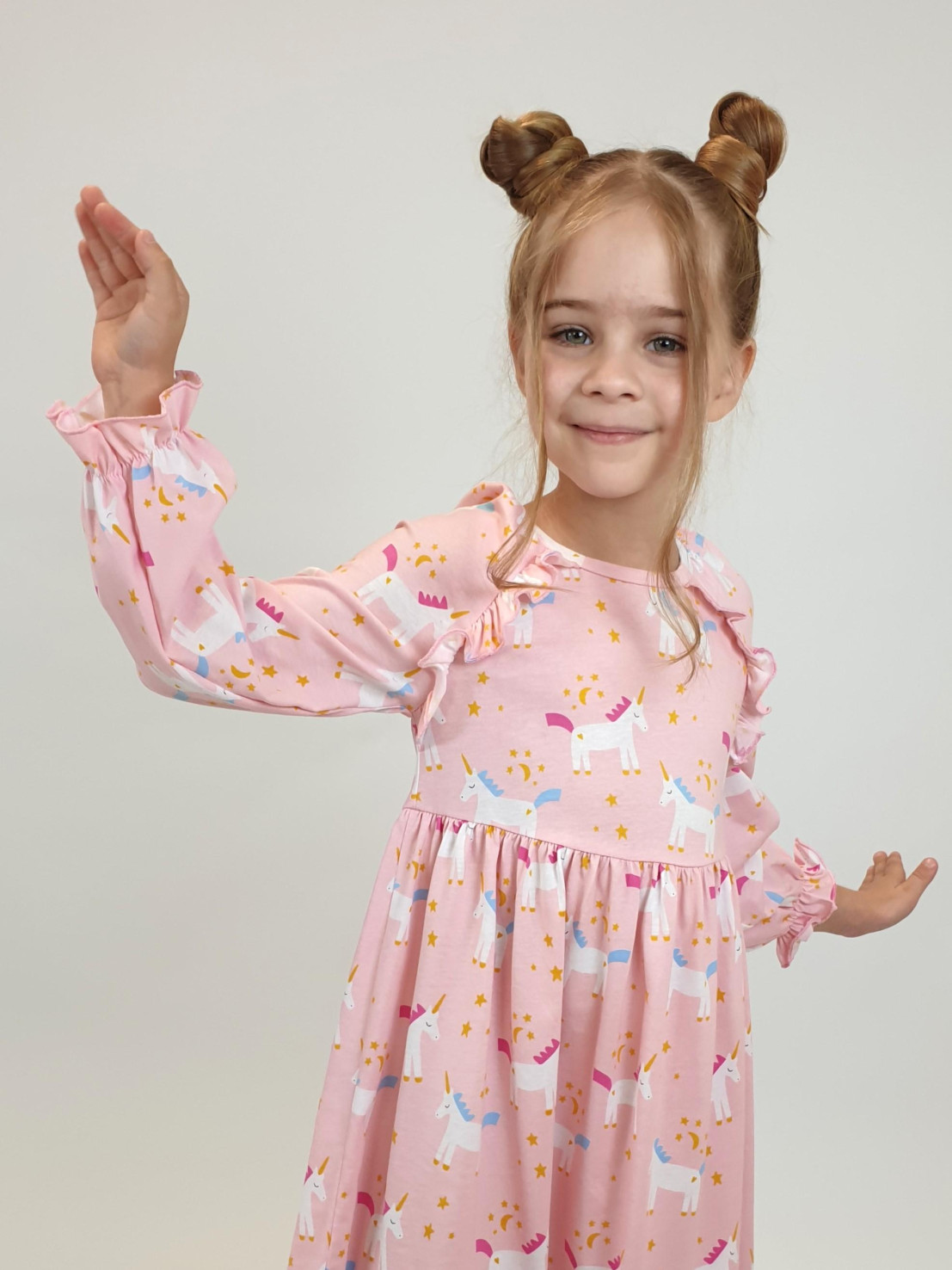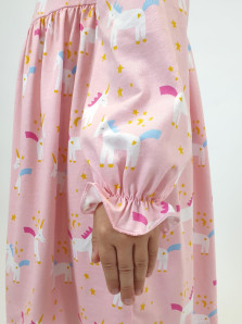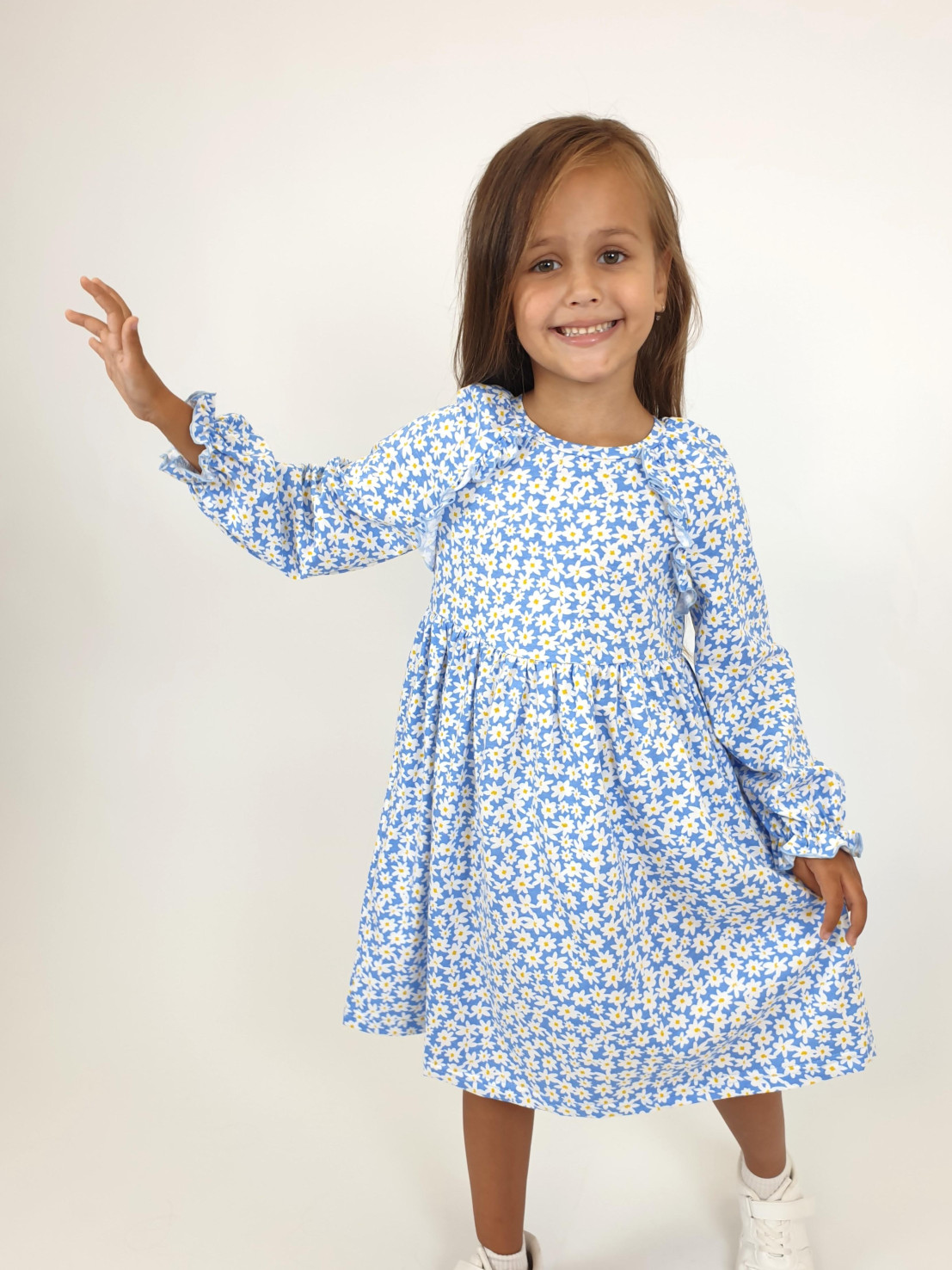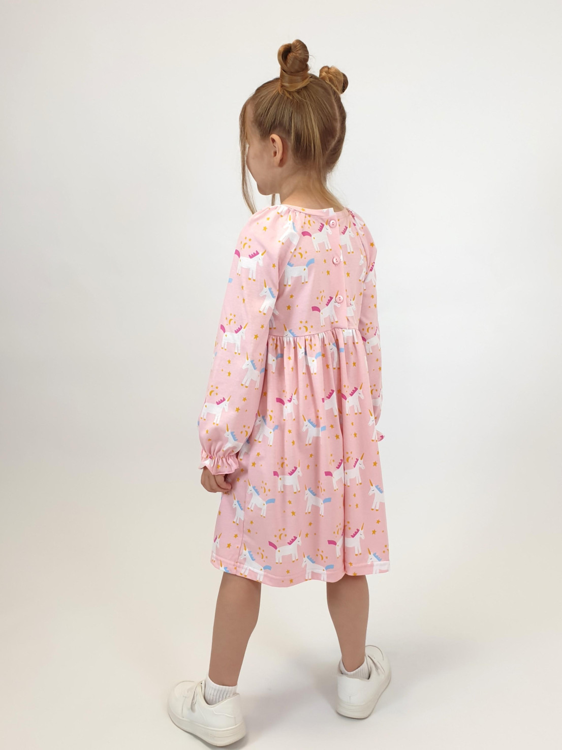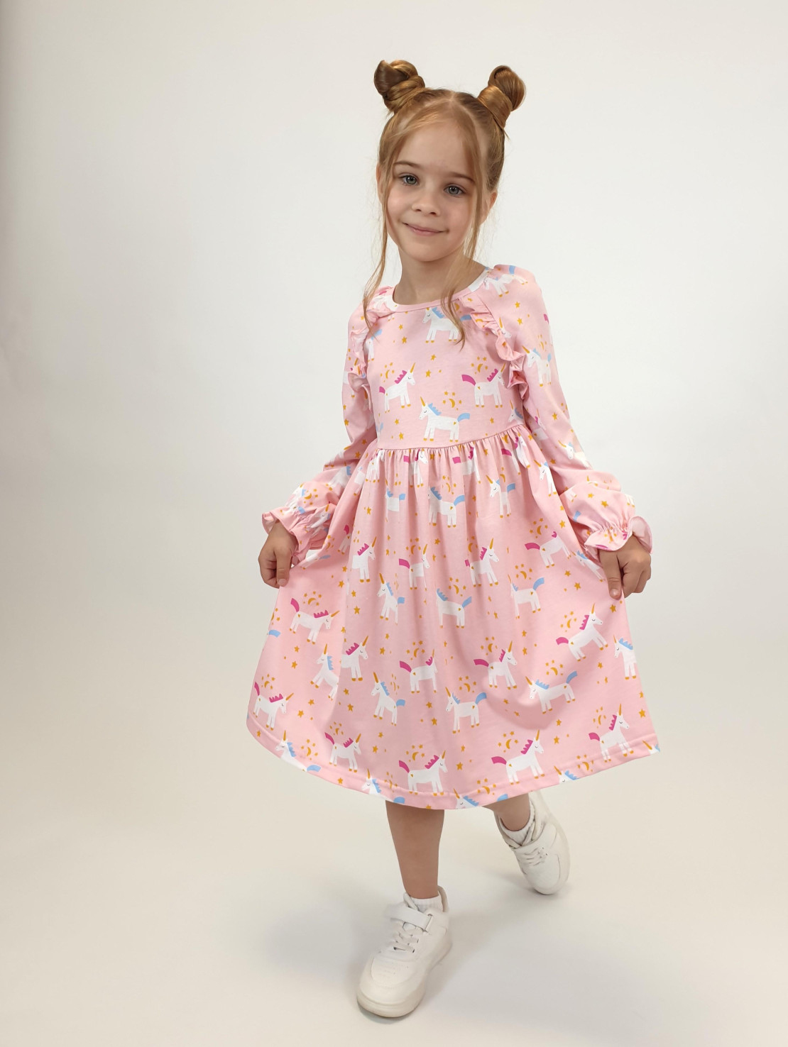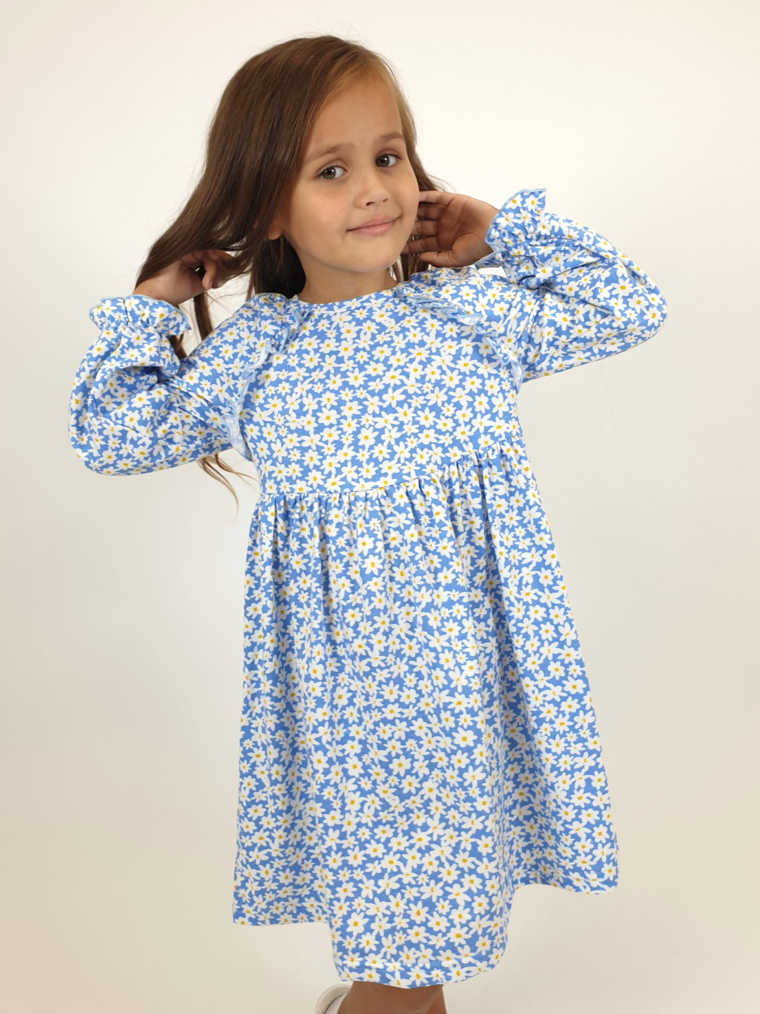 Кулирное полотно:100% х/б. Платье-отрезная юбка со сборкой.Длинный рукав реглан,собран внизу на резинку.В пройме рюша на переде.Горловина обработана планкой,застежка по спинке на пуговицы.