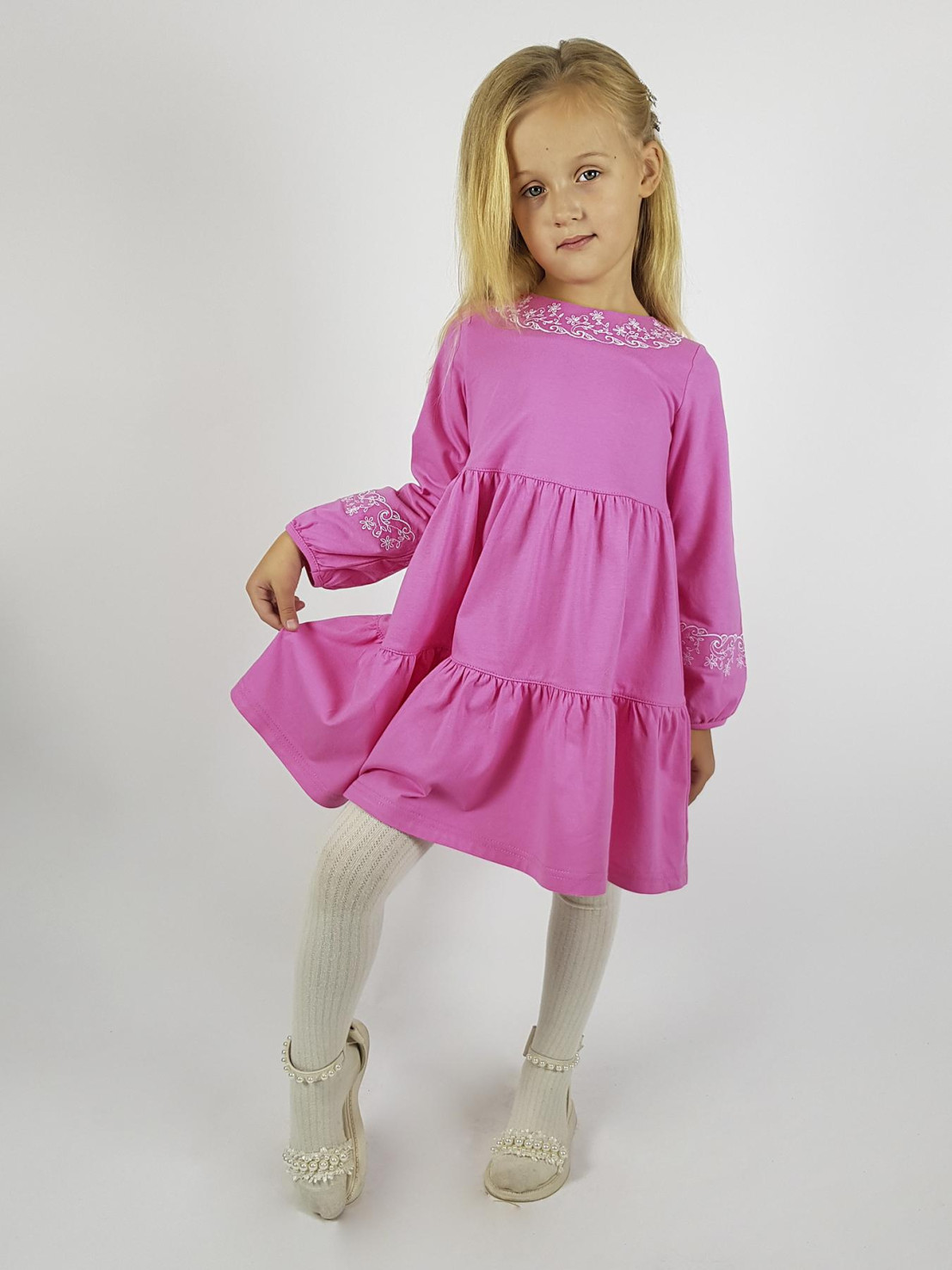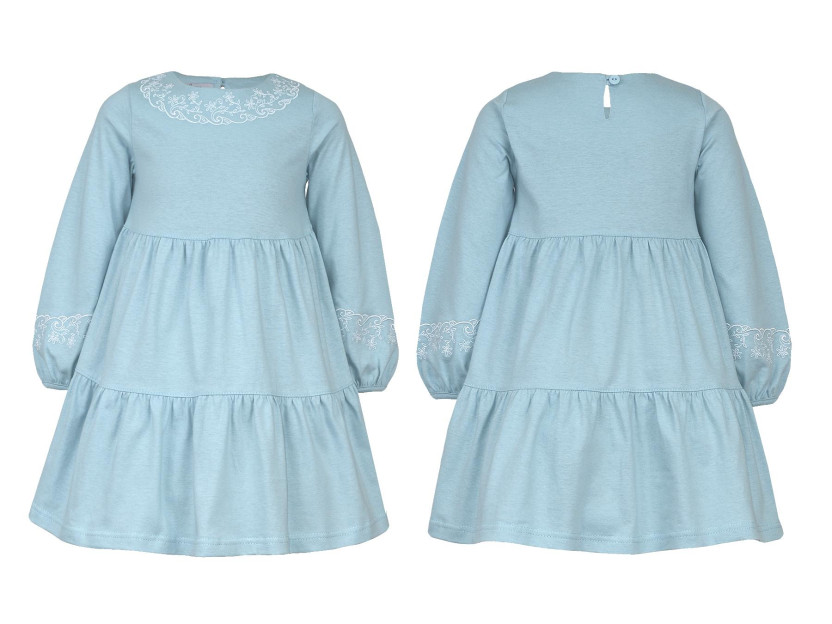 Кулирное полотно:100%х/б. Платье-силуэт трапеция, длинный втачной рукав с вышивкой, низ окантован. Кокетка переда с вышивкой, застежка по кокетке спинки на пуговицу. Юбка переда и спинки из двух воланов. Горловина обработана обтачкой.