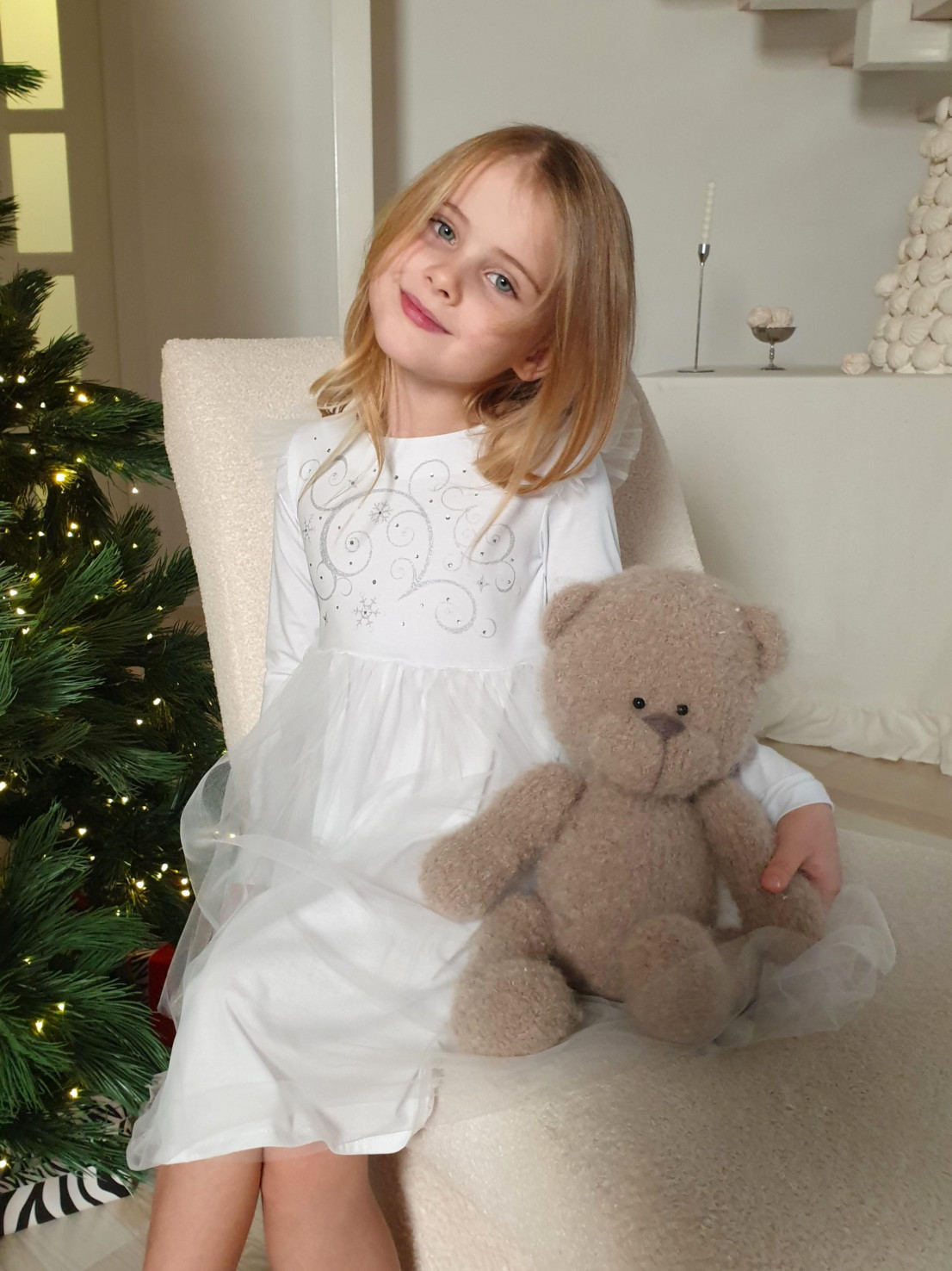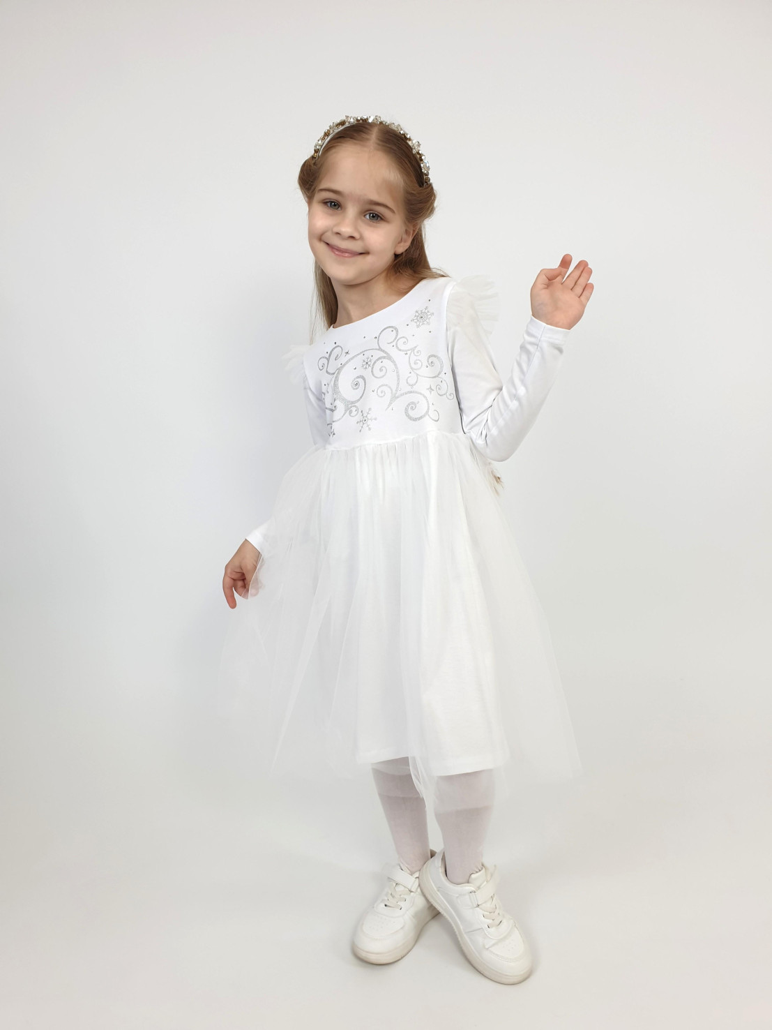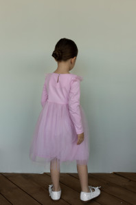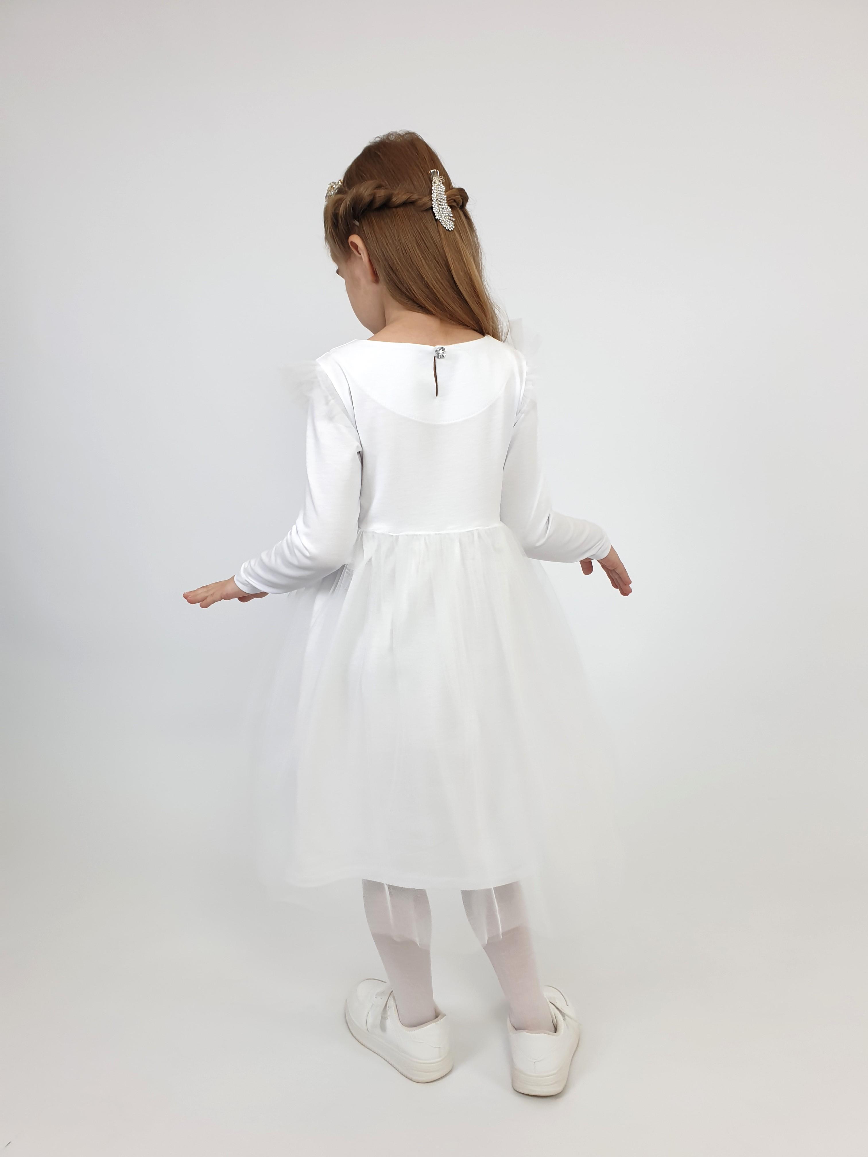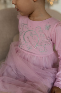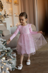 Платье с длинным рукавом выполнено из качественного кулирного полотна (95% хлопок,5% лайкра, сетка 100 % п/э). Модель силуэт трапеция, застёжка по спинке на пуговицу . Оригинальная модель с изящным принтом со стразами, точно понравится юным модницам.