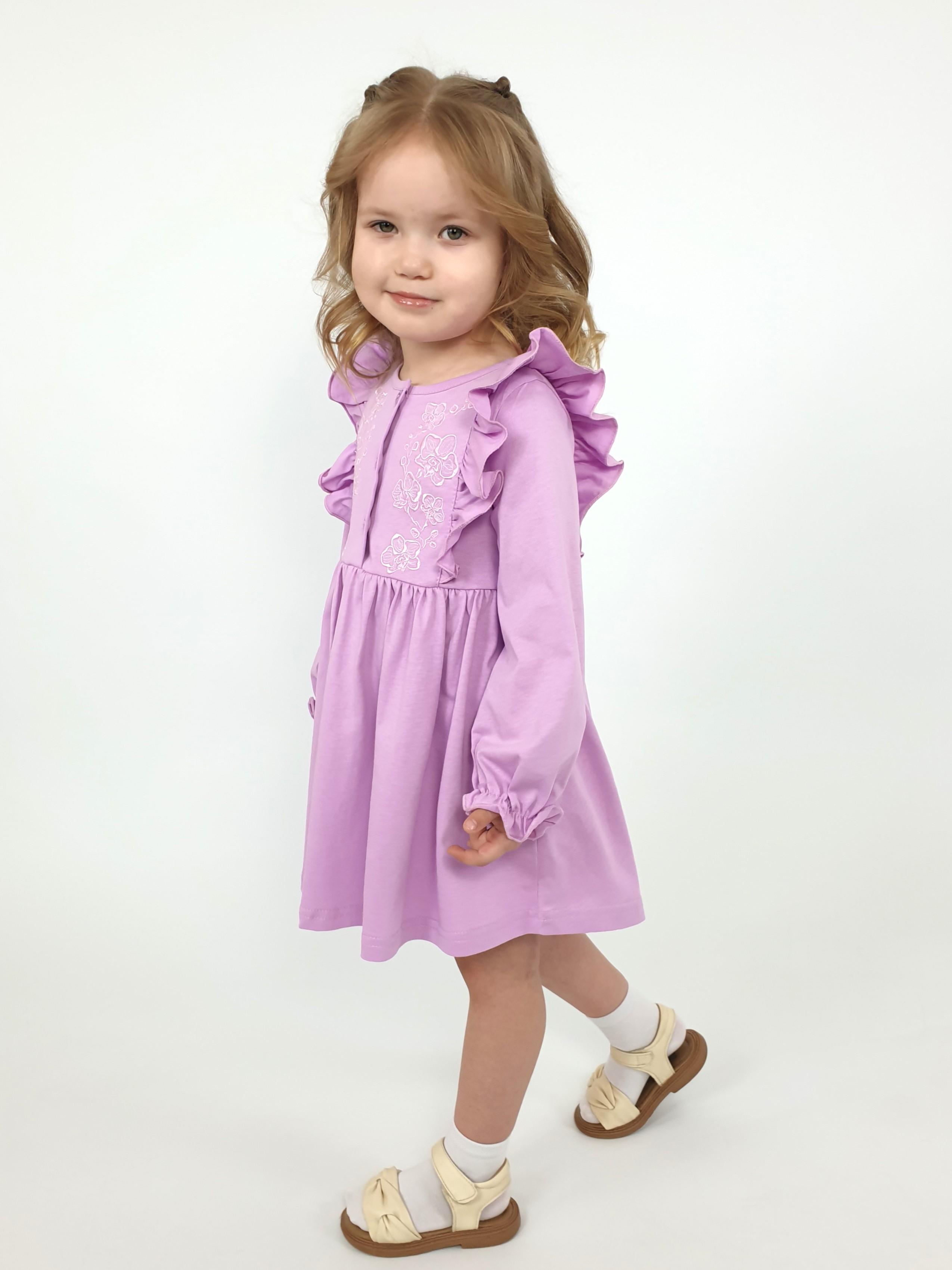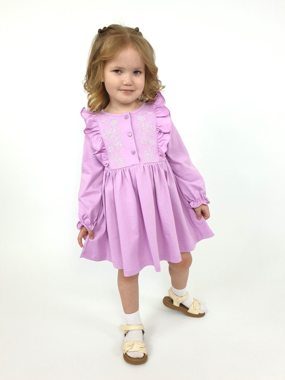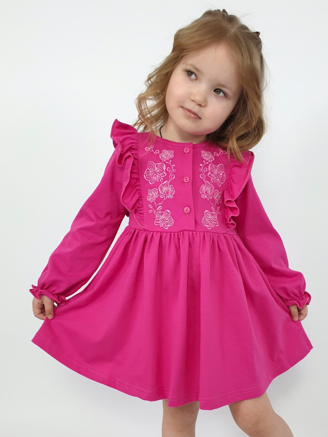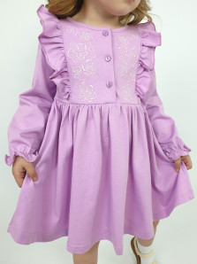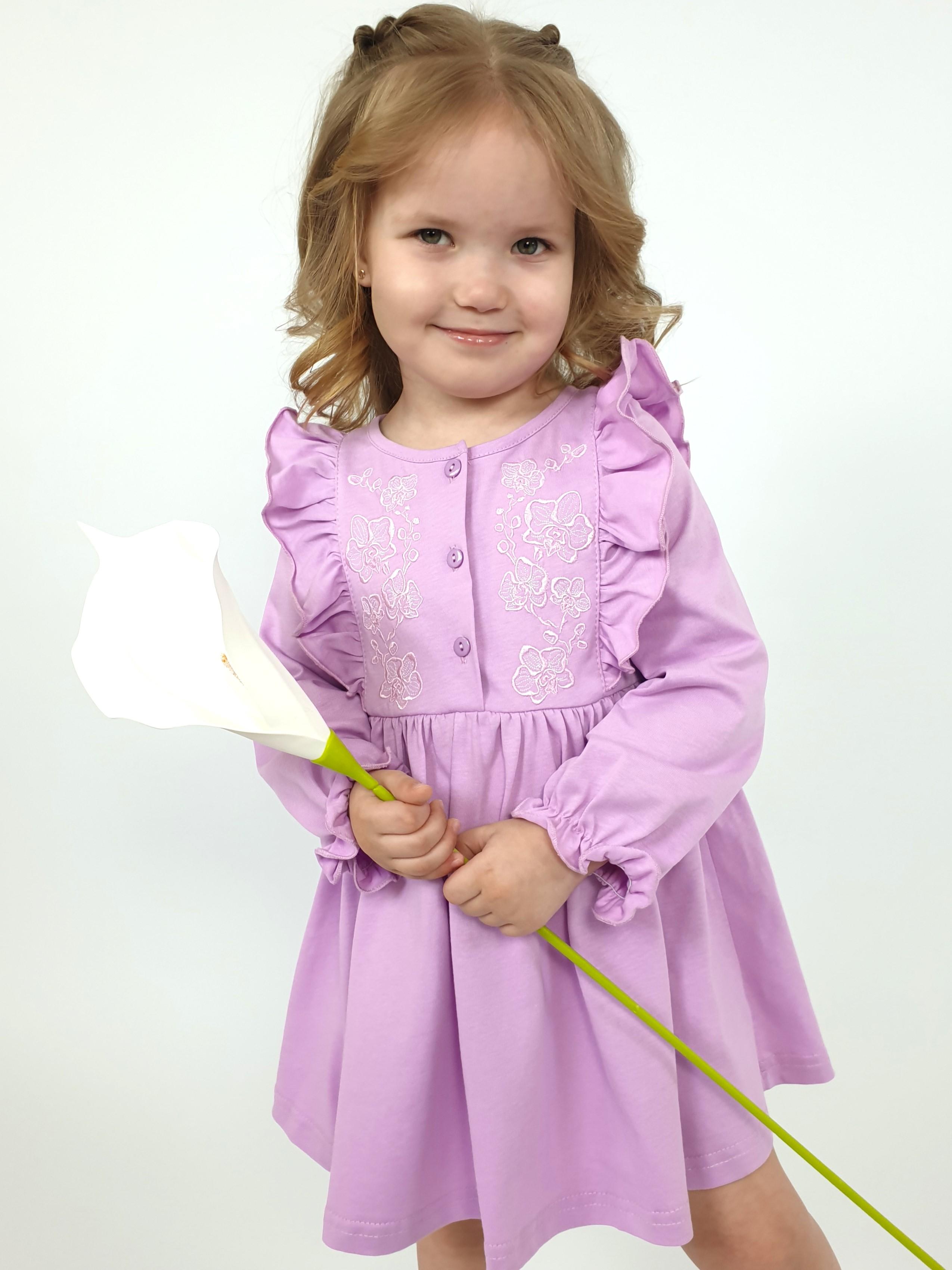 Кулирное полотно:100% х/б. Платье-полуприлегающего силуэта,длинный рукав с резинкой "венгерка" внизу.Отрезная юбка со сборкой.рельефы с рюшей.Вышивка на переде.Горловина окантована.застежка центральная на пуговицы.