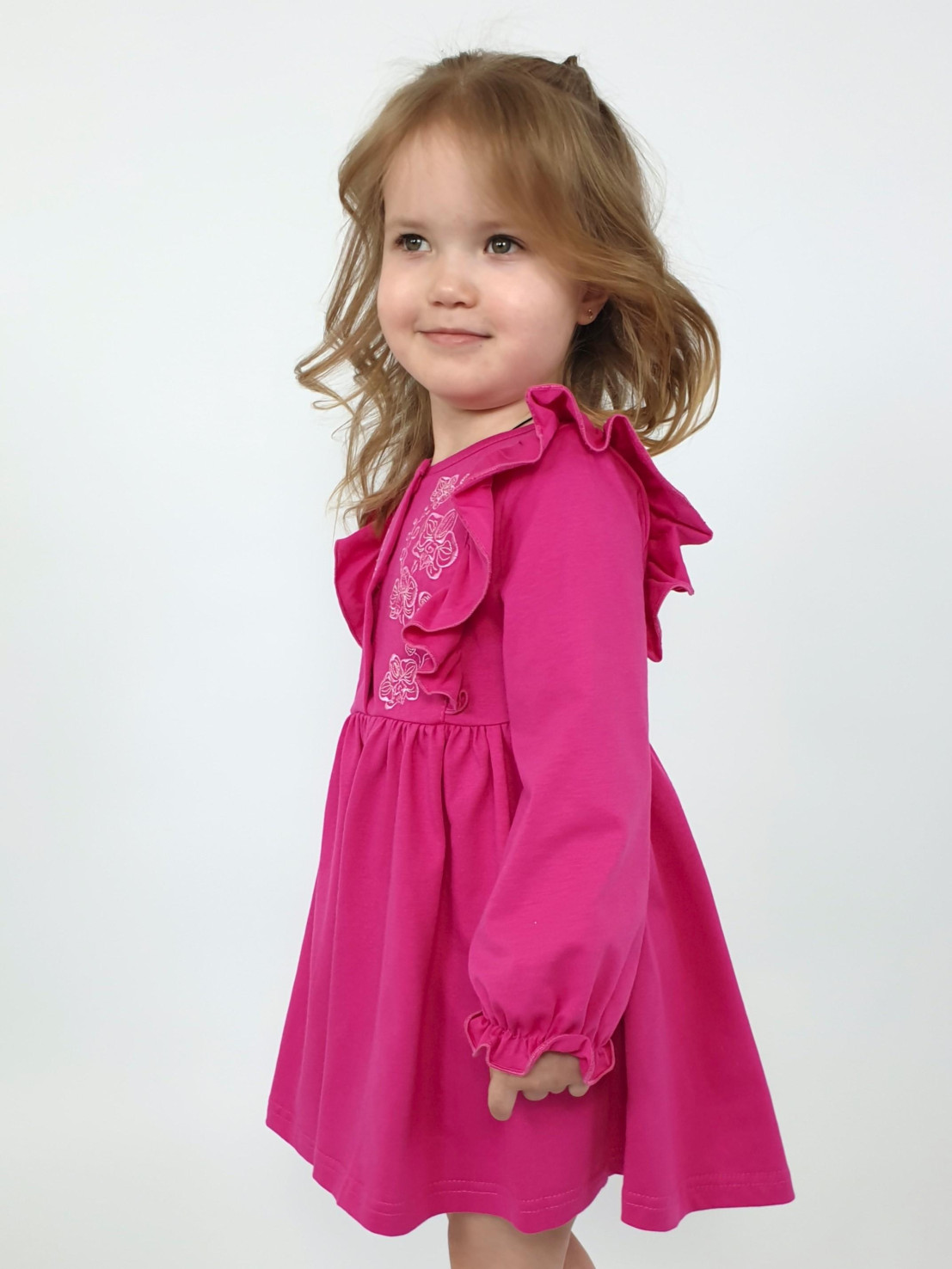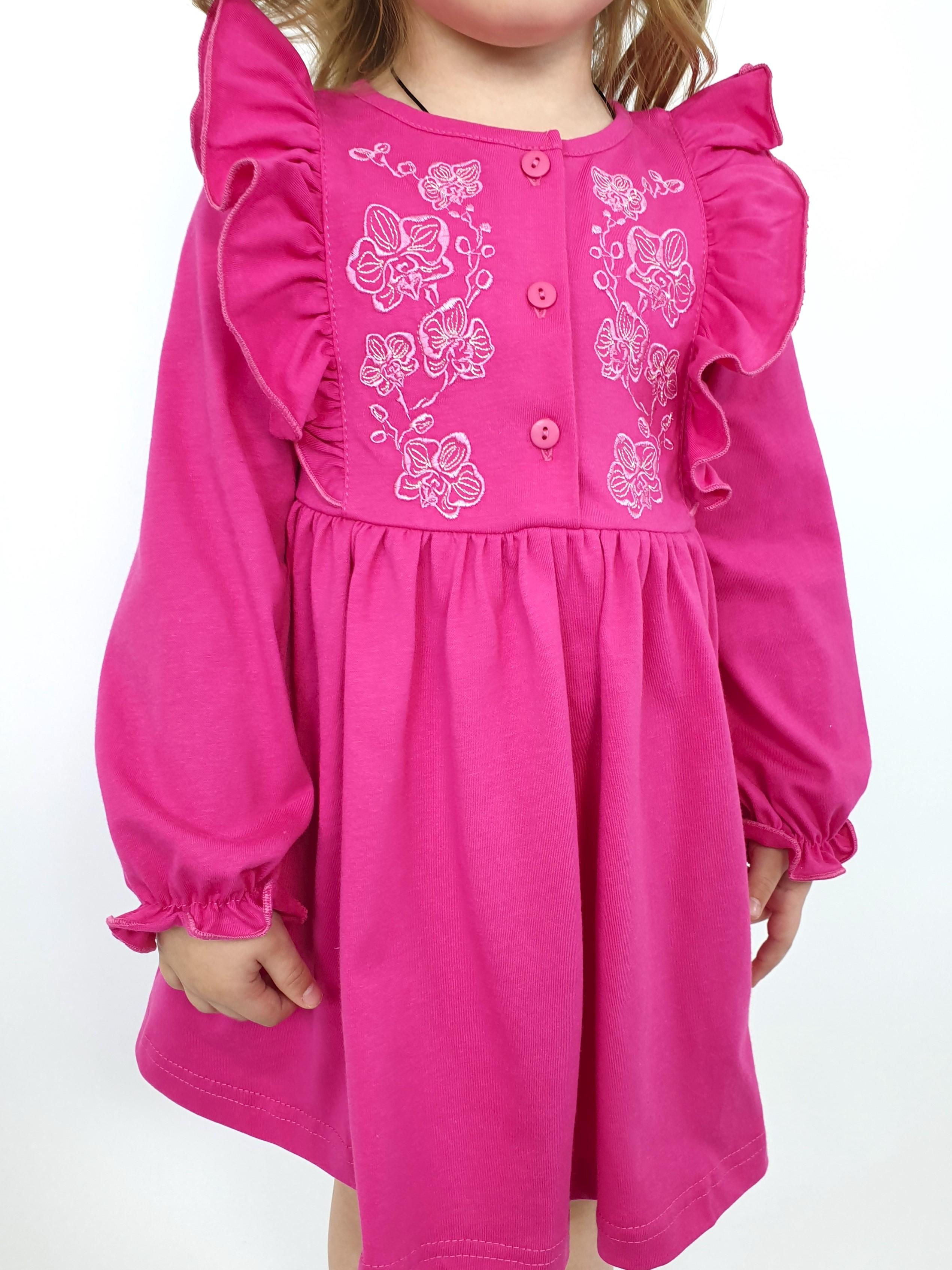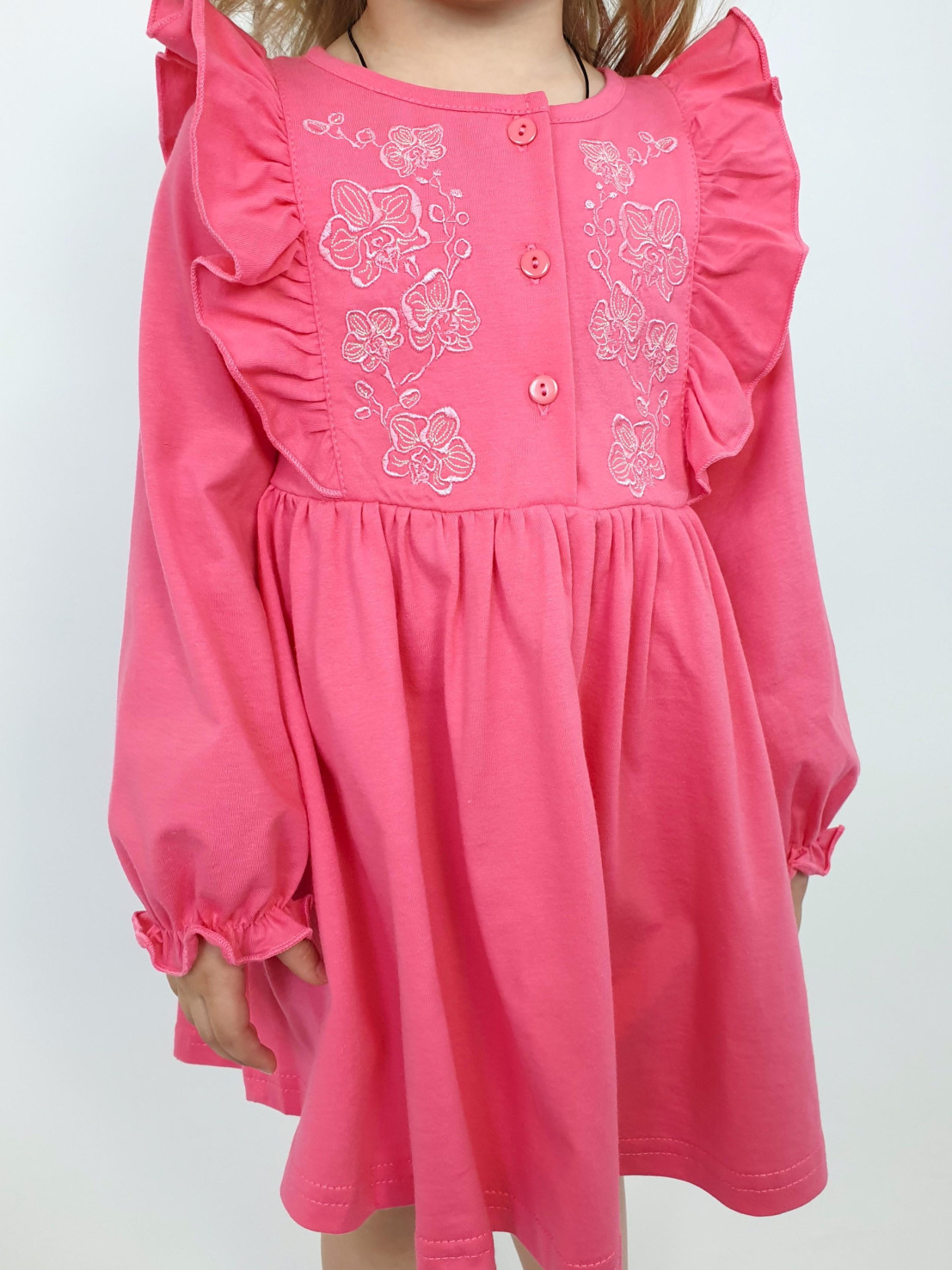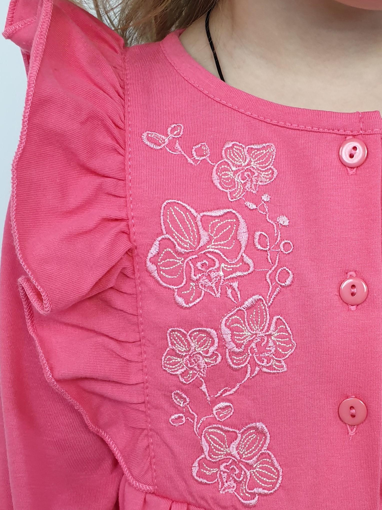 Кулирное полотно:100% х/б. Платье-полуприлегающего силуэта,длинный рукав с резинкой "венгерка" внизу.Отрезная юбка со сборкой.рельефы с рюшей.Вышивка на переде.Горловина окантована.застежка центральная на пуговицы.