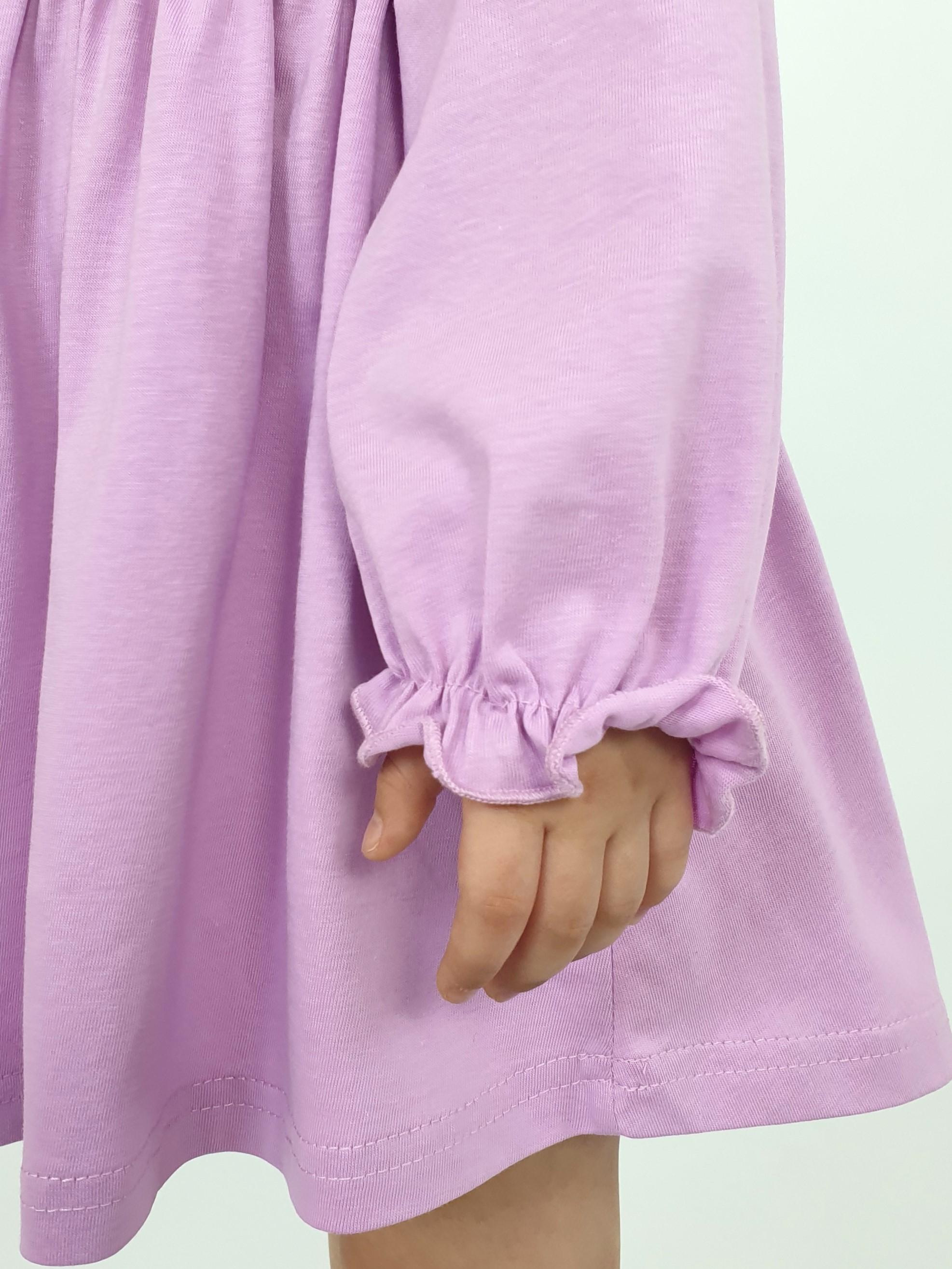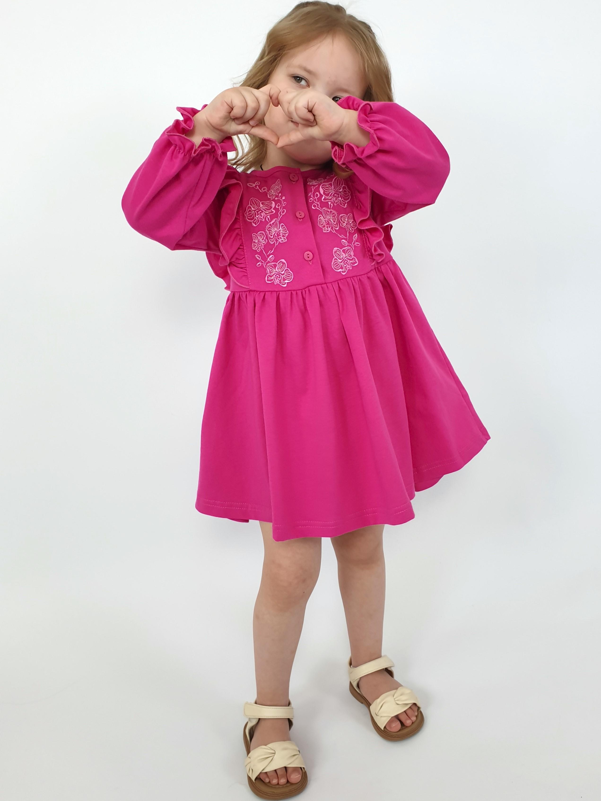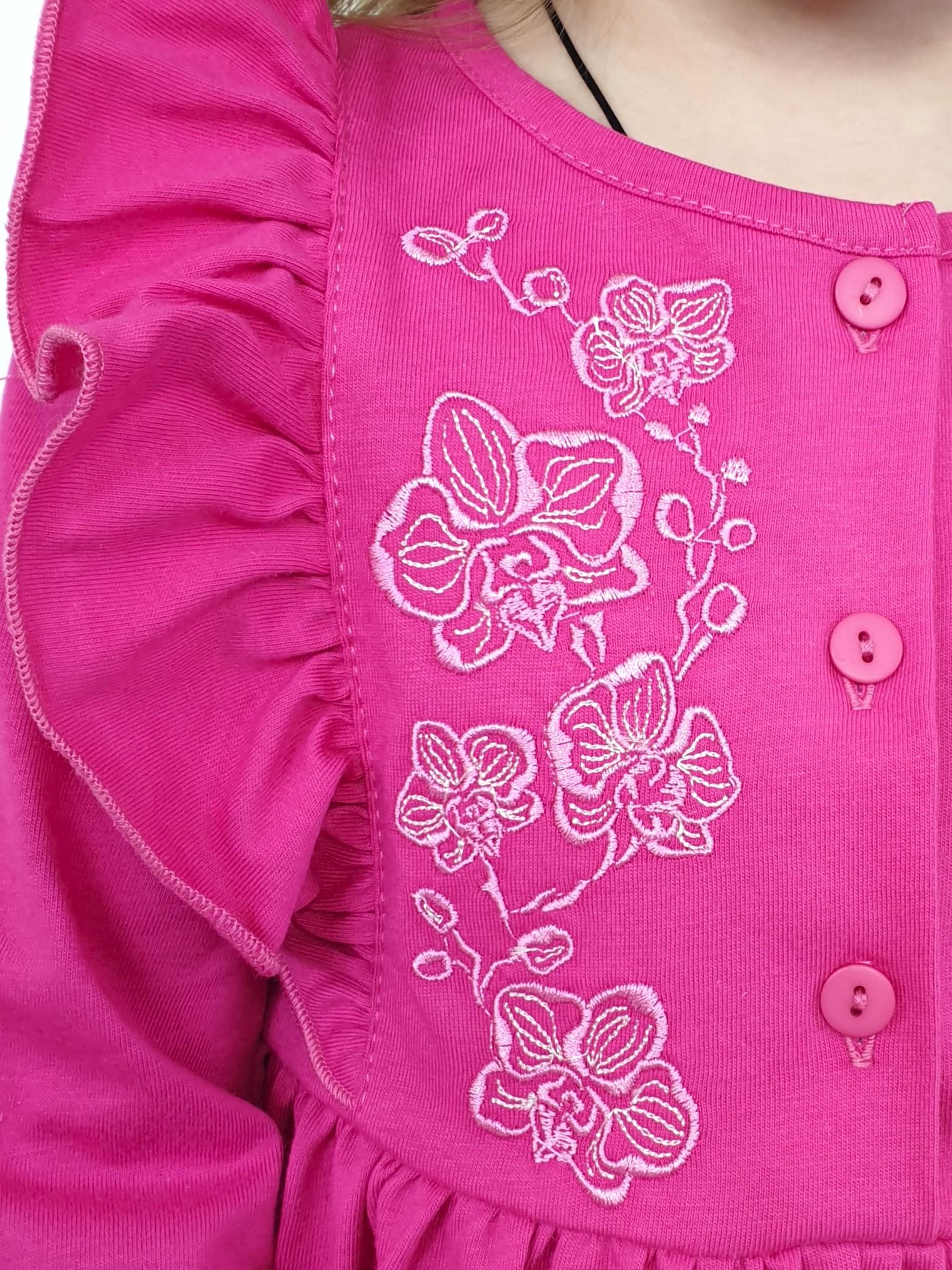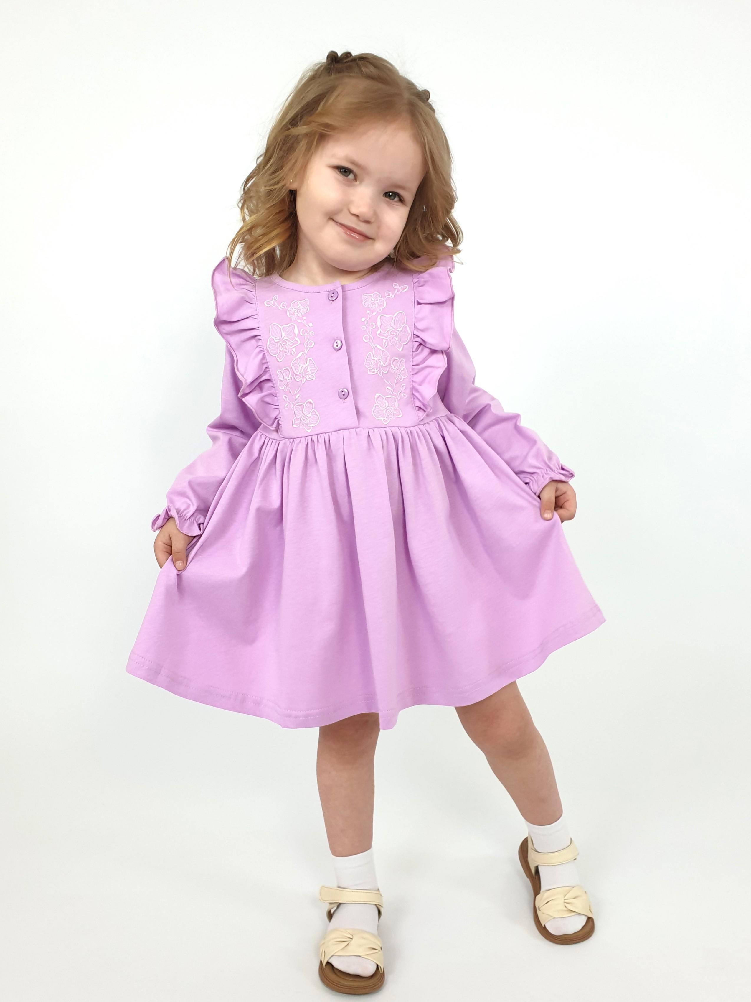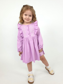 Кулирное полотно:100% х/б. Платье-полуприлегающего силуэта,длинный рукав с резинкой "венгерка" внизу.Отрезная юбка со сборкой.рельефы с рюшей.Вышивка на переде.Горловина окантована.застежка центральная на пуговицы.
