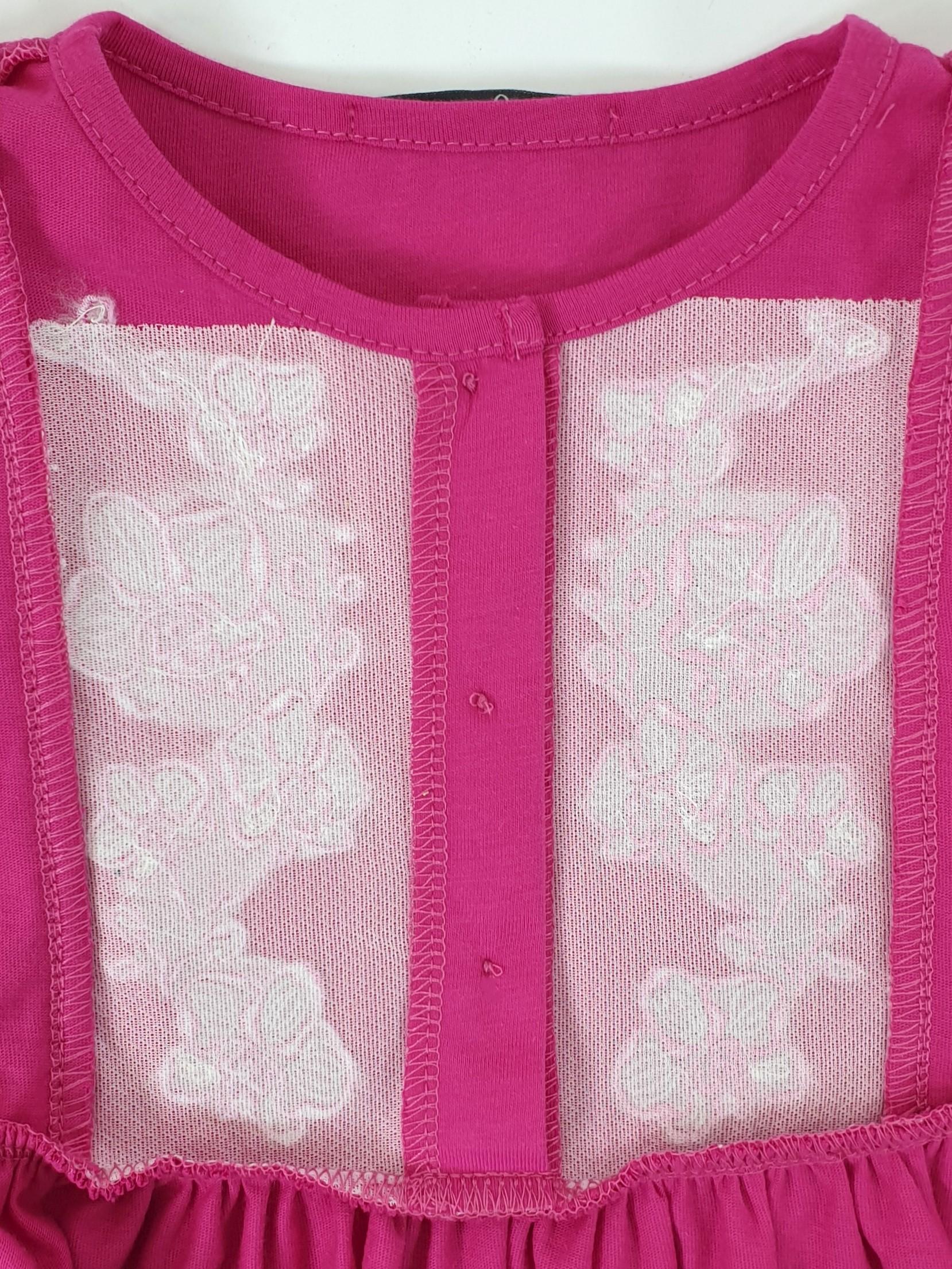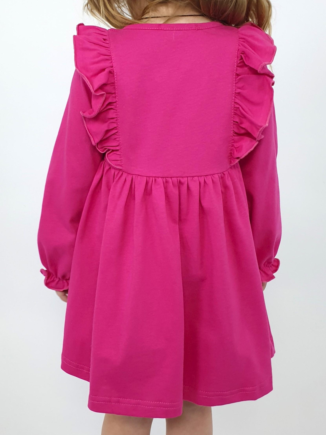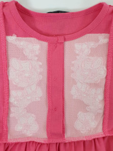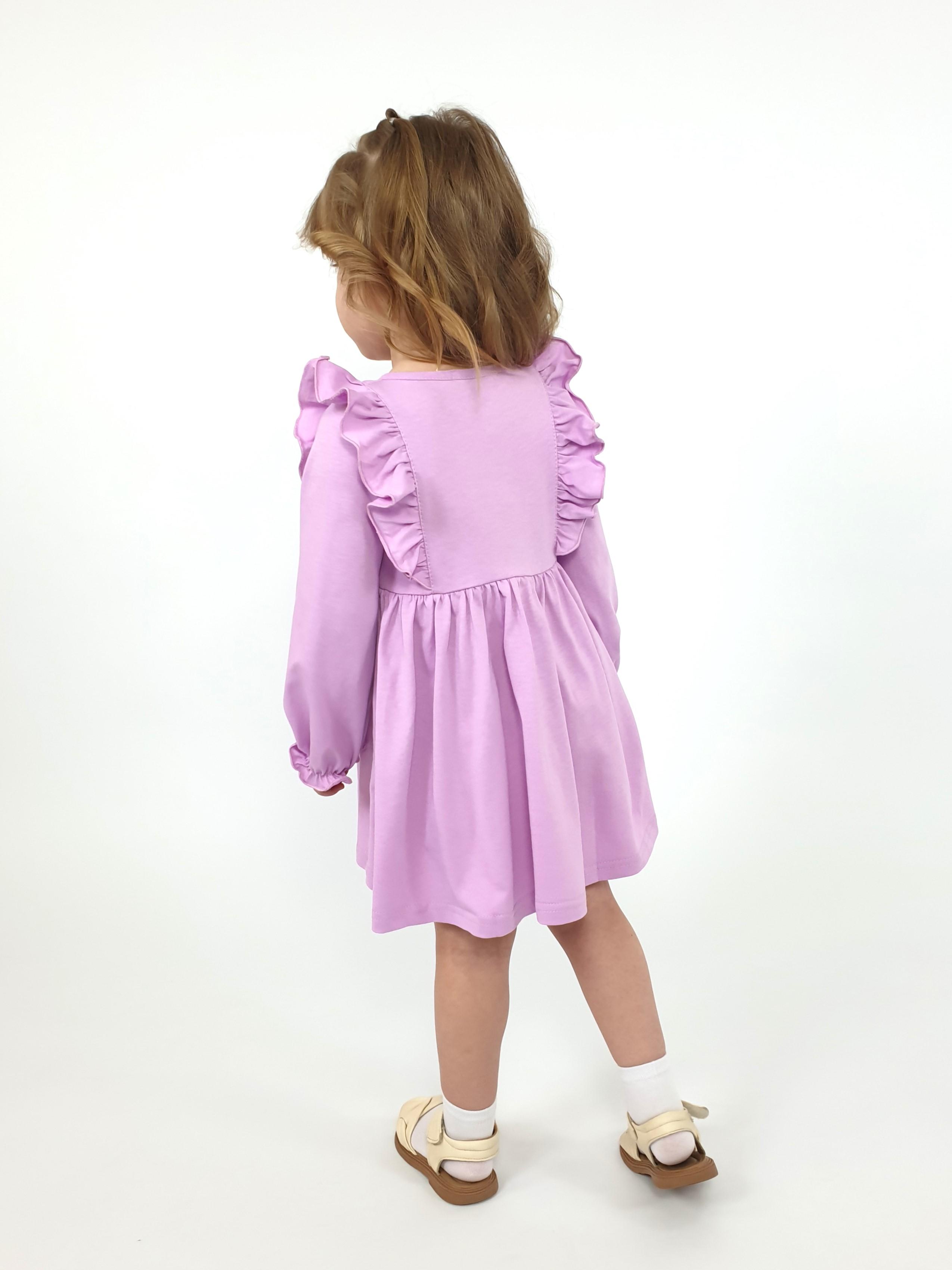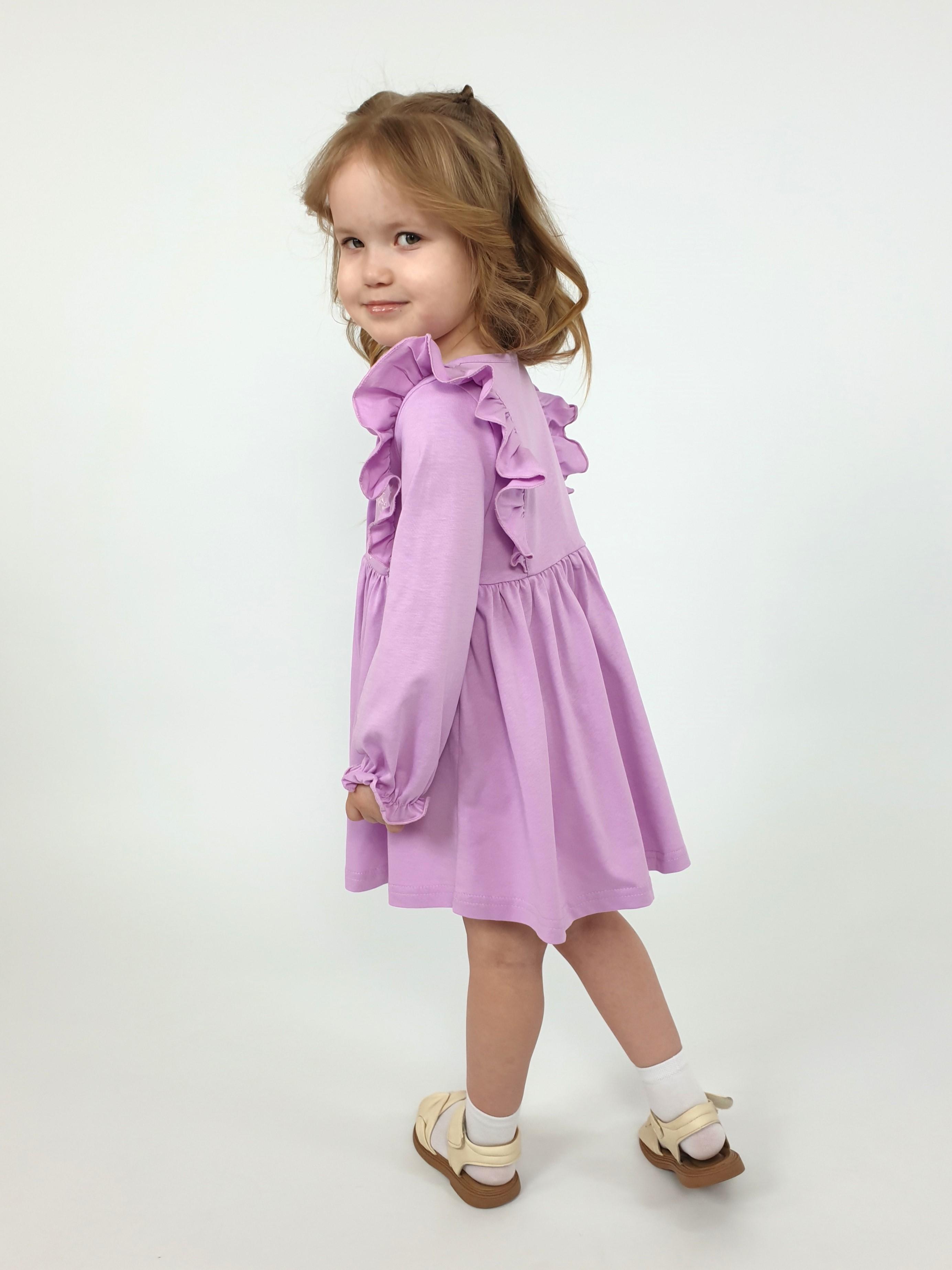 Кулирное полотно:100% х/б. Платье-полуприлегающего силуэта,длинный рукав с резинкой "венгерка" внизу.Отрезная юбка со сборкой.рельефы с рюшей.Вышивка на переде.Горловина окантована.застежка центральная на пуговицы.