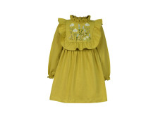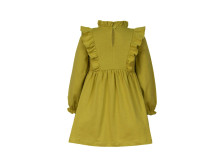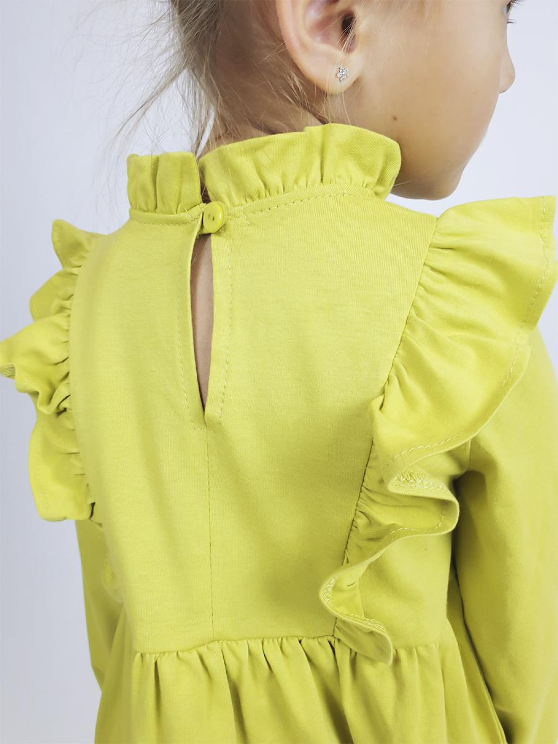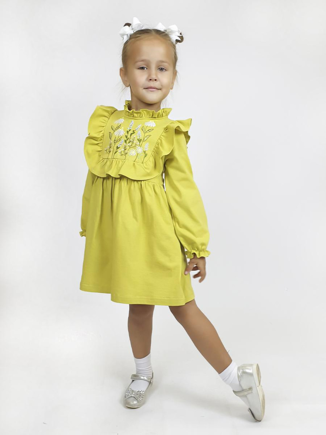Кулирное полотно:100%х/б. Платье-отрезная юбка в сборку,кокетка переда и рельефы спинки с рюшей.Рукав длинный,внизу на резинке(венгерке).В горловине рюша со сгибом,шов окантован и подшит.Застежка по спинке на пуговицу.Вышивка на кокетке.