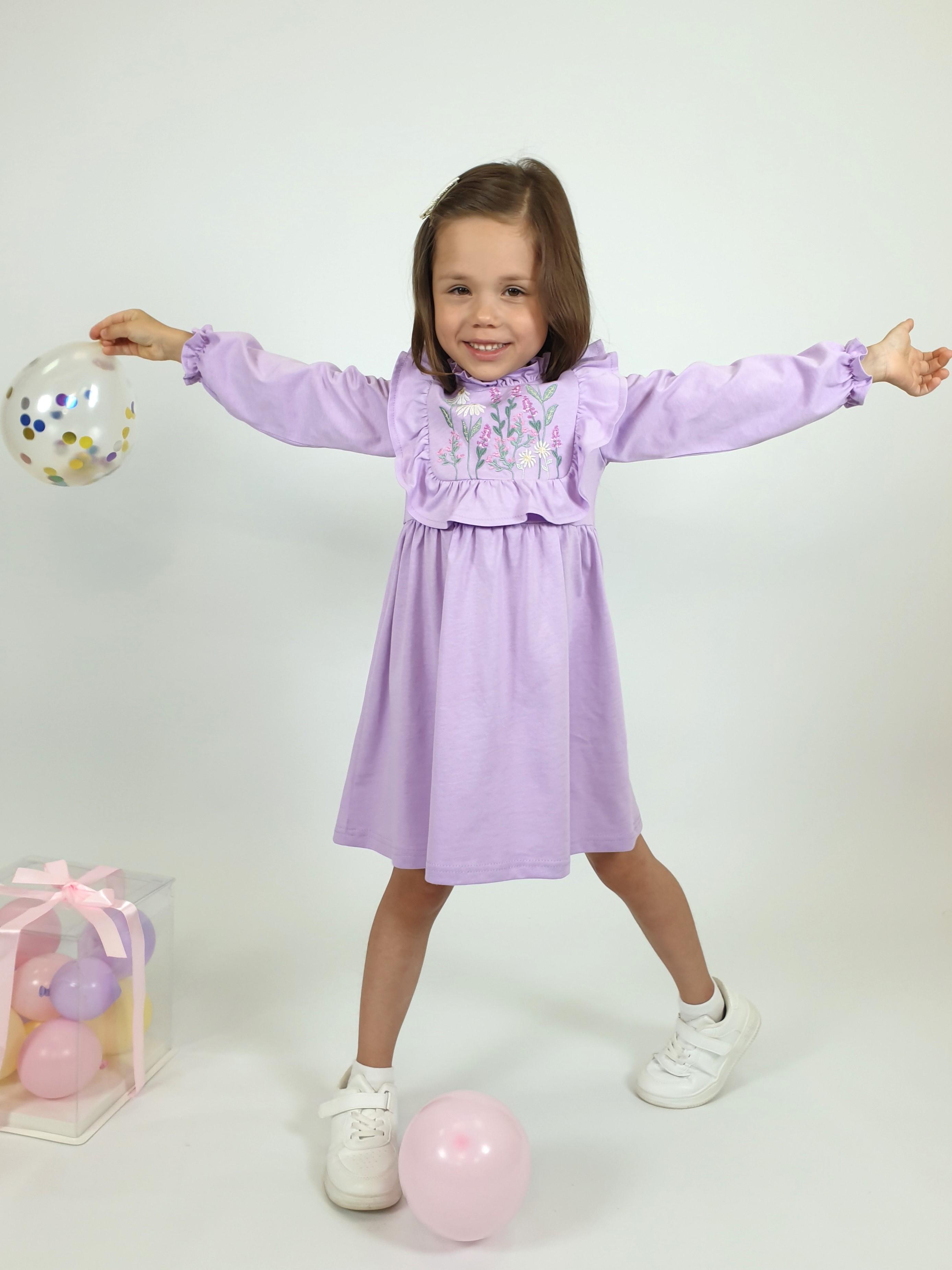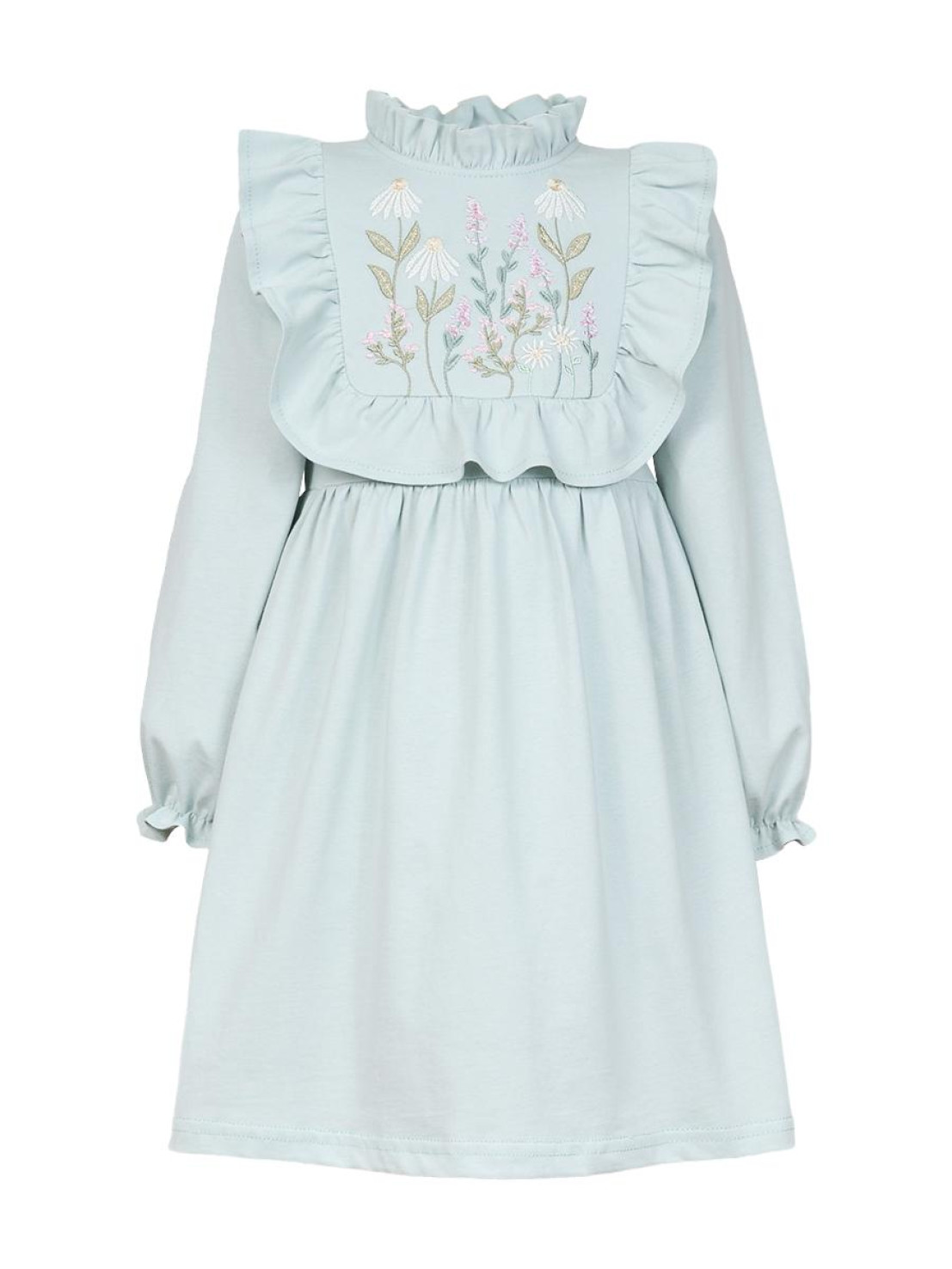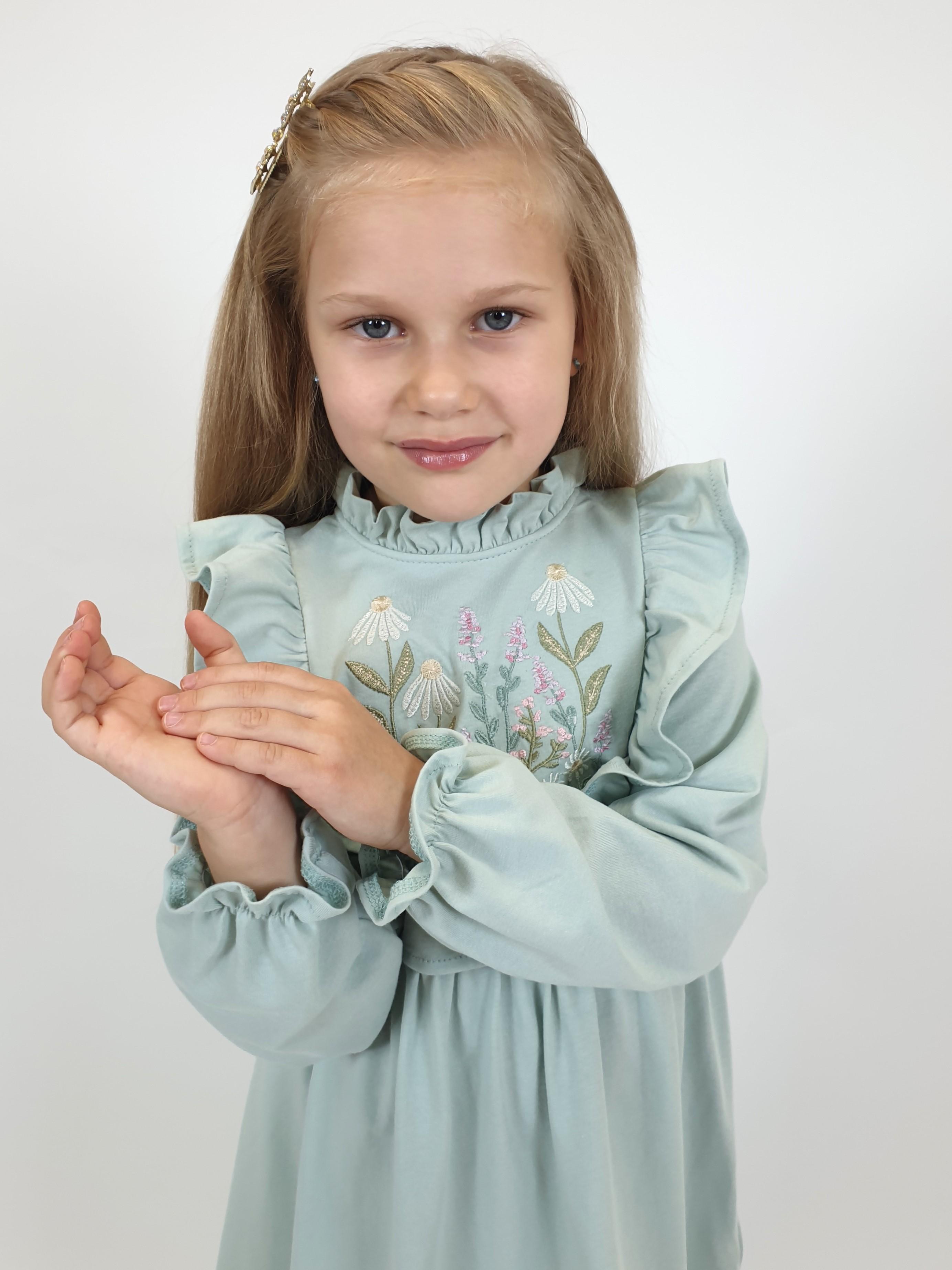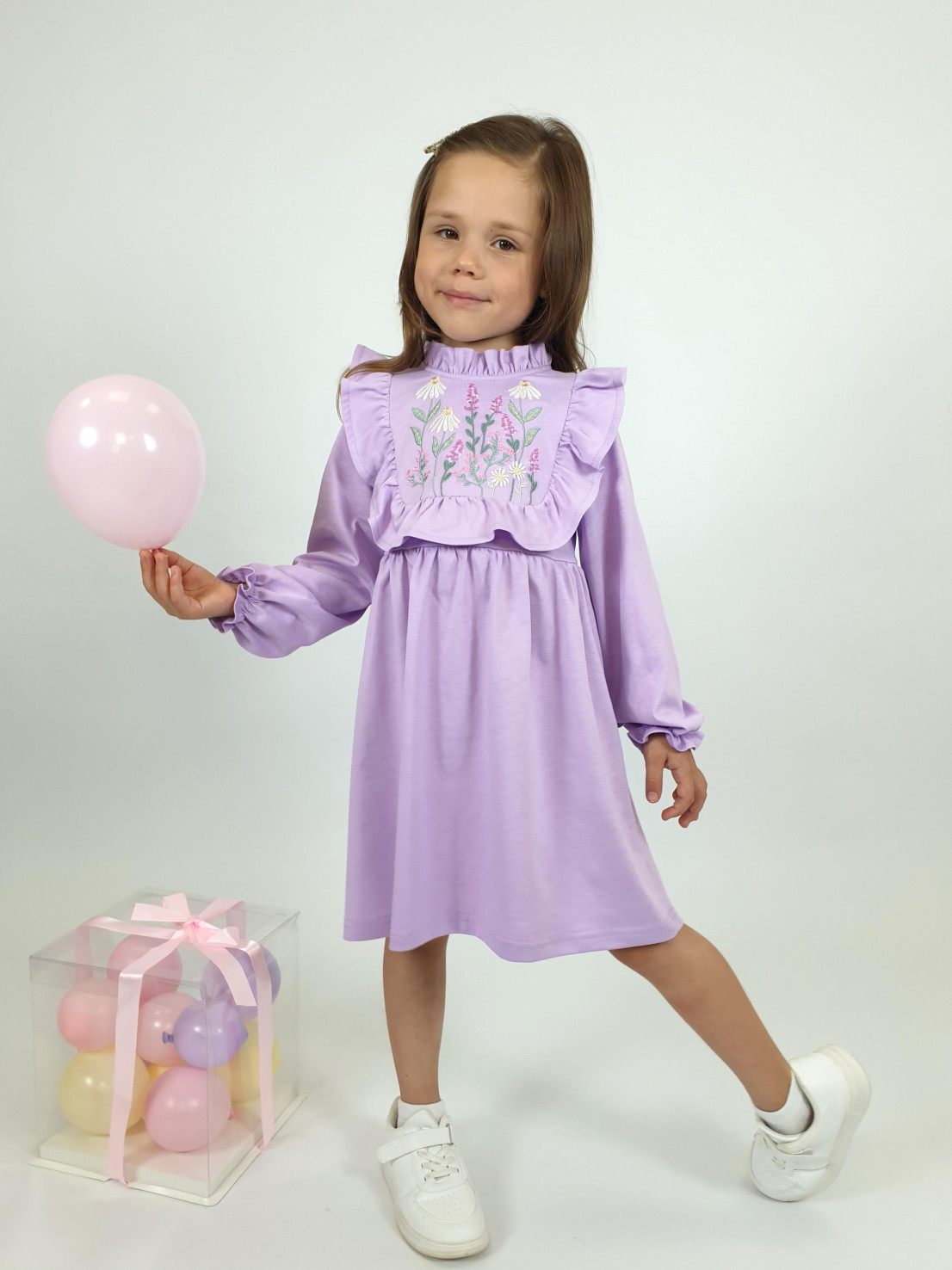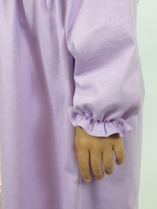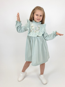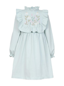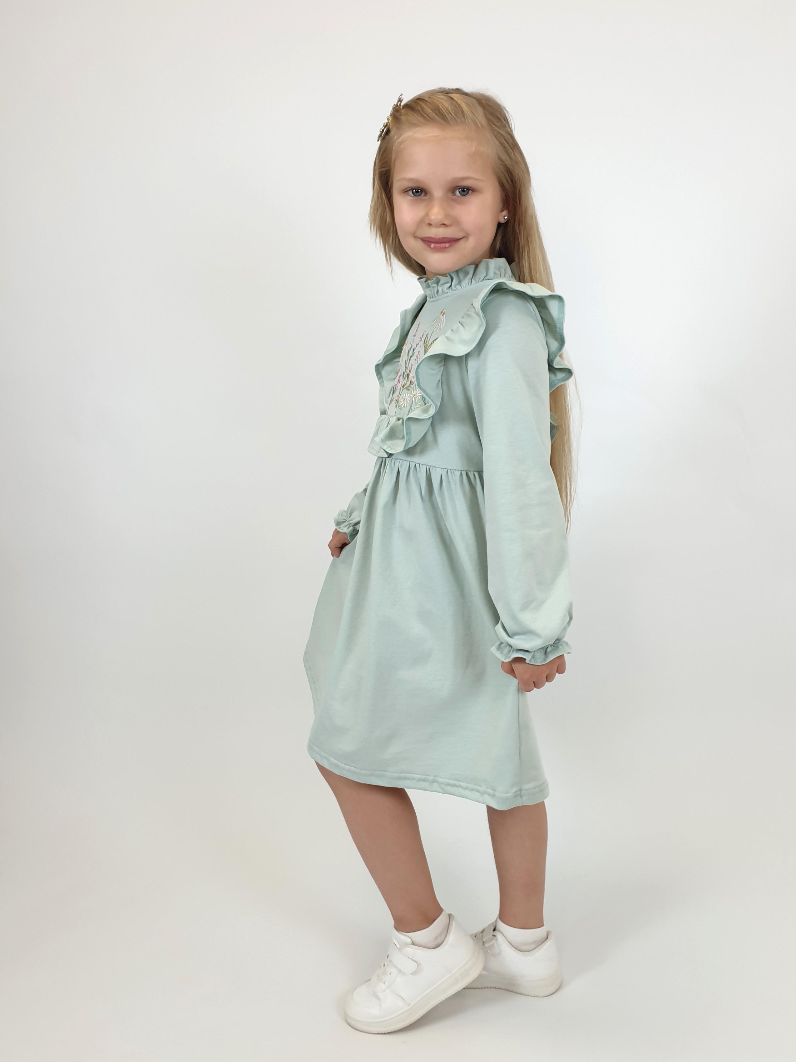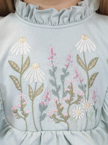Кулирное полотно:100%х/б. Платье-отрезная юбка в сборку,кокетка переда и рельефы спинки с рюшей.Рукав длинный,внизу на резинке(венгерке).В горловине рюша со сгибом,шов окантован и подшит.Застежка по спинке на пуговицу.Вышивка на кокетке.