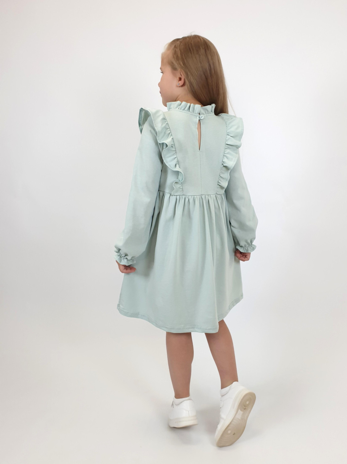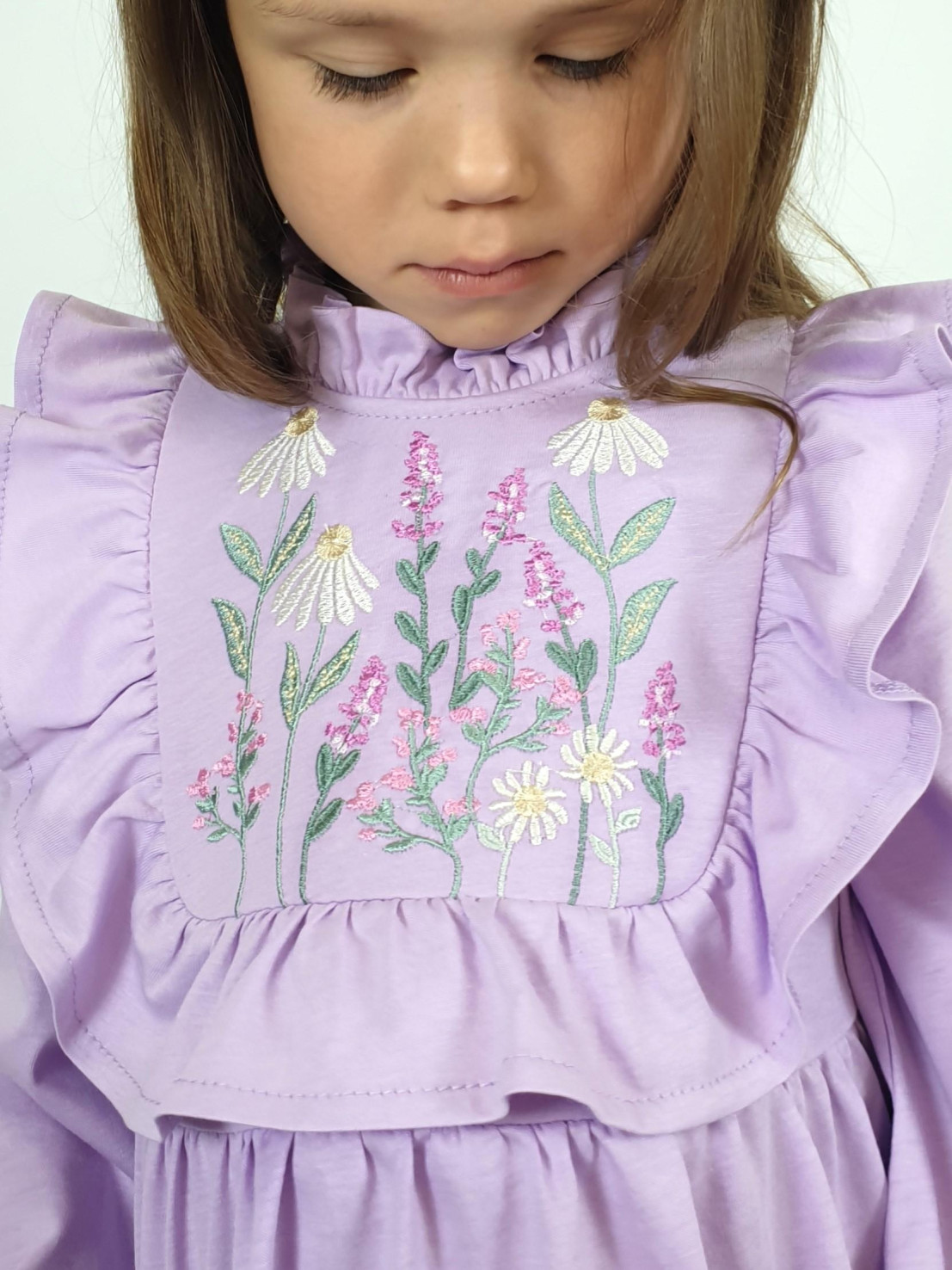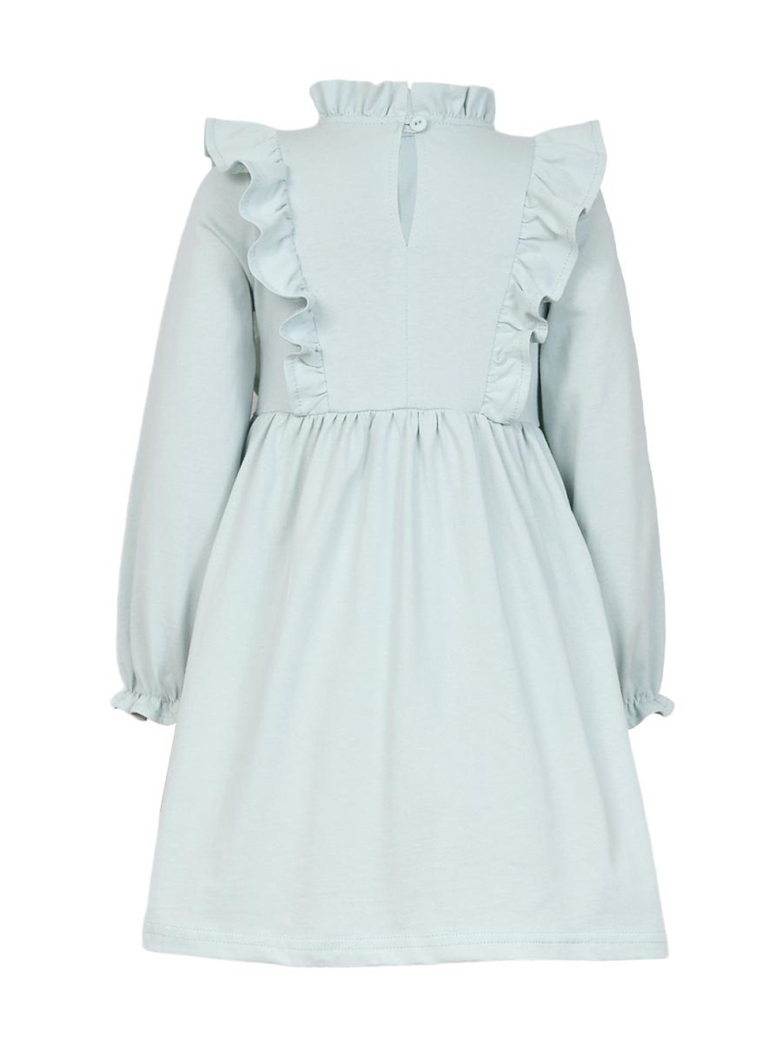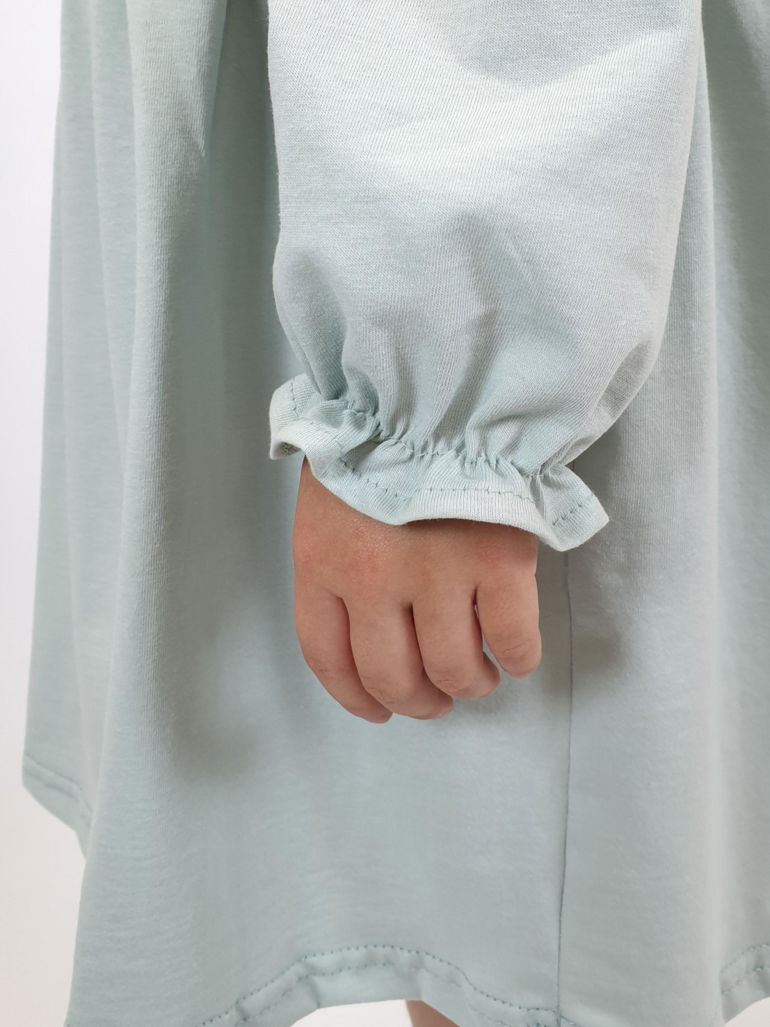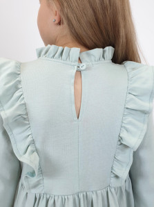 Кулирное полотно:100%х/б. Платье-отрезная юбка в сборку,кокетка переда и рельефы спинки с рюшей.Рукав длинный,внизу на резинке(венгерке).В горловине рюша со сгибом,шов окантован и подшит.Застежка по спинке на пуговицу.Вышивка на кокетке.
