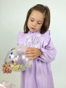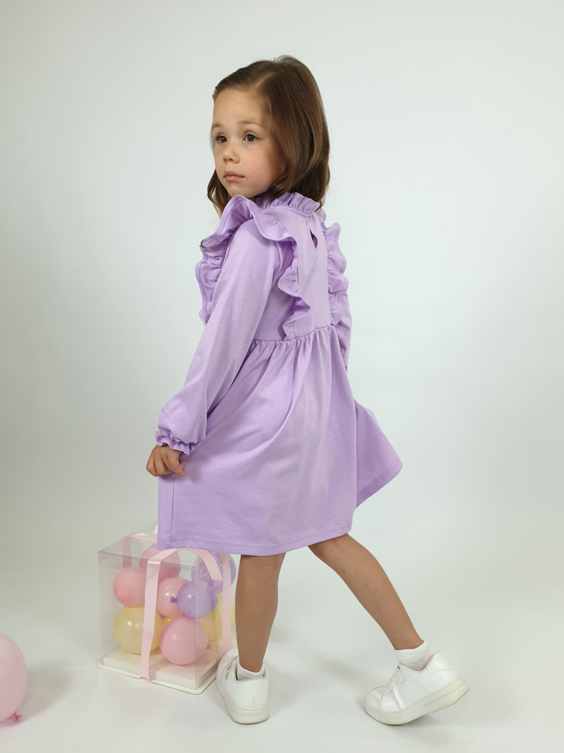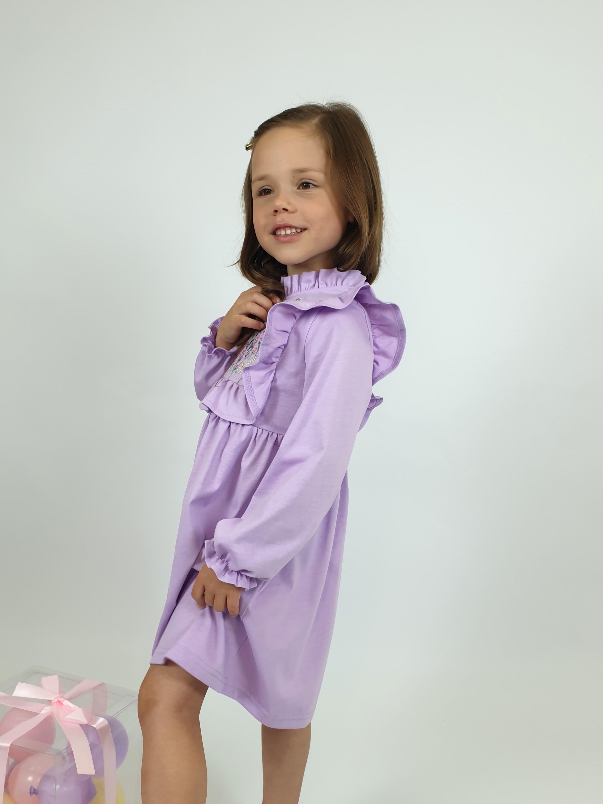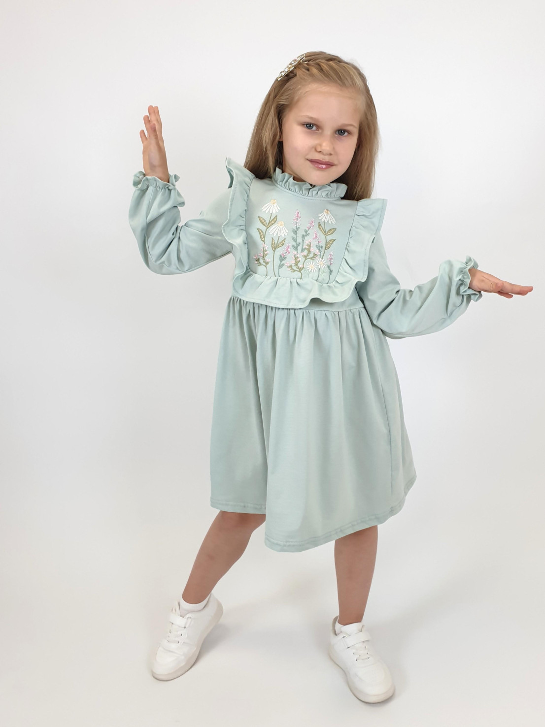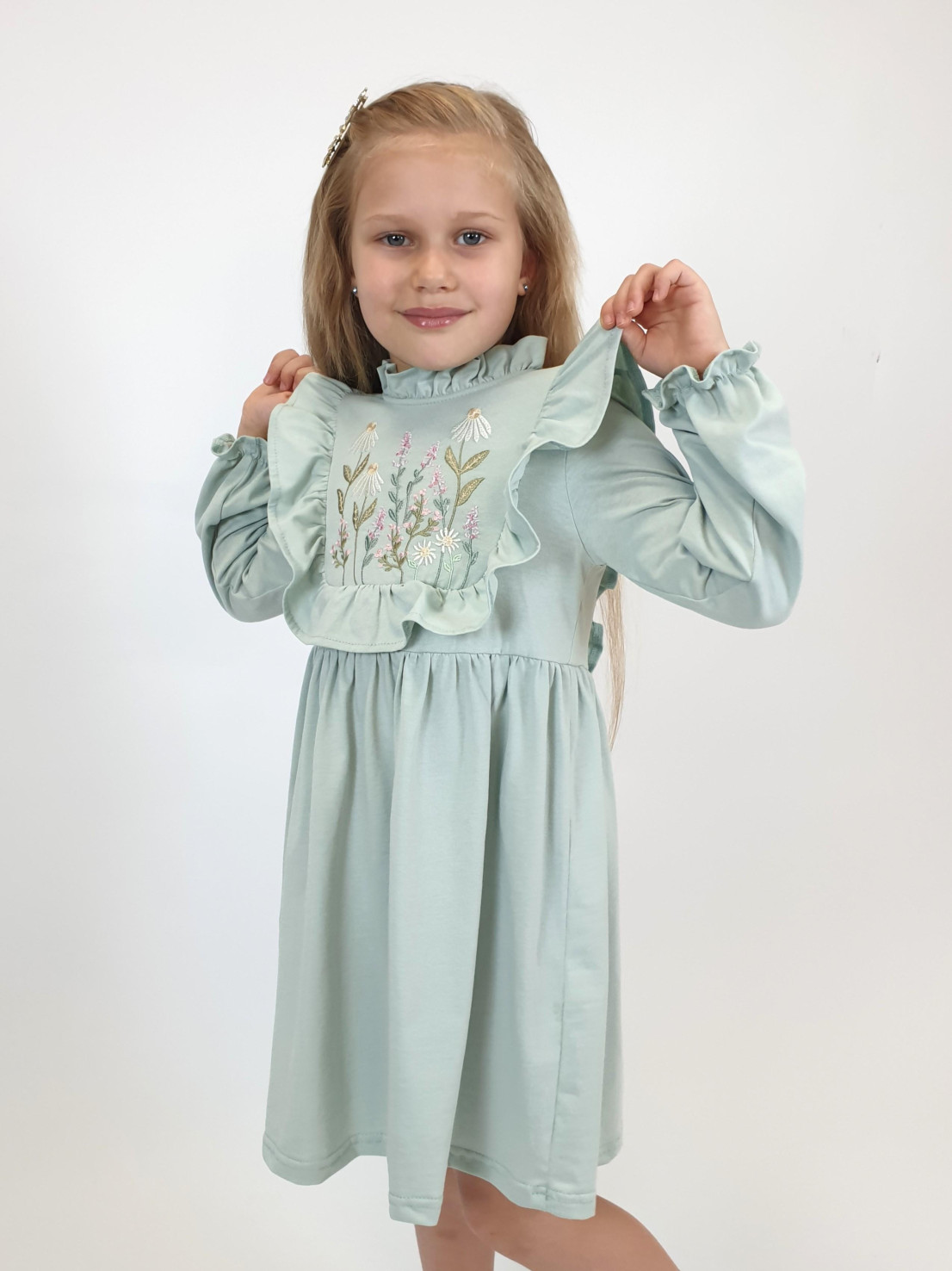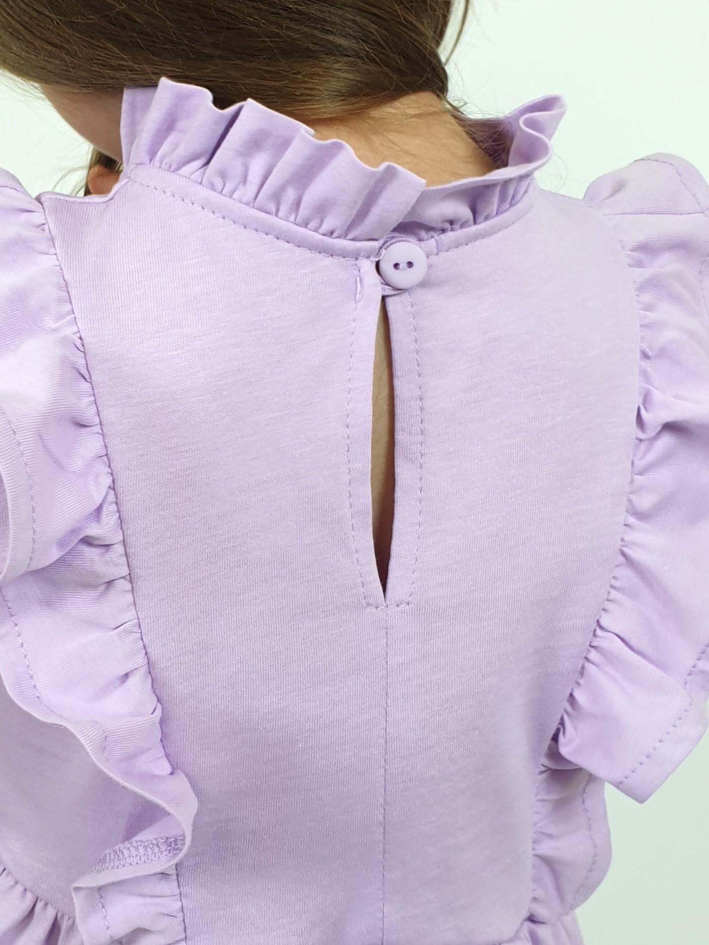 Кулирное полотно:100%х/б. Платье-отрезная юбка в сборку,кокетка переда и рельефы спинки с рюшей.Рукав длинный,внизу на резинке(венгерке).В горловине рюша со сгибом,шов окантован и подшит.Застежка по спинке на пуговицу.Вышивка на кокетке.