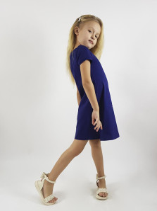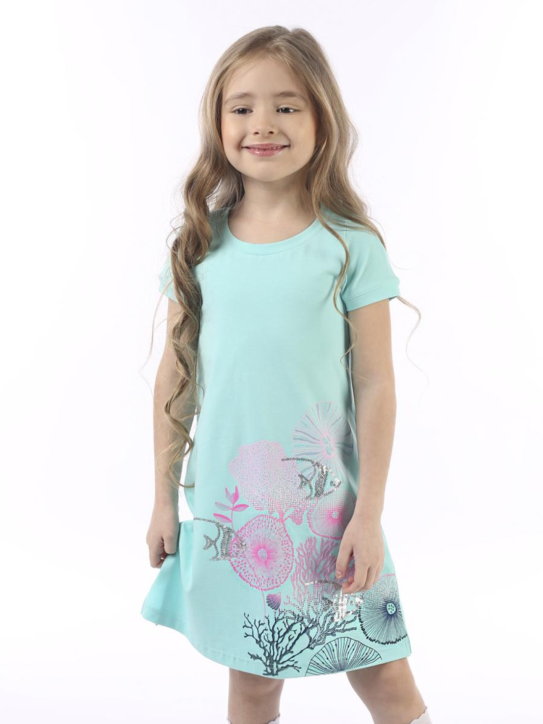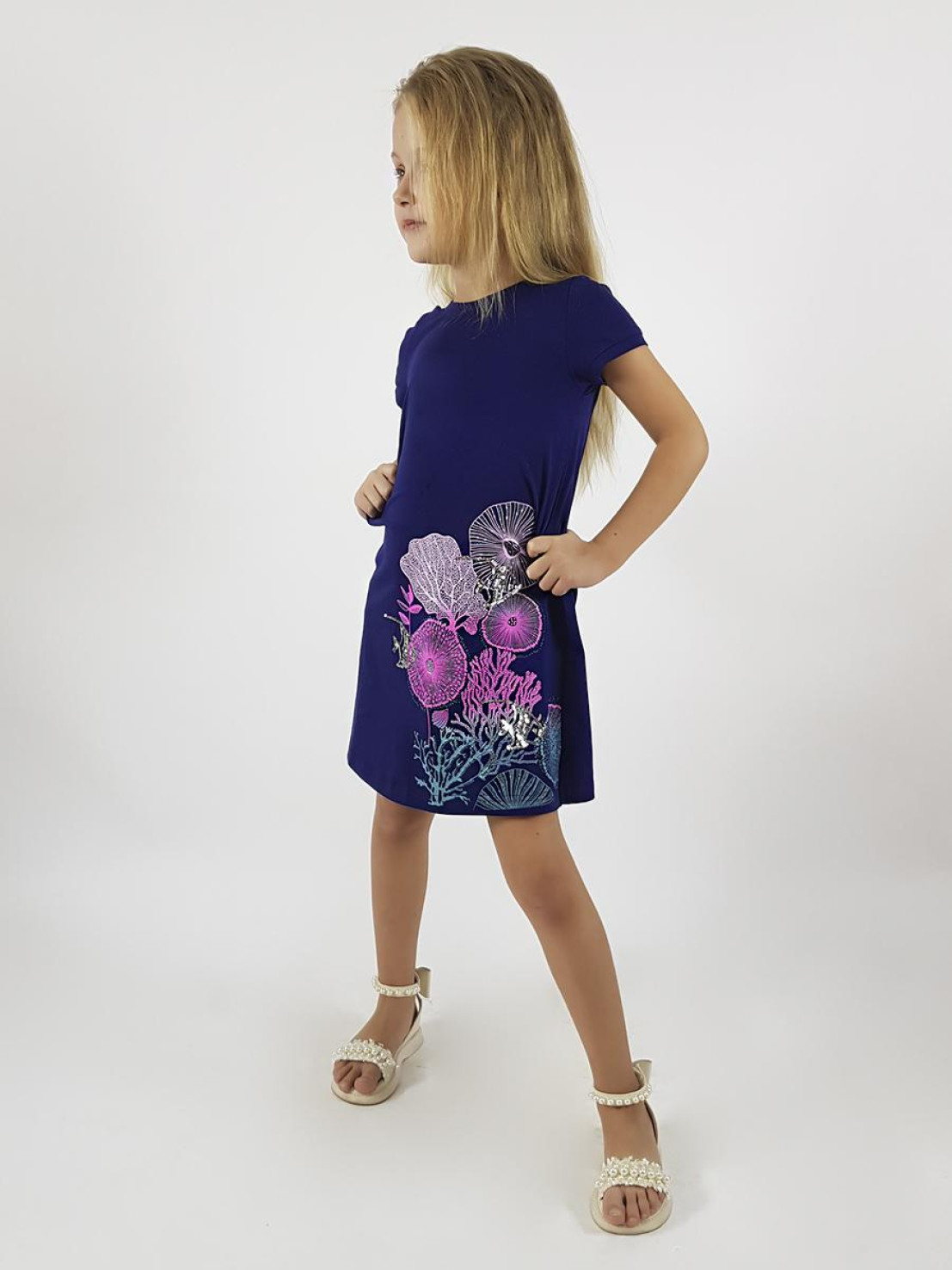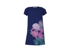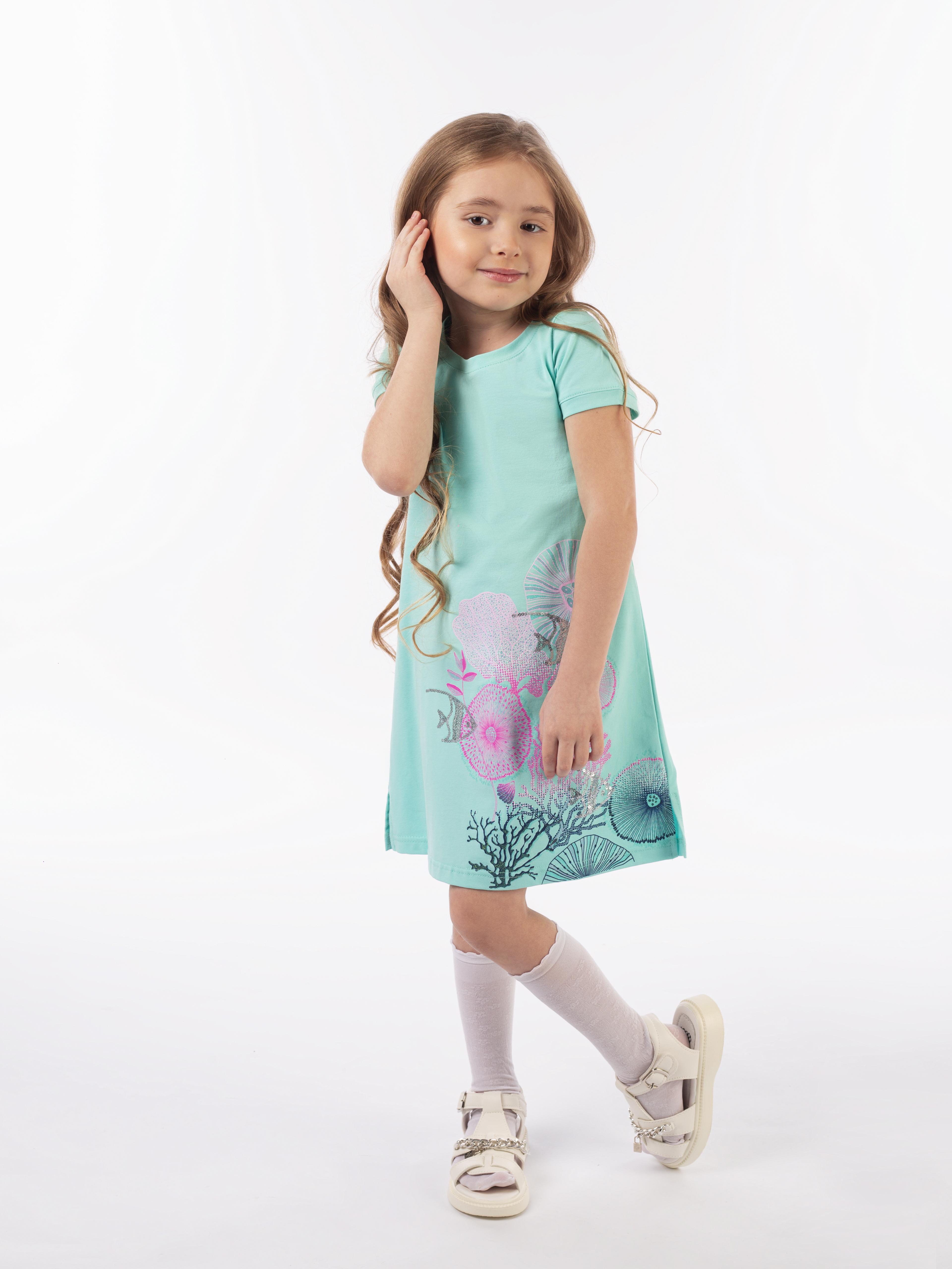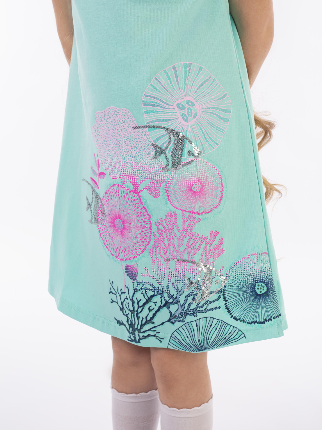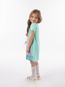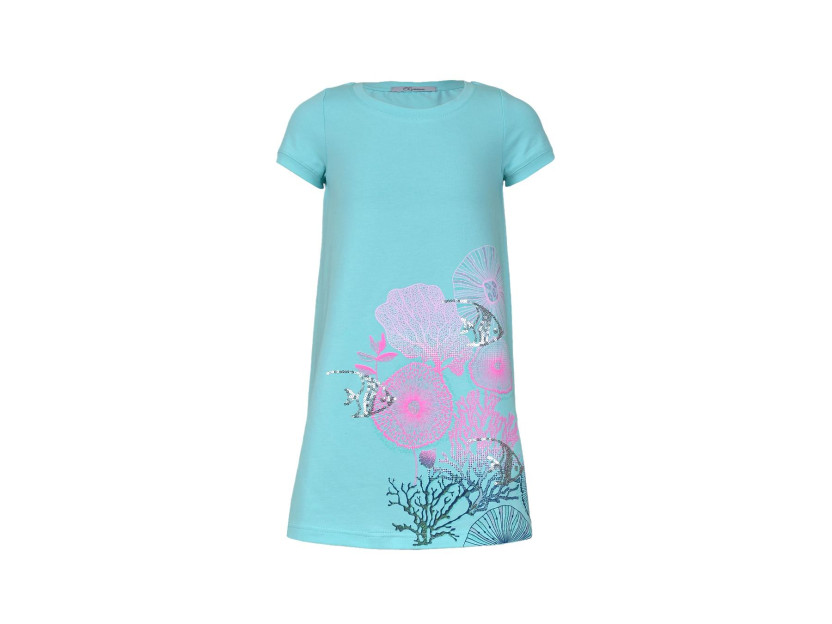 Кулирное полотно: 95% х/б,5% лайкра. Платье-силуэт трапеция,короткий втачной рукав на манжете.Перед с печатью и вышивкой-пайетки,сбоку разрезы.Вырез горловины обработан планкой.