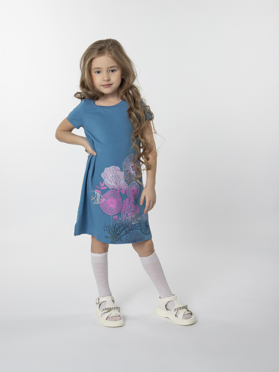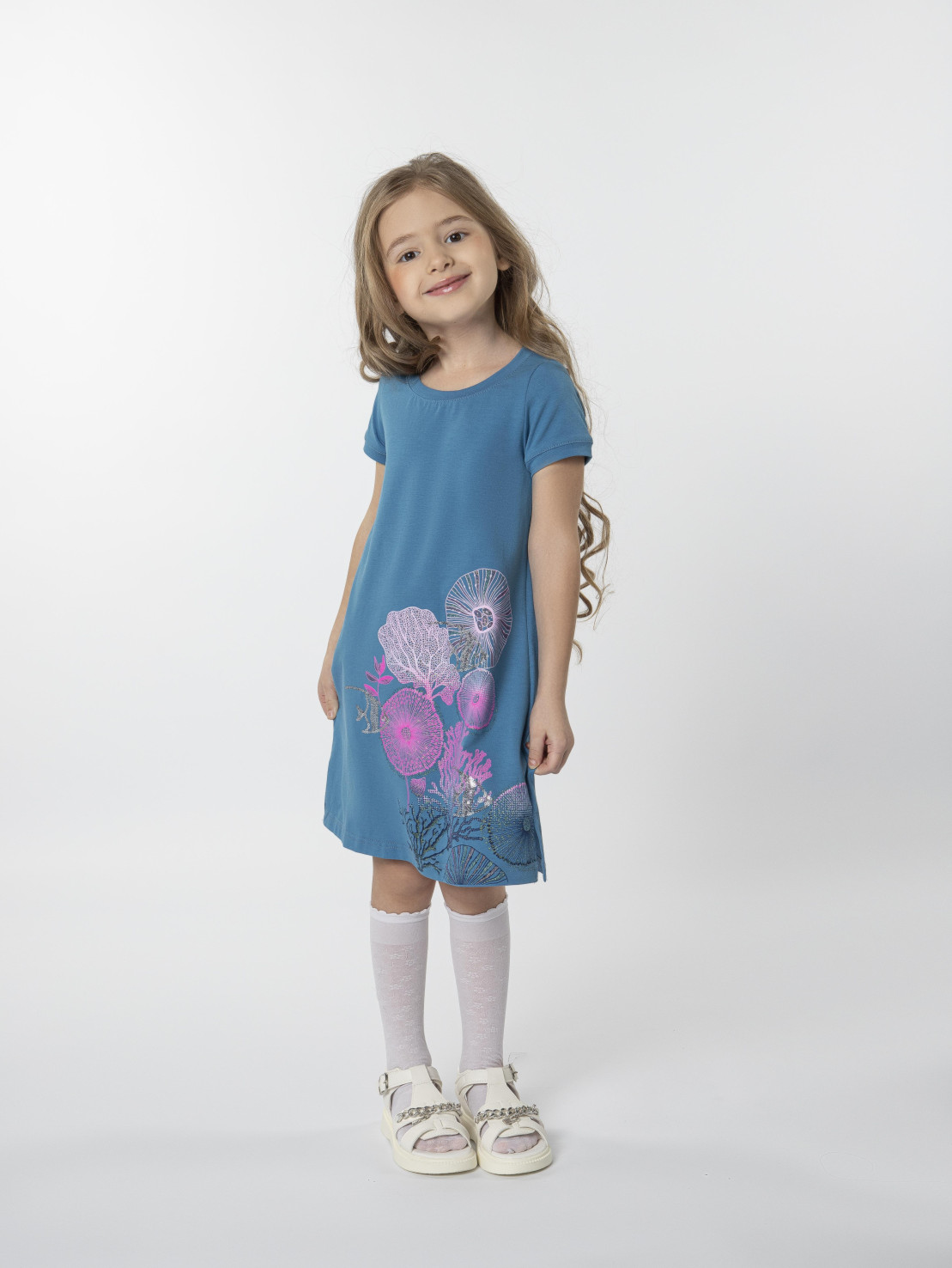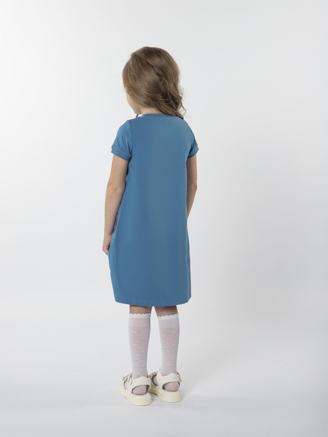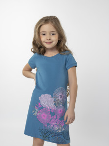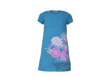 Кулирное полотно: 95% х/б,5% лайкра. Платье-силуэт трапеция,короткий втачной рукав на манжете.Перед с печатью и вышивкой-пайетки,сбоку разрезы.Вырез горловины обработан планкой.