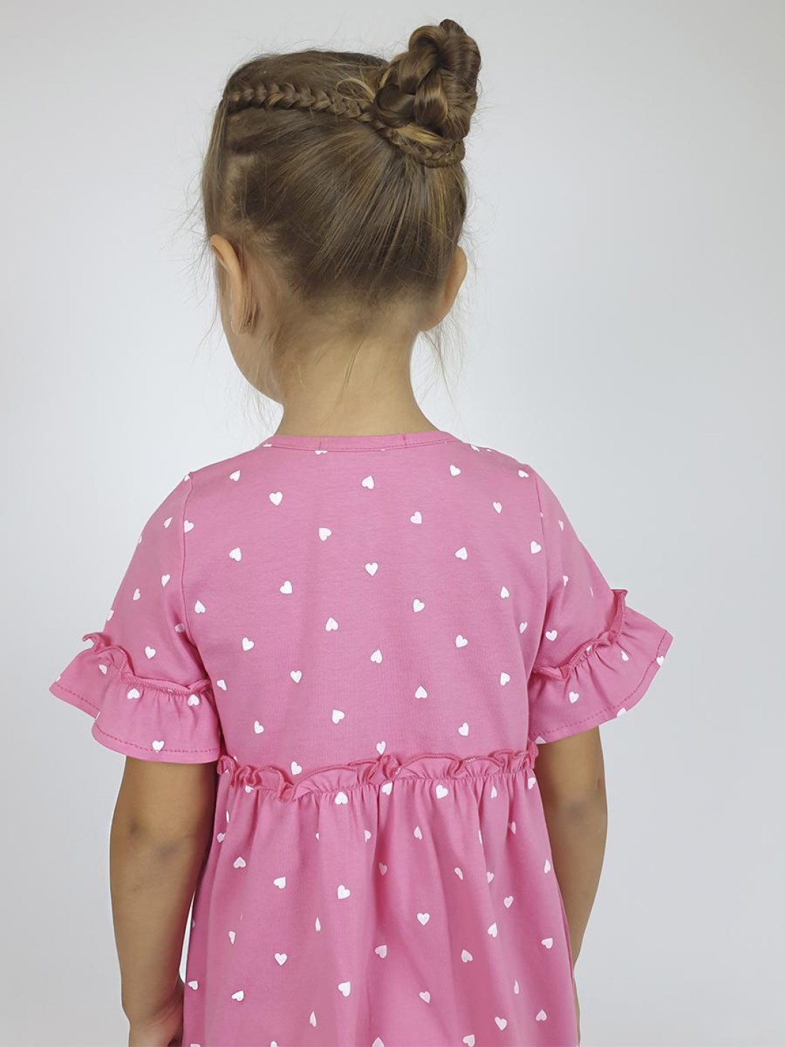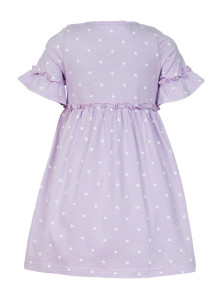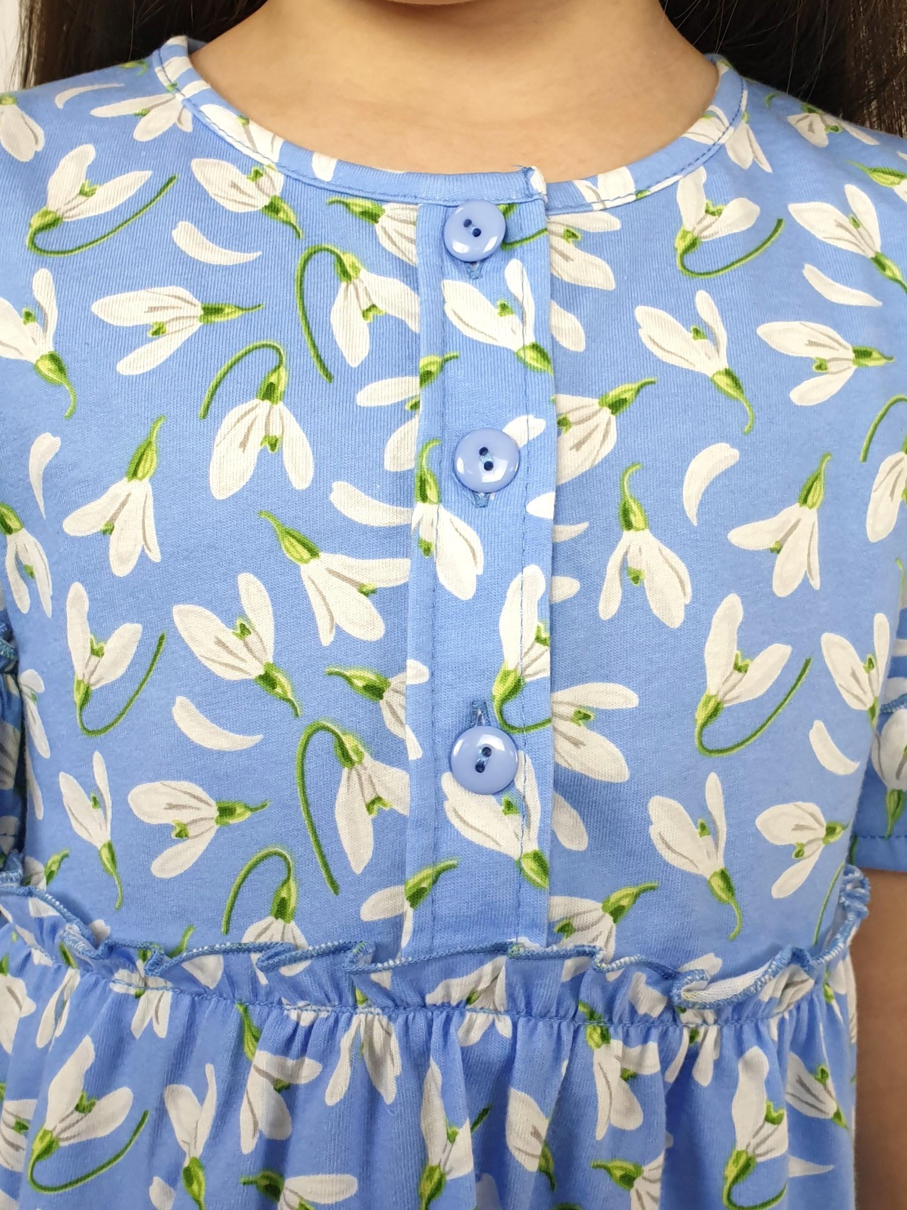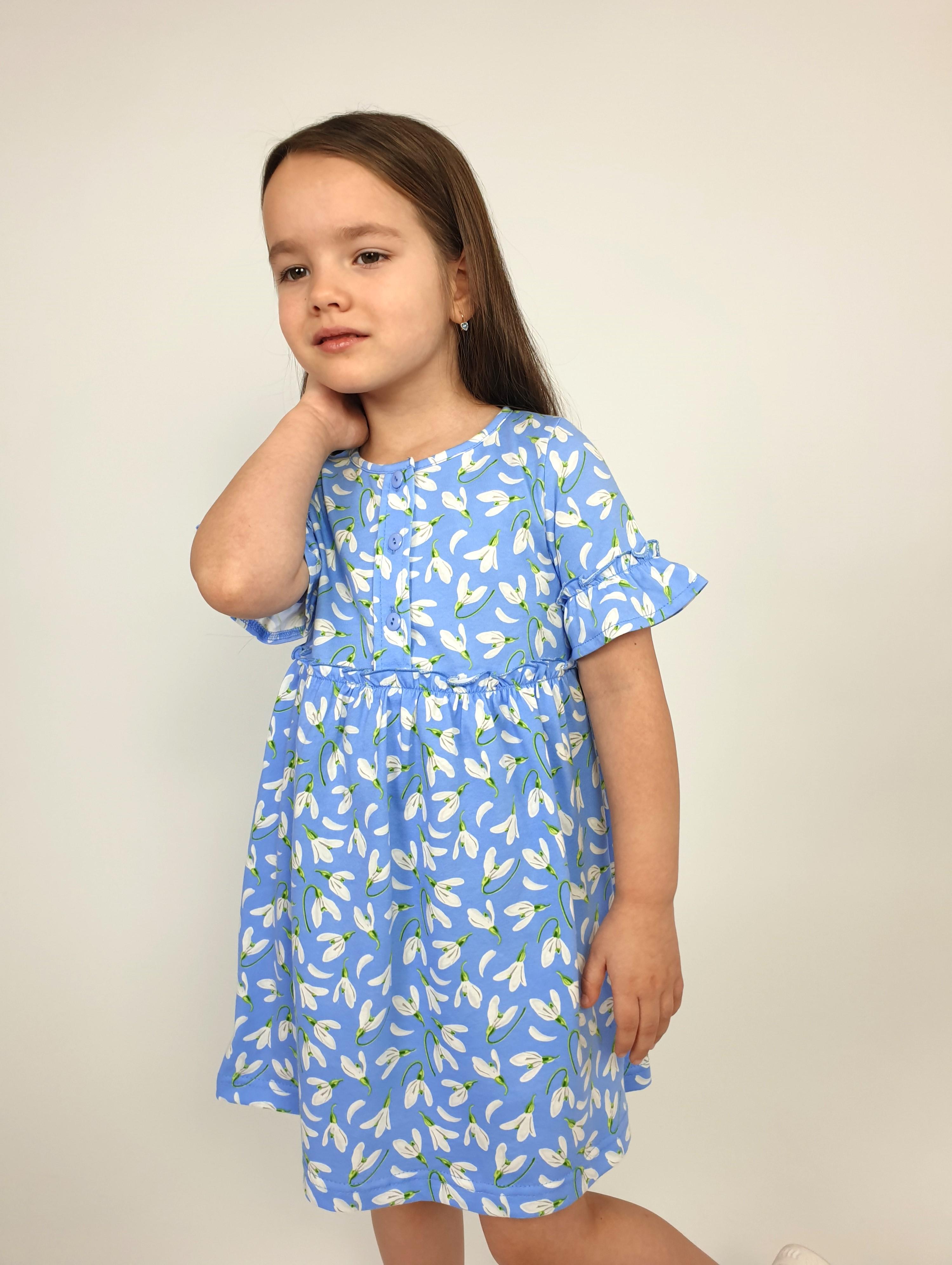 Кулирное полотно (набивка):100% х/б. Платье-силуэт трапеция,перед и спинка с кокеткой,юбка со сборкой.Рукав короткий с рюшей.Застежка по переду,на пуговицы.Горловина окантована.