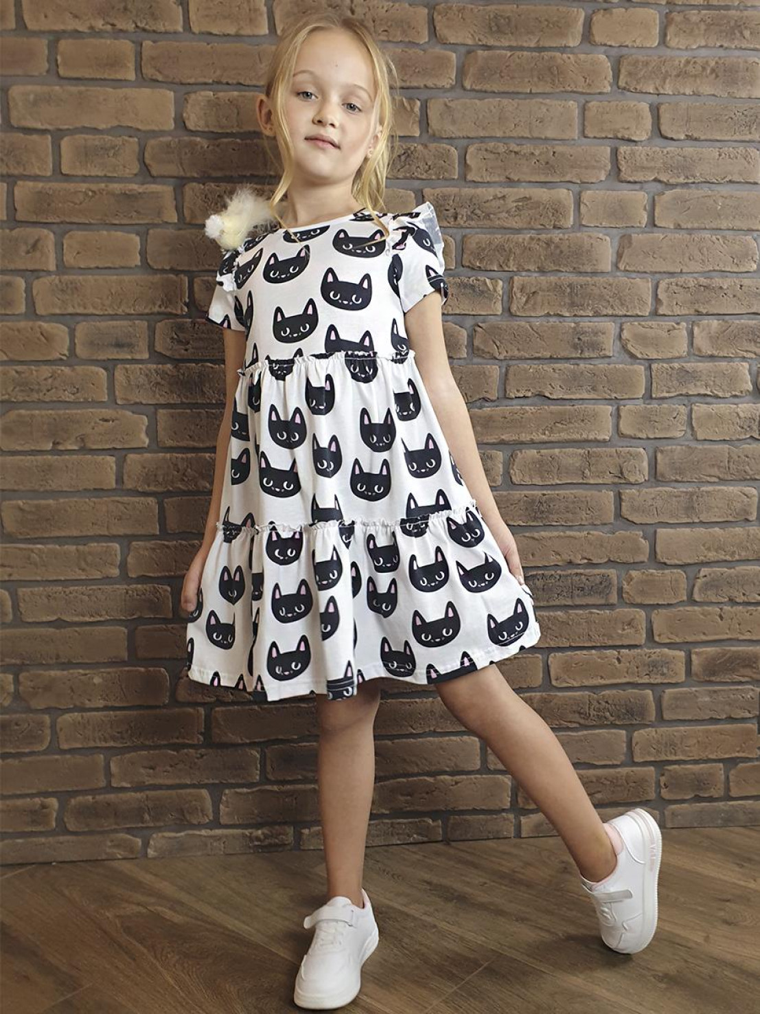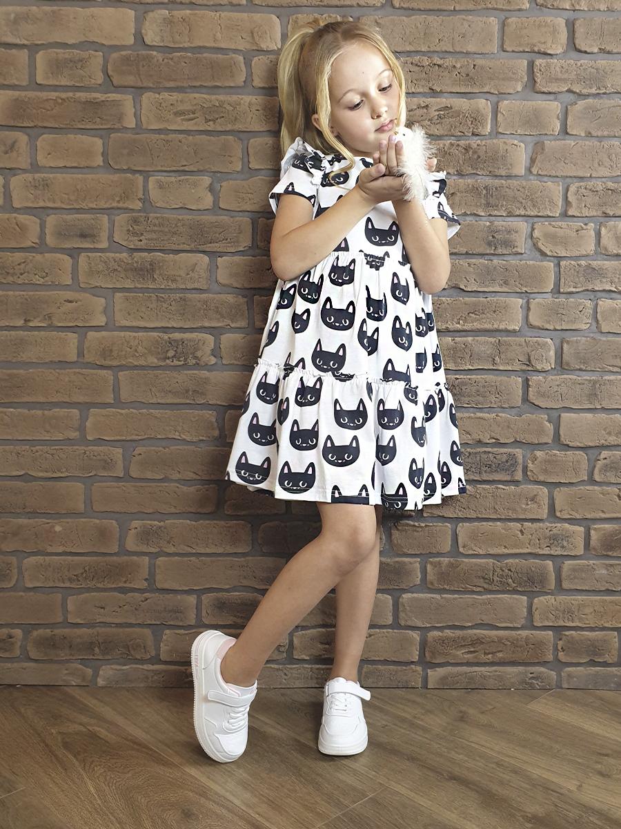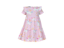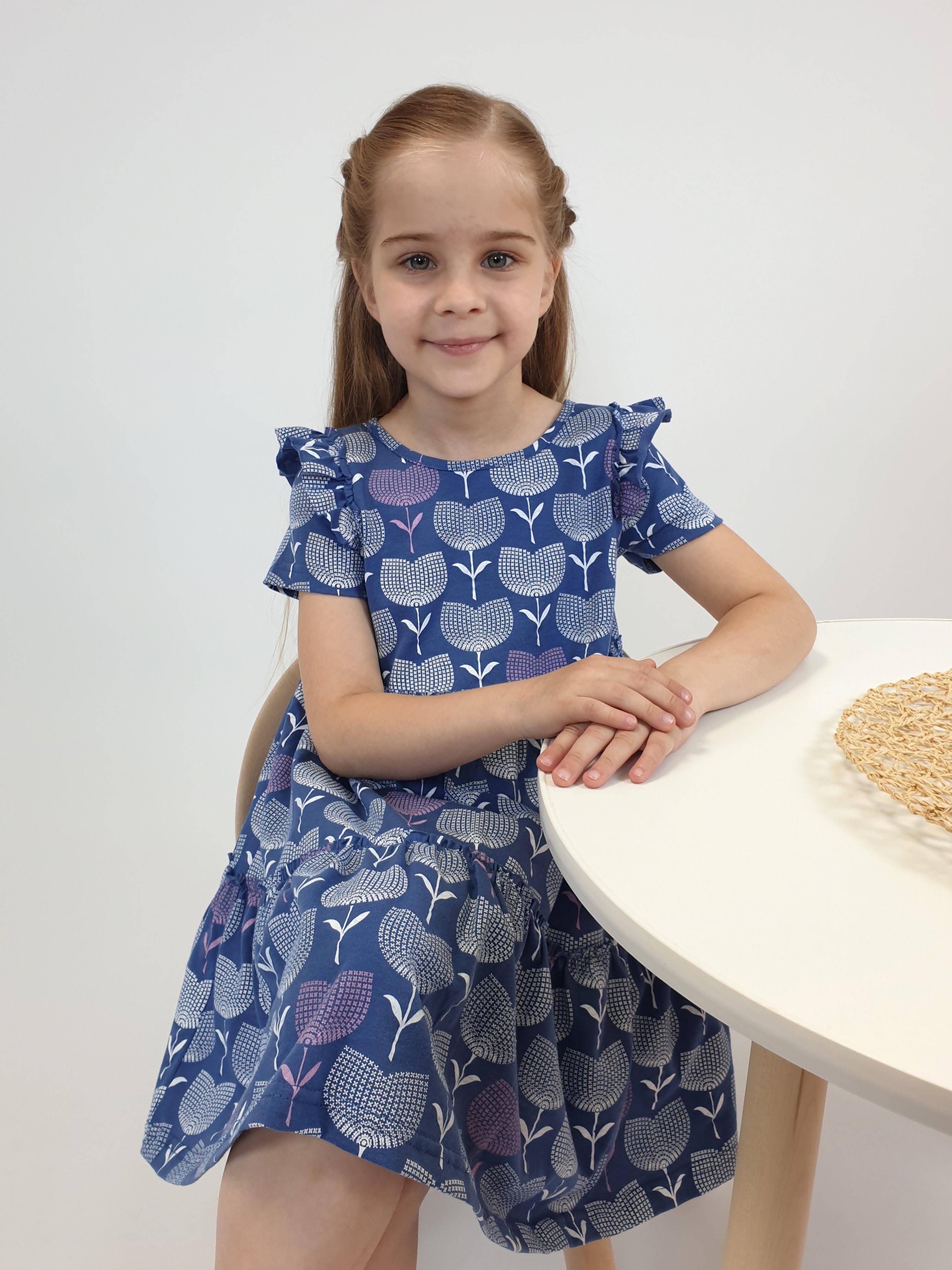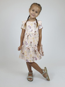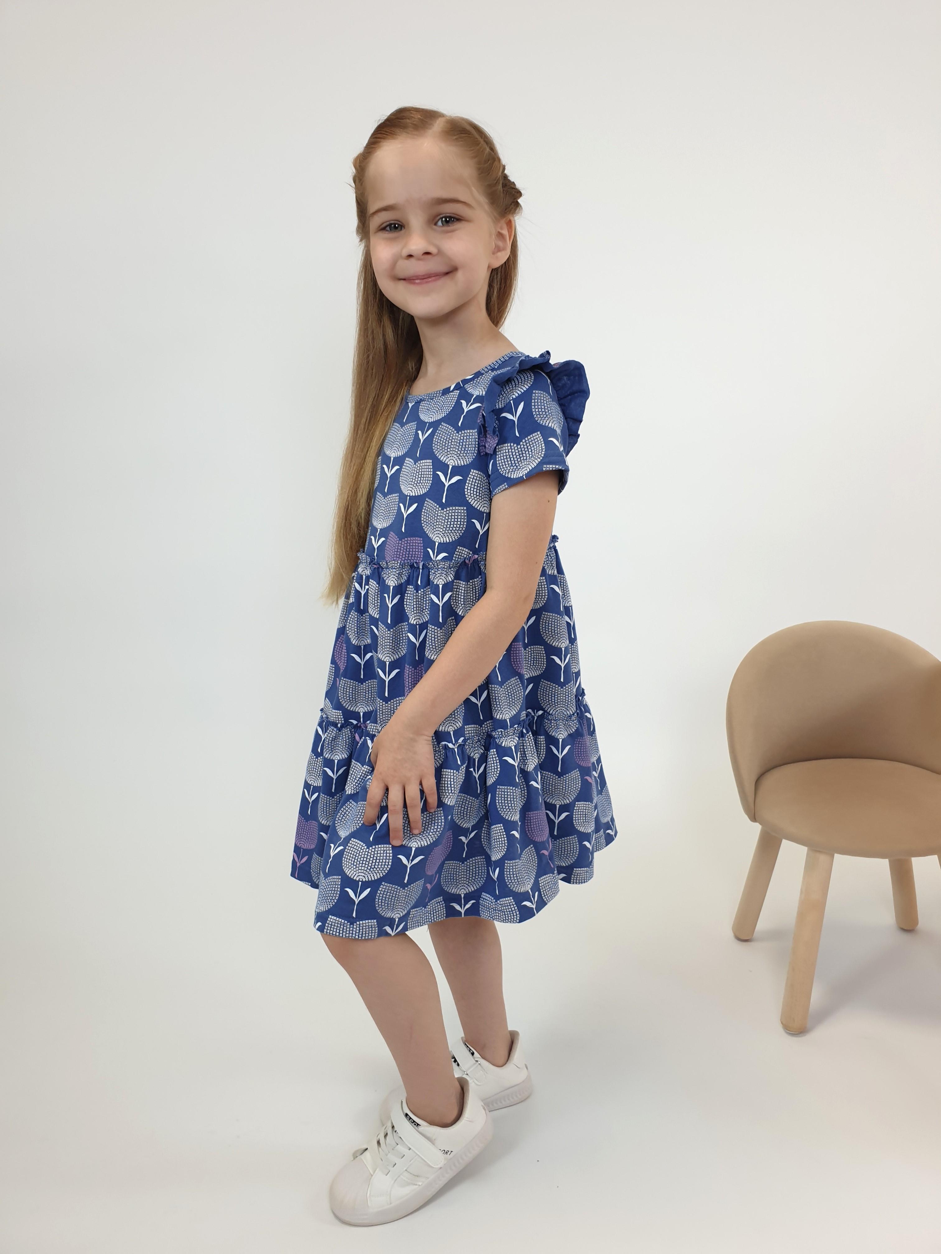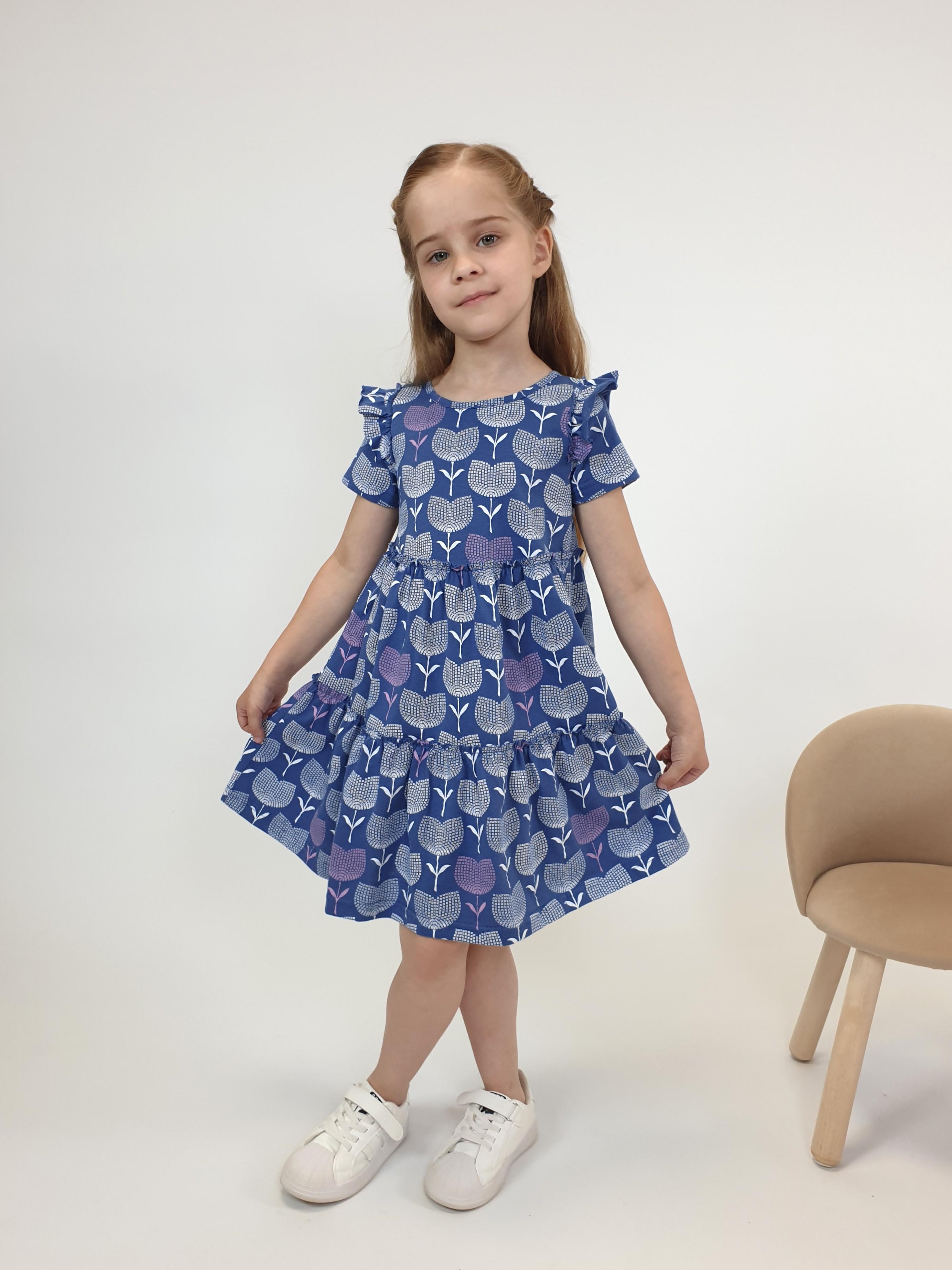 Кулирное полотно:100% х/б. Платье-силуэт трапеция,короткий втачной рукав с настрочной рюшей по пройме.Юбка переда и спинки из двух воланов.Застежка по спинке на пуговицы.Горловина окантована.