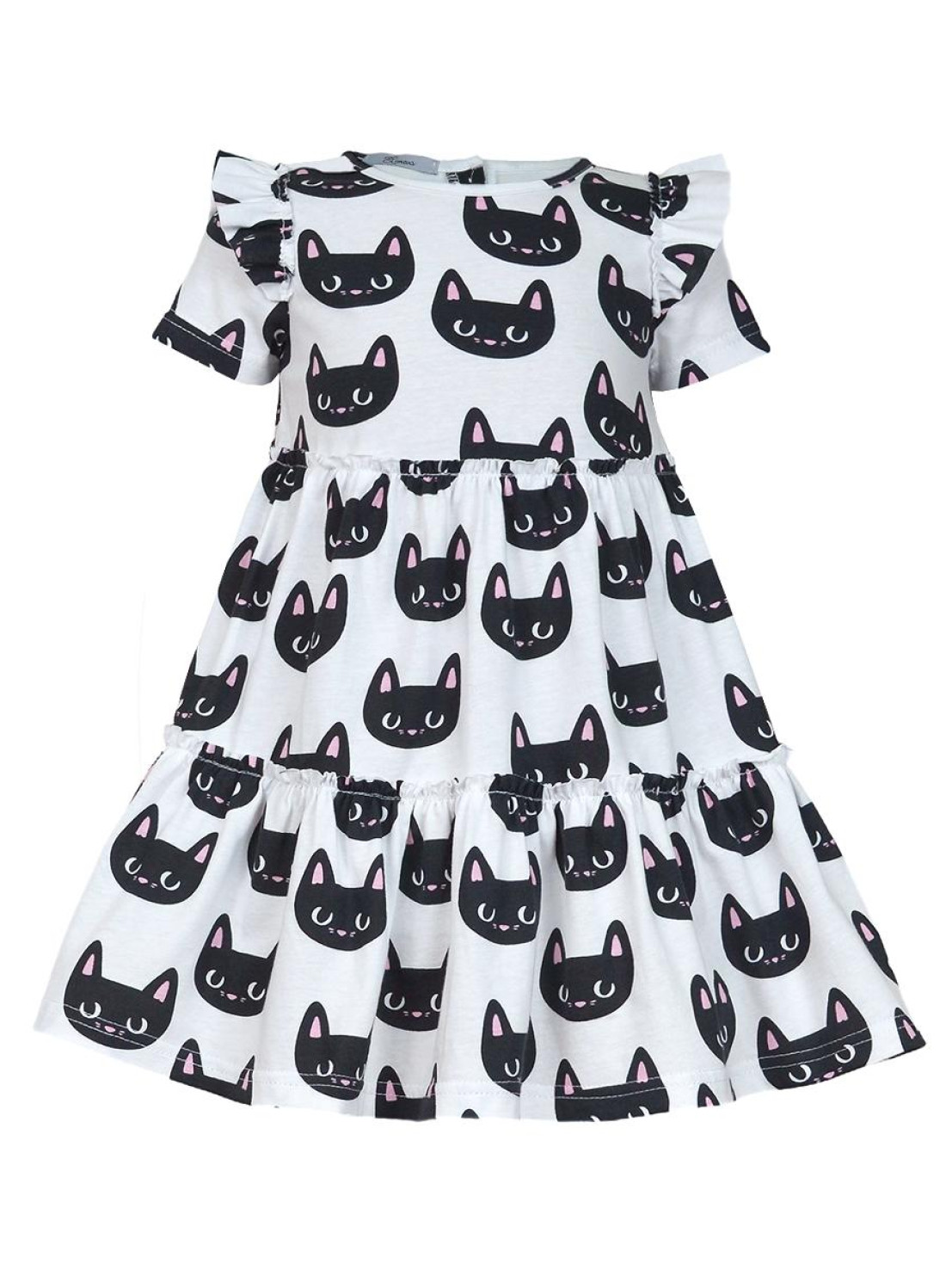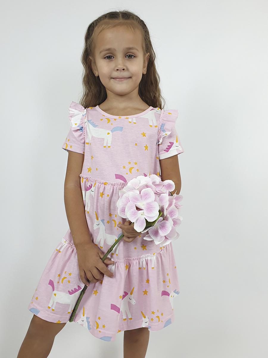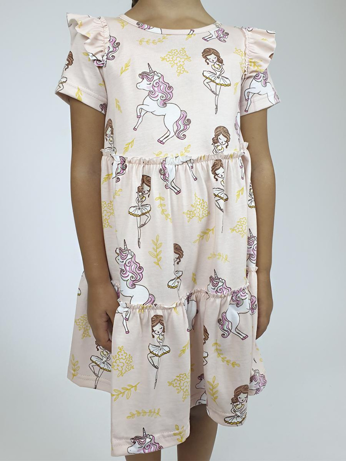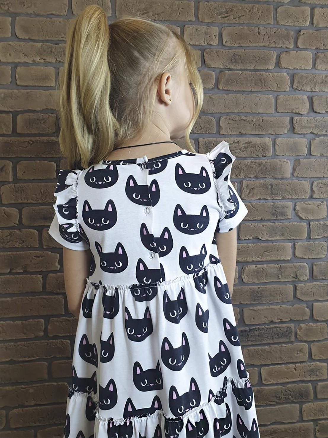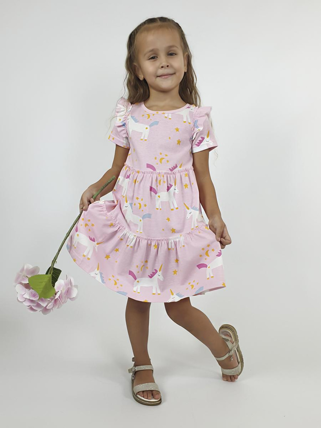 Кулирное полотно:100% х/б. Платье-силуэт трапеция,короткий втачной рукав с настрочной рюшей по пройме.Юбка переда и спинки из двух воланов.Застежка по спинке на пуговицы.Горловина окантована.