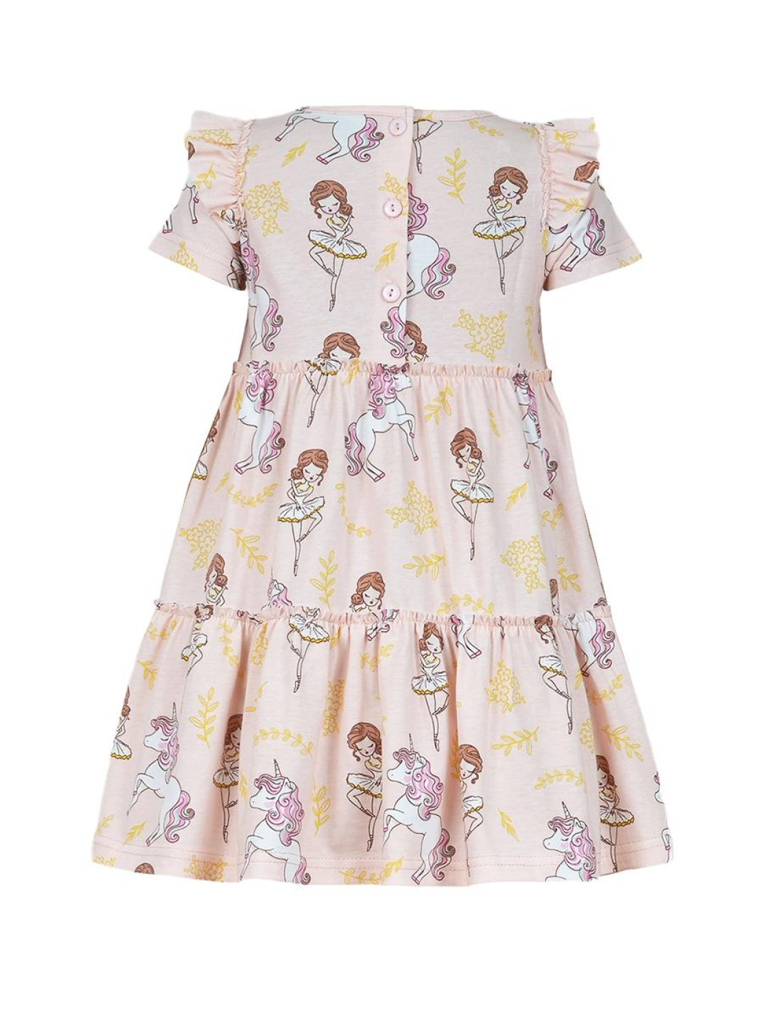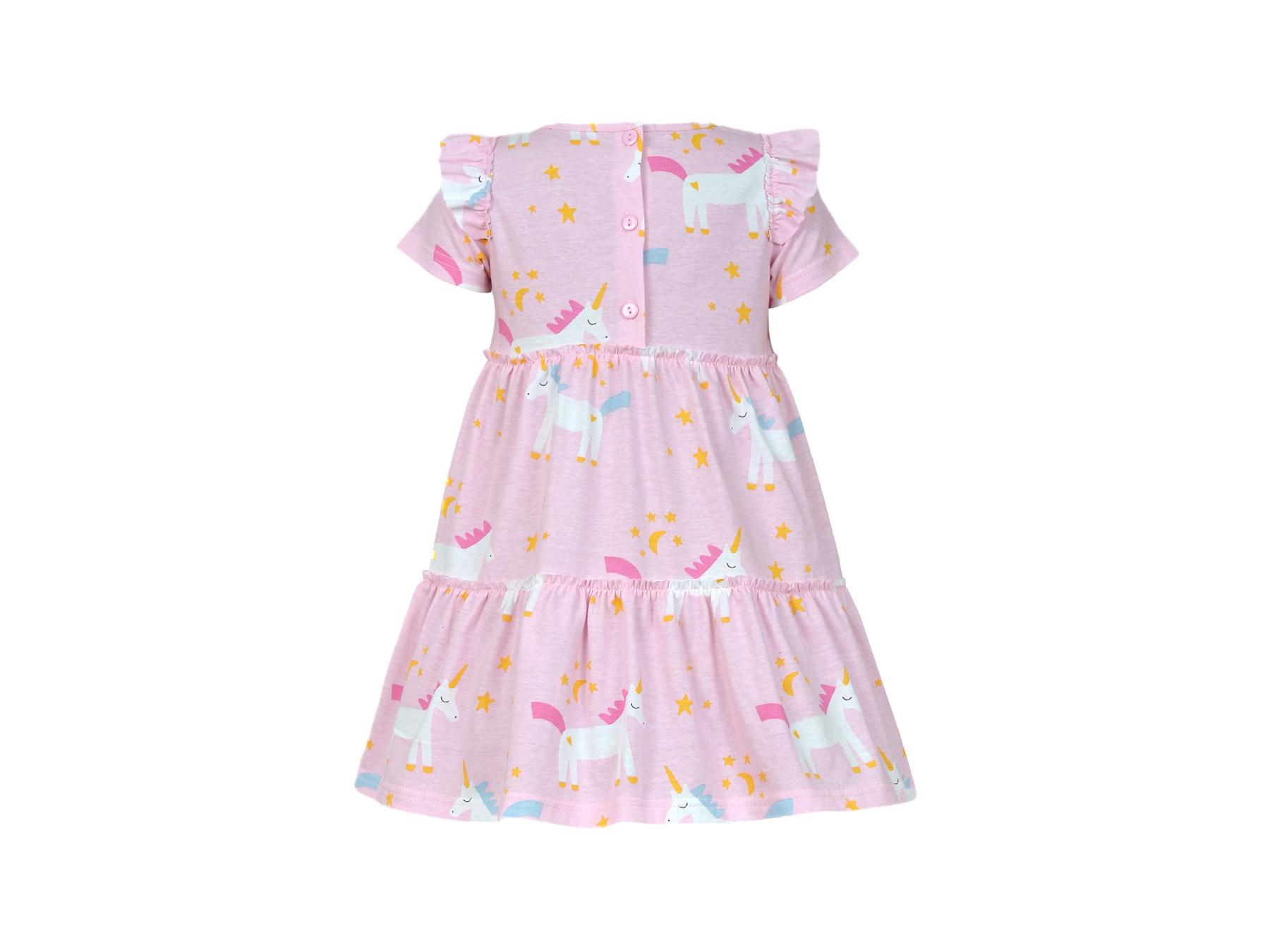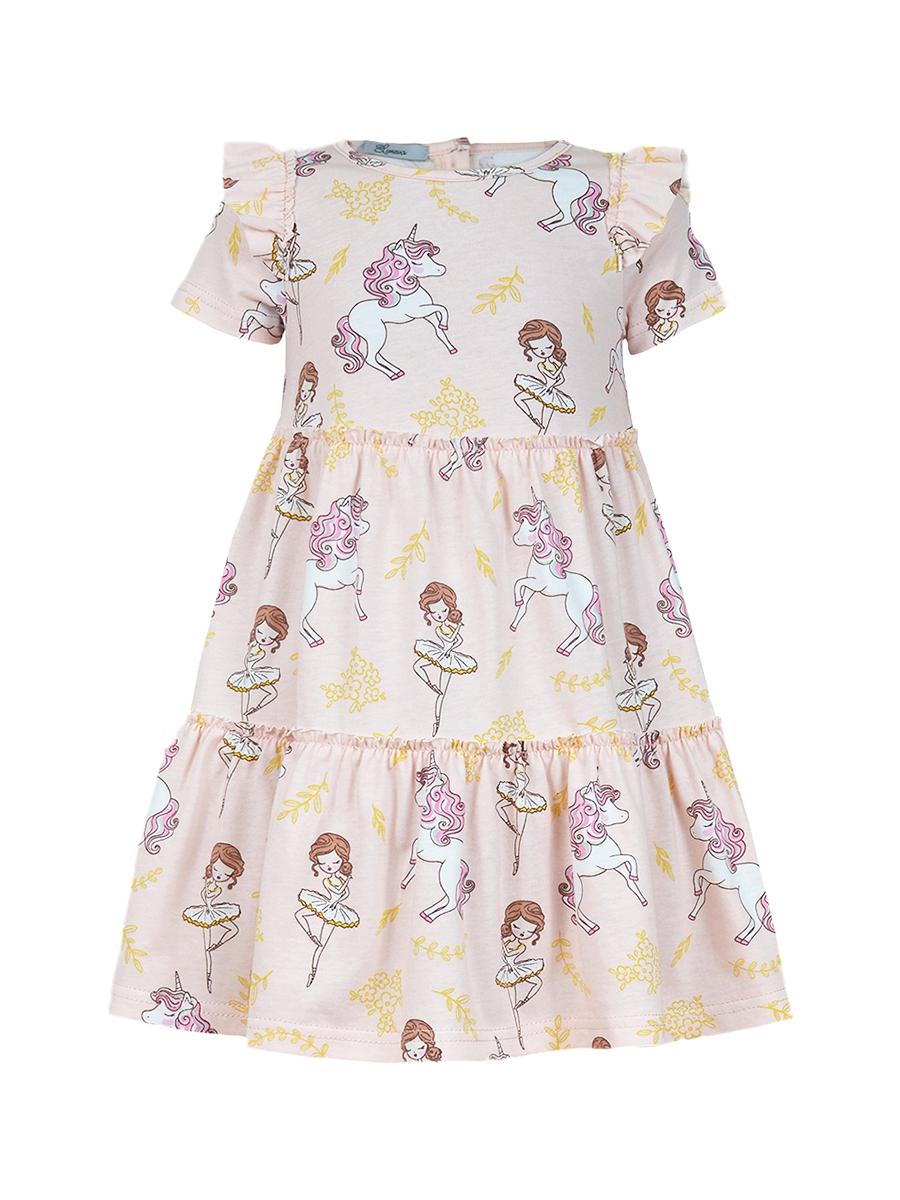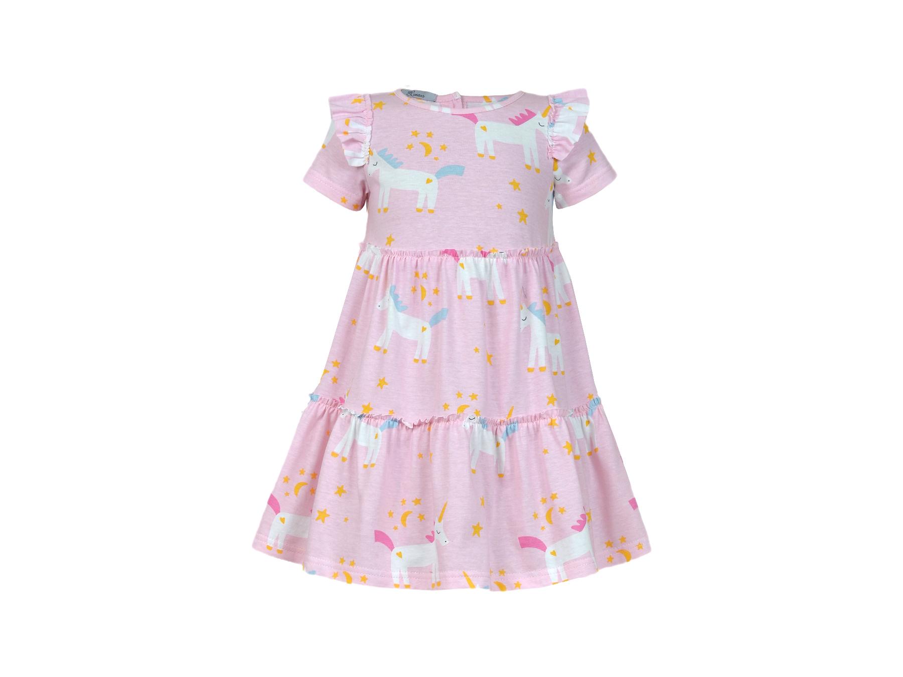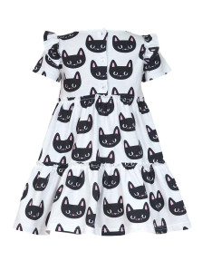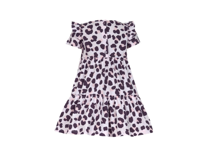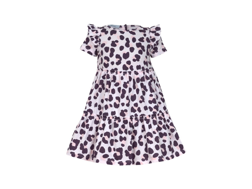 Кулирное полотно:100% х/б. Платье-силуэт трапеция,короткий втачной рукав с настрочной рюшей по пройме.Юбка переда и спинки из двух воланов.Застежка по спинке на пуговицы.Горловина окантована.