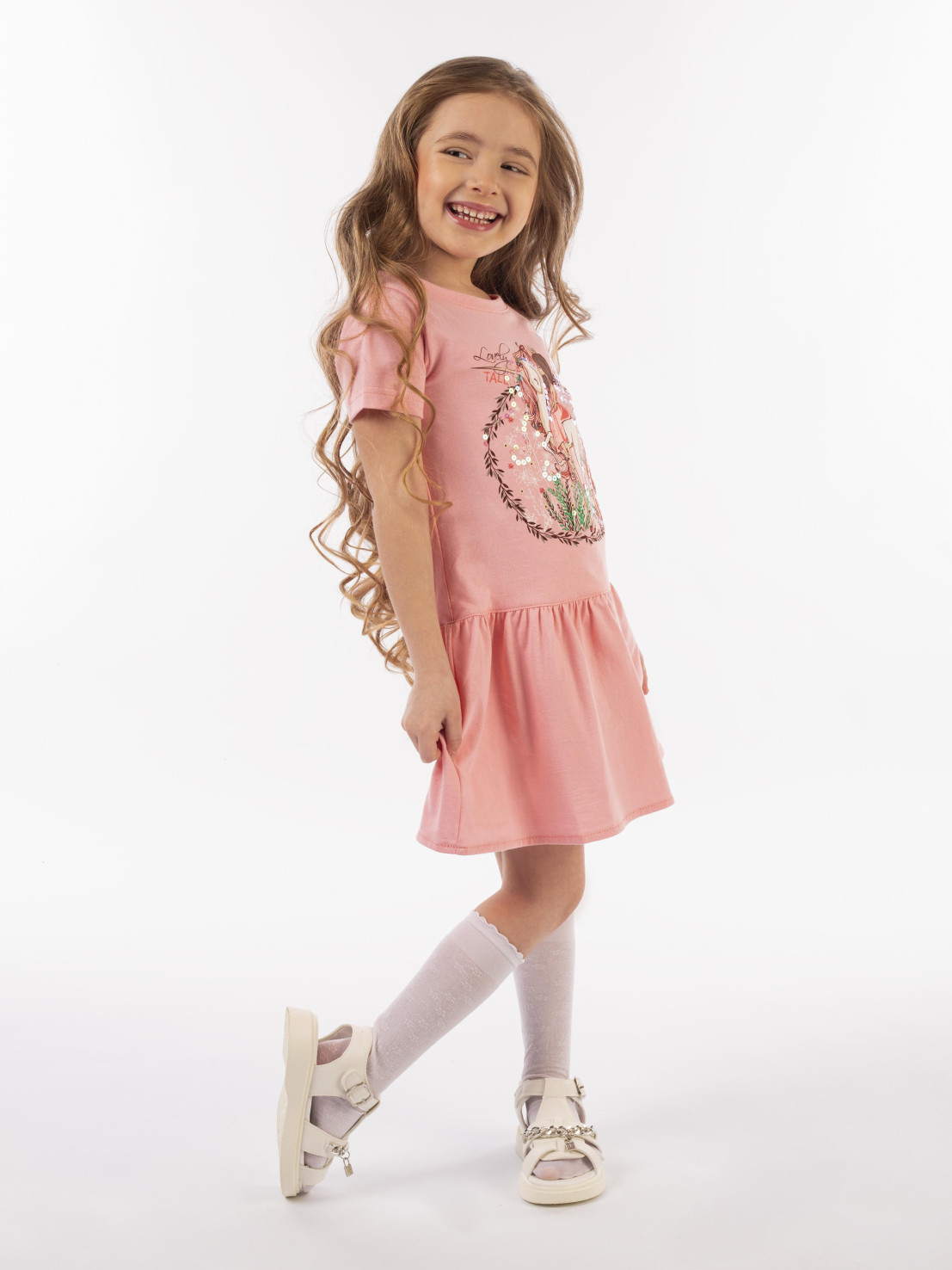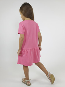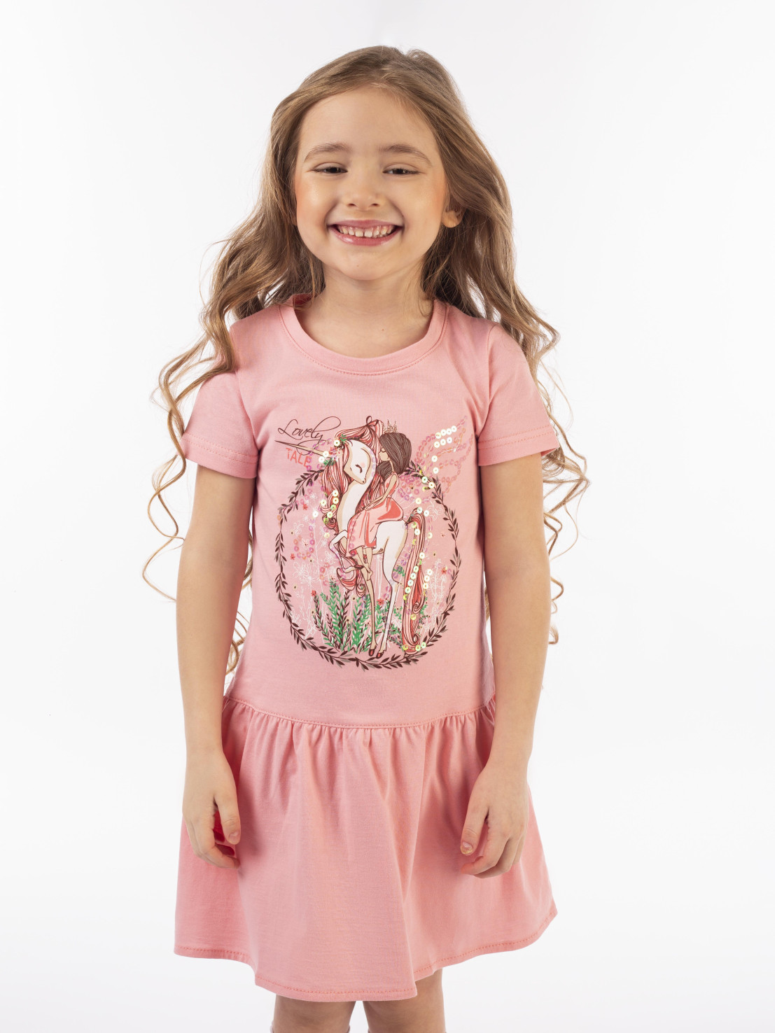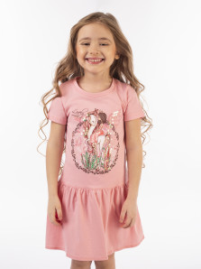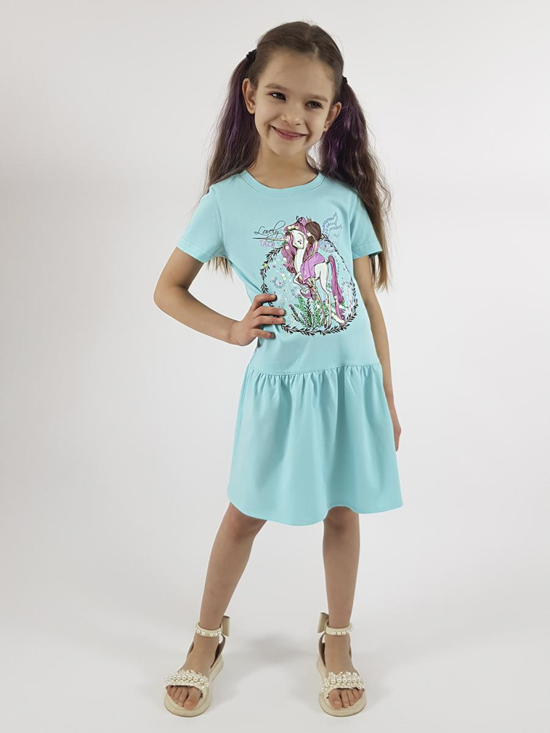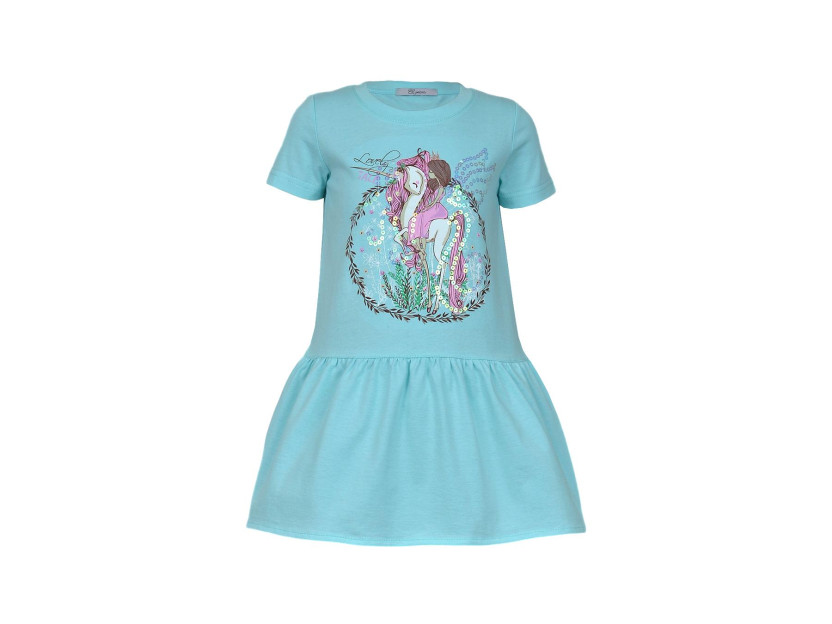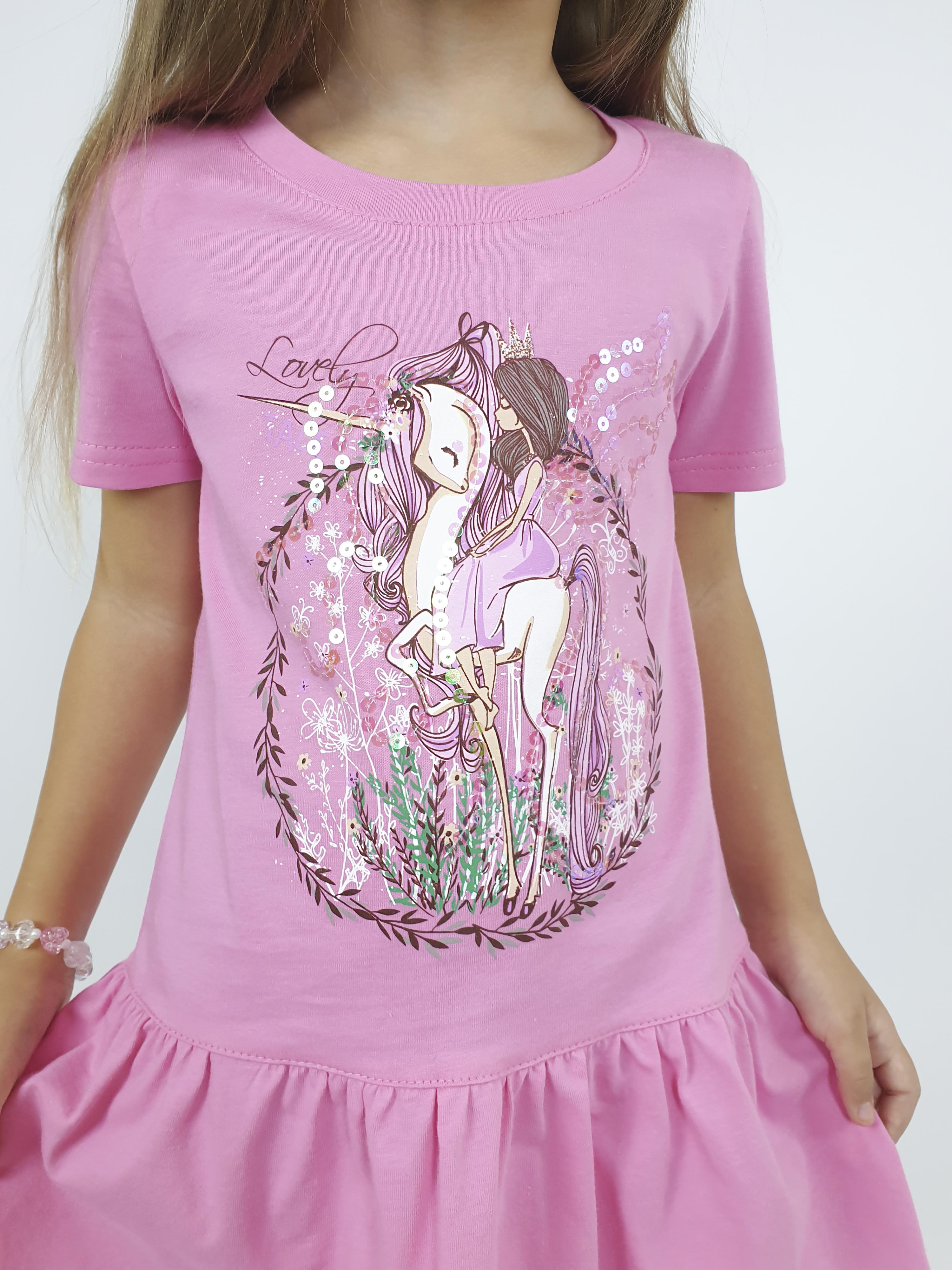 Кулирное полотно: 100% х/б. Платье-силуэт трапеция,короткий рукав,юбка отрезная со сборкой.Горловина обработана планкой.Печать и вышивка(пайетки) на полочке.