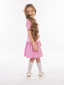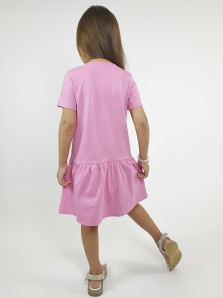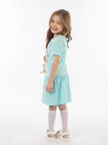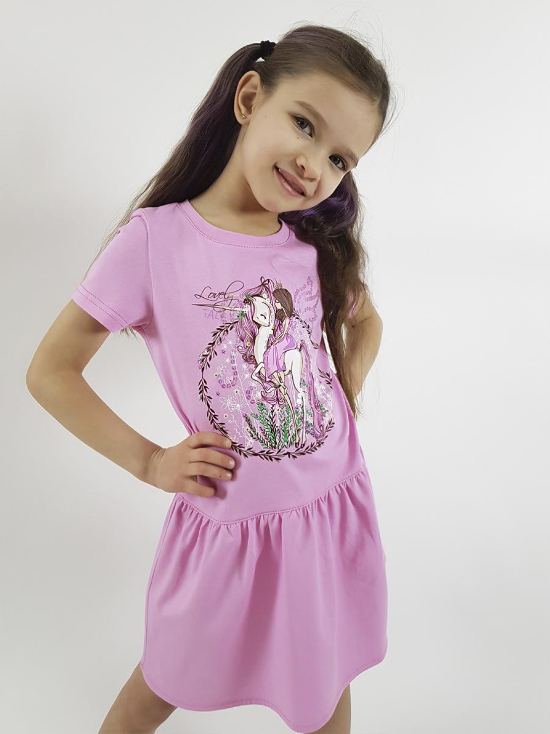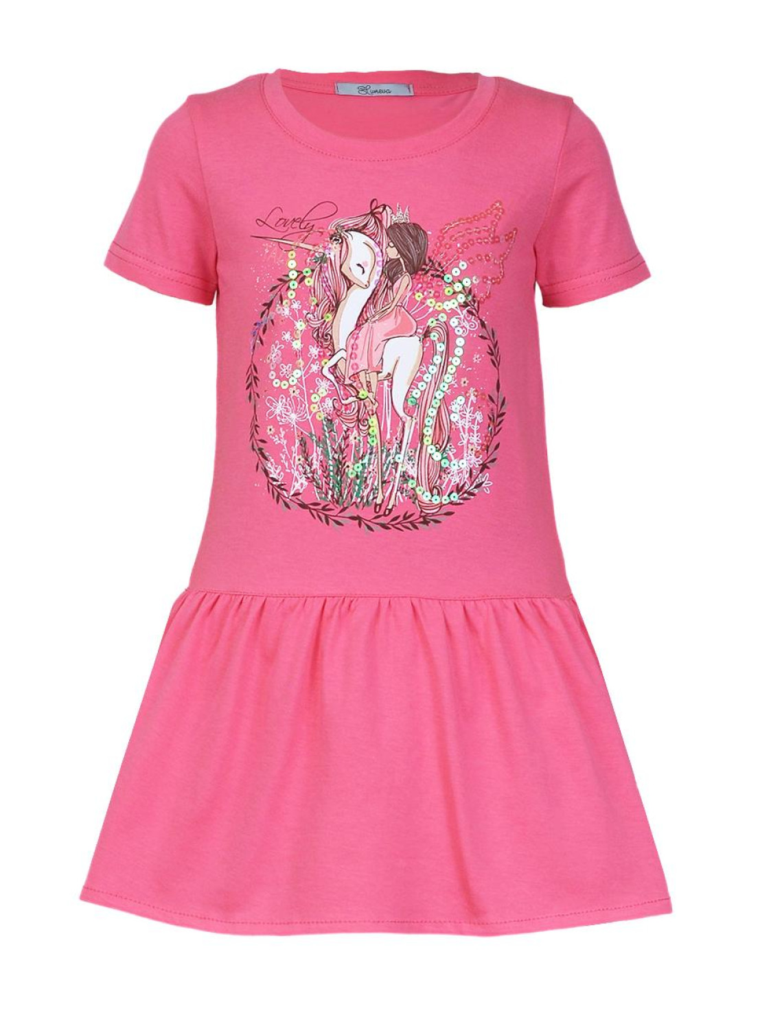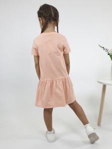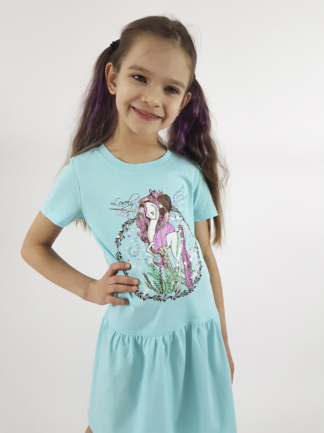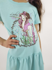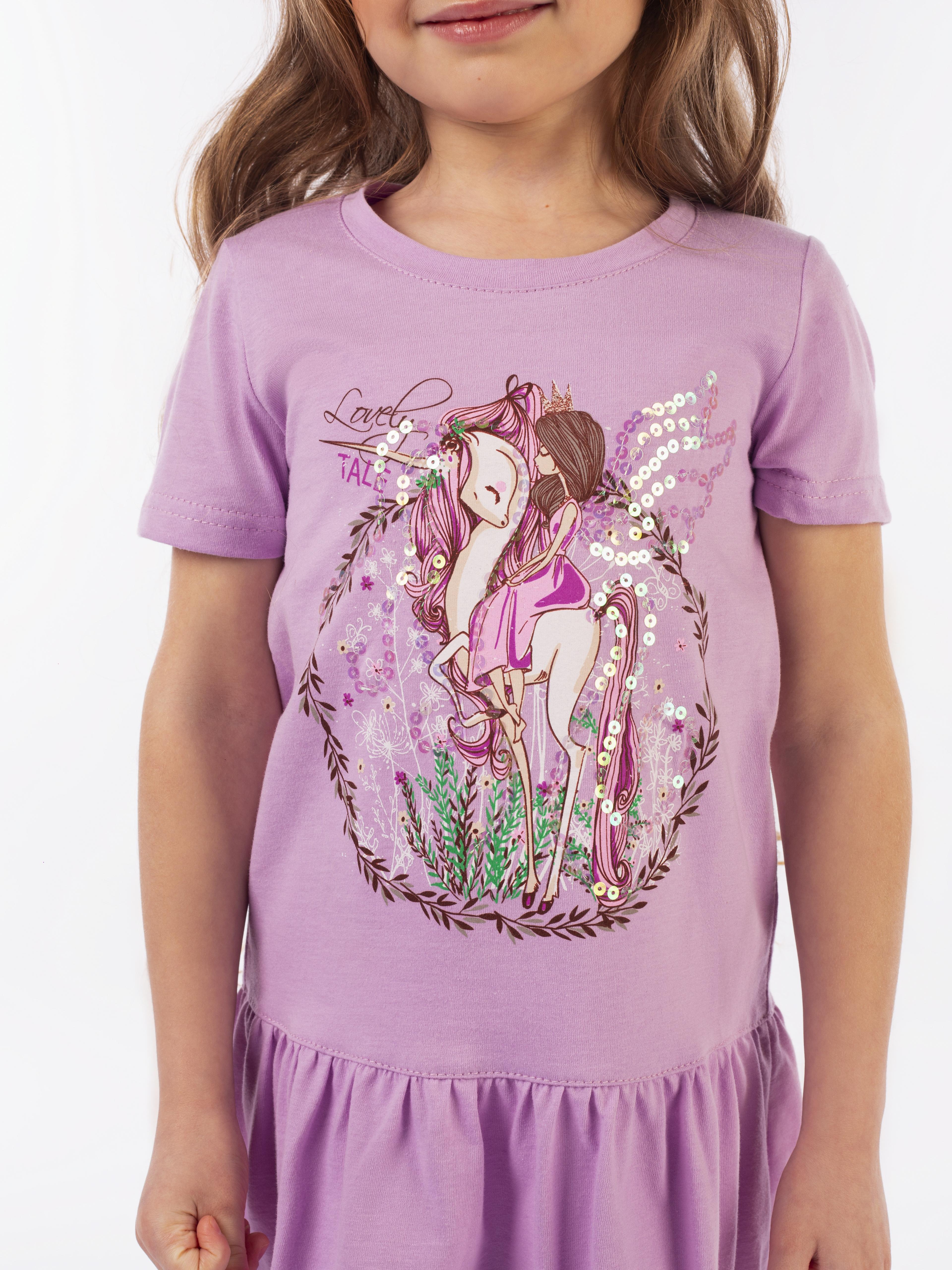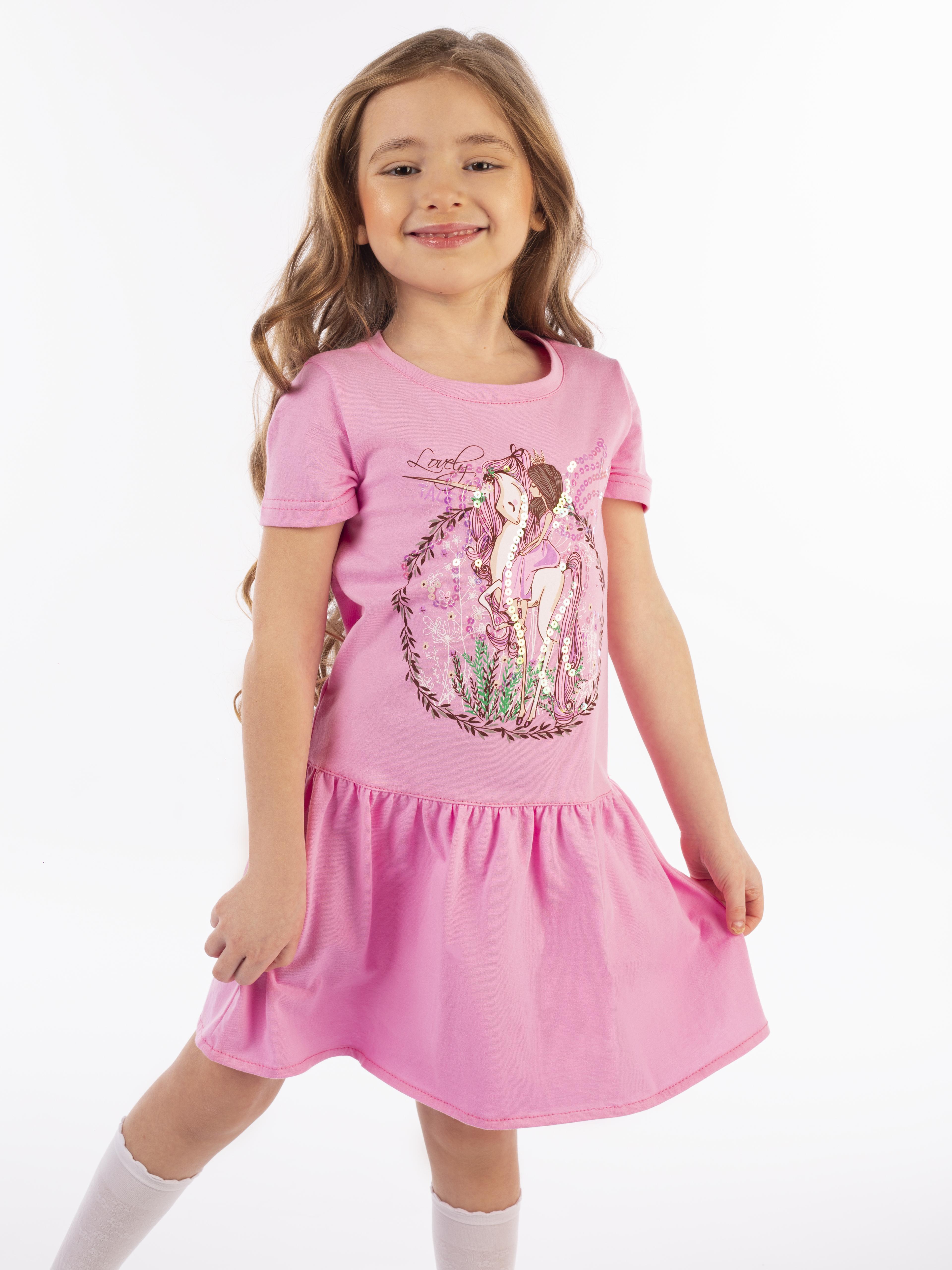 Кулирное полотно: 100% х/б. Платье-силуэт трапеция,короткий рукав,юбка отрезная со сборкой.Горловина обработана планкой.Печать и вышивка(пайетки) на полочке.