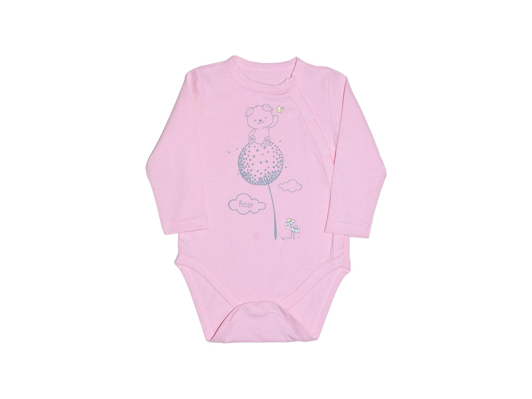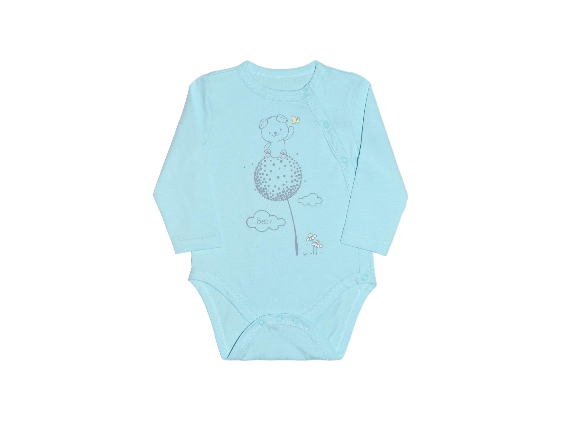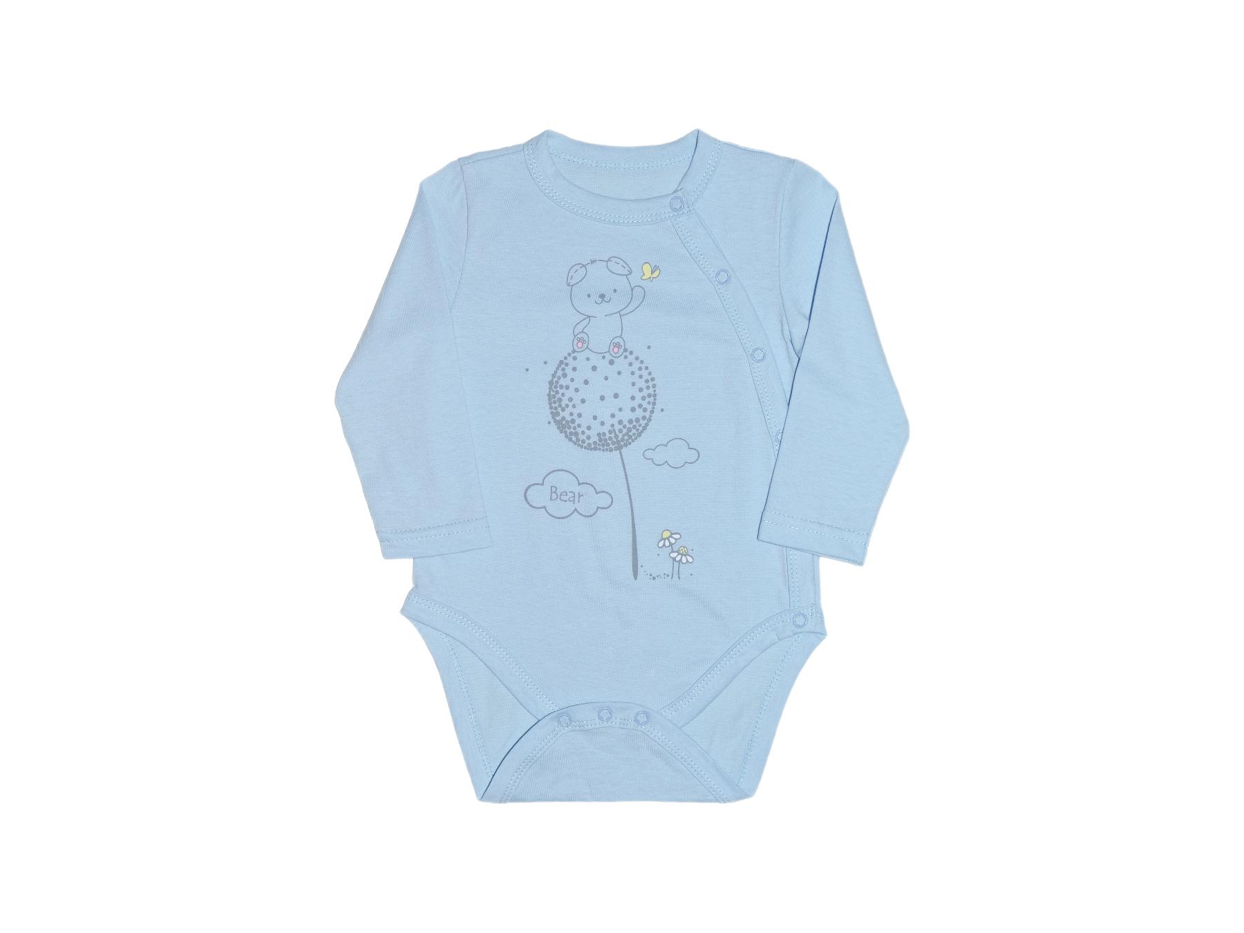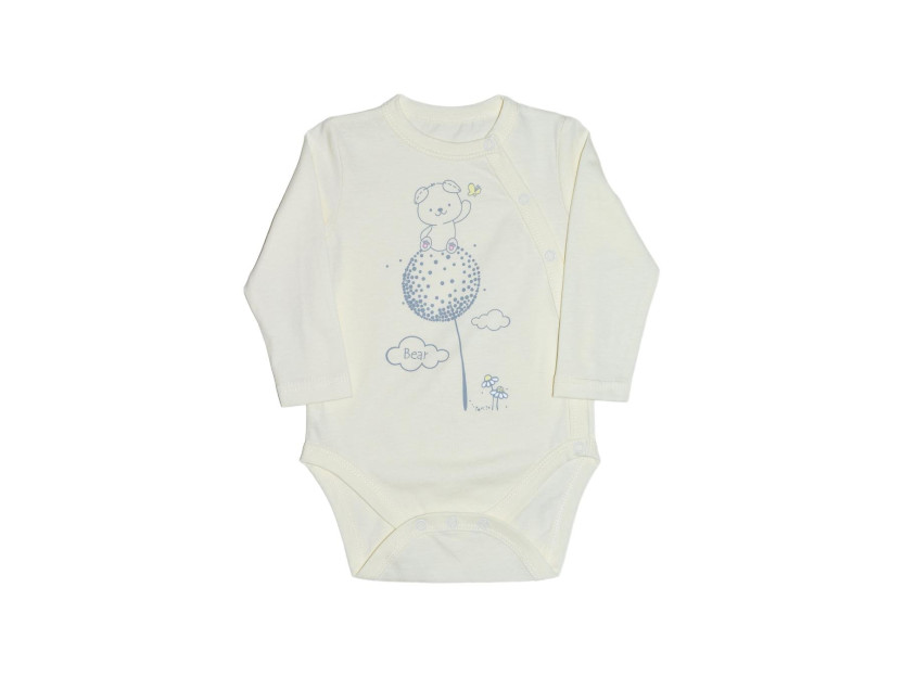 Кулирное полотно: 100% х/б. Полукомбинезон (боди)-застежка ассиметричная на переде слева(справа) и по низу изделия на кнопки. Рукав втачной длинный,печать по переду.Горловина, край борта и низ изделия- окантованы.