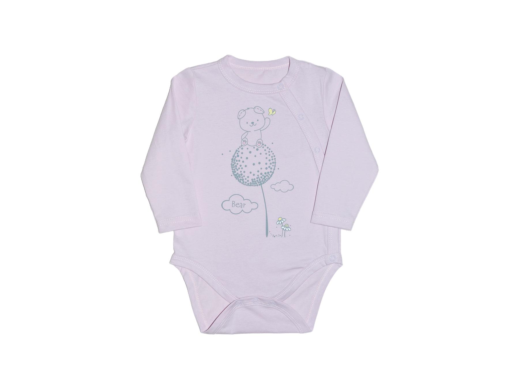 Кулирное полотно: 100% х/б. Полукомбинезон (боди)-застежка ассиметричная на переде слева(справа) и по низу изделия на кнопки. Рукав втачной длинный,печать по переду.Горловина, край борта и низ изделия- окантованы.