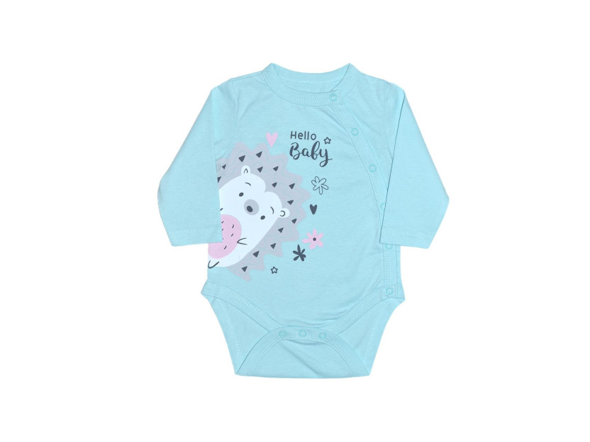 Кулирное полотно:100% х/б. Полукомбинезон(боди)-застежка ассиметричная на переде слева(справа) и по низу изделия на кнопки.Рукав втачной,длинный.Печать по переду.Горловина,край борта и низ изделия-окантованы.