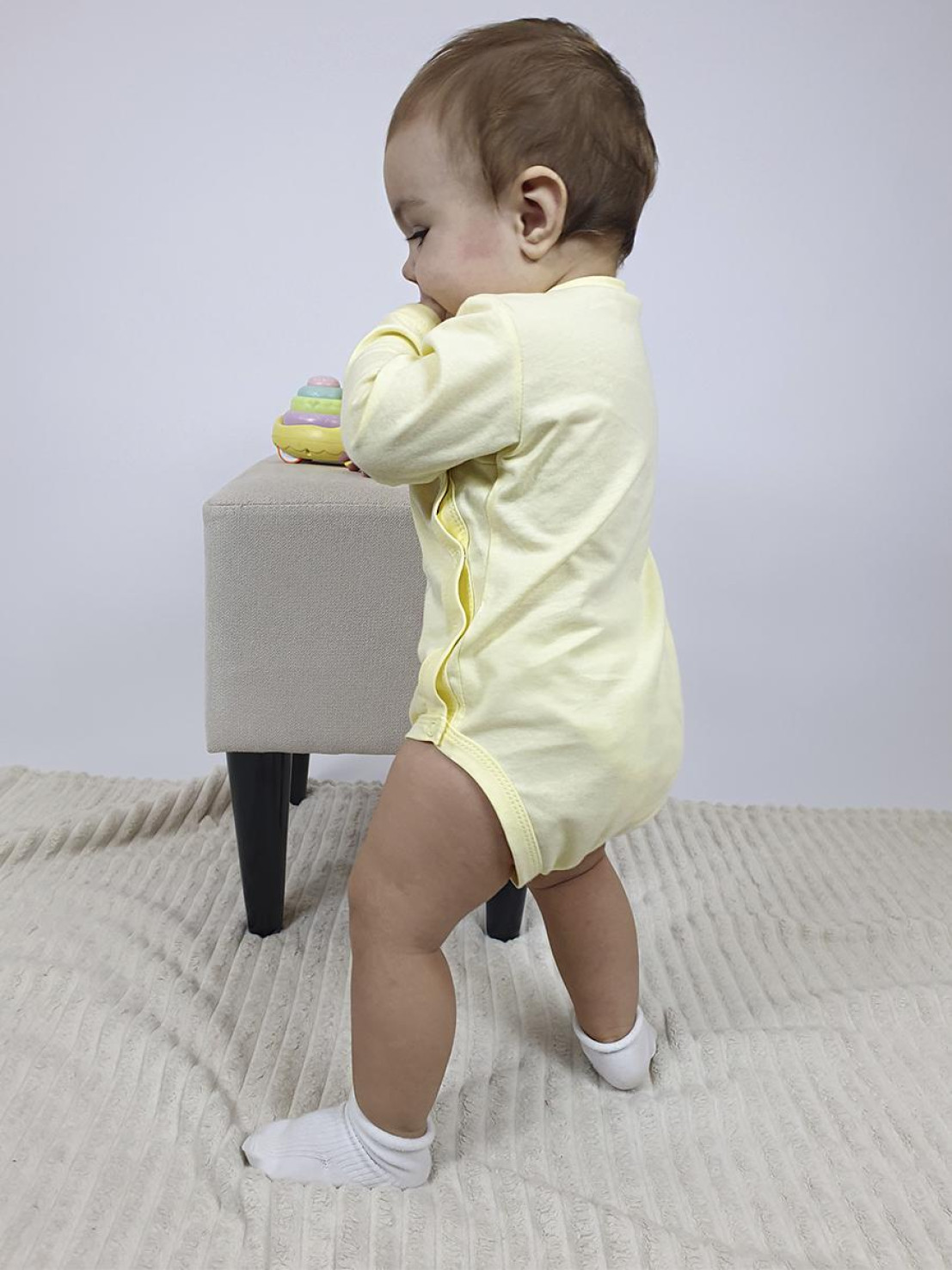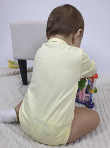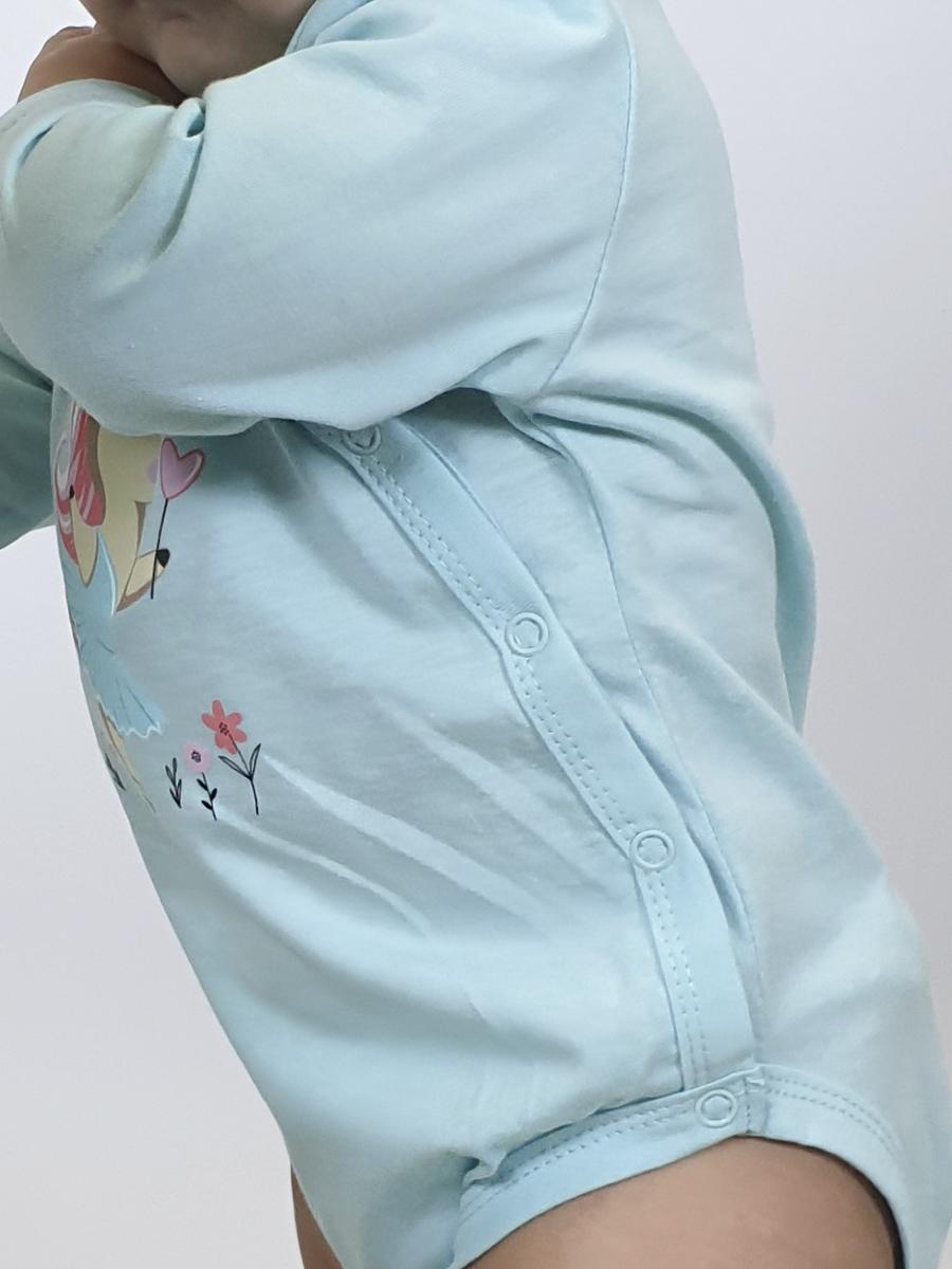 Кулирное полотно:100% х/б. Полукомбинезон(боди)-застежка ассиметричная на переде слева(справа)и по низу изделия на кнопки.Рукав втачной,длинный.Печать по переду.Горловина,край борта и низ изделия-окантованы.