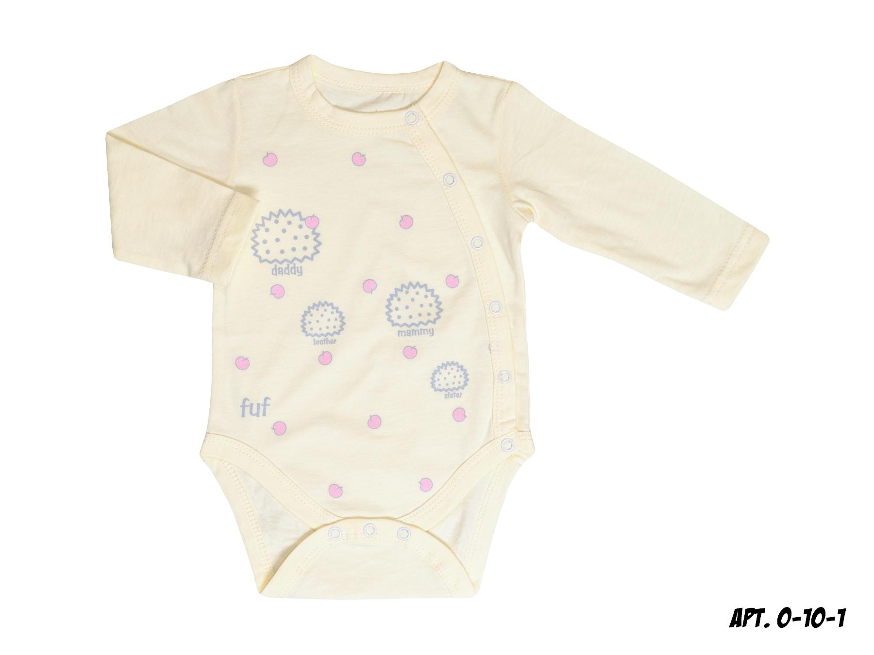 Полукомбинезон (боди). Кулирное полотно, 100% х/б. Застежка ассиметричная на переде слева(справа) и но низу изделия на кнопки. Рукав втачной, длинный, печать на переде. Горловина, край борта и низ изделия окантованы.