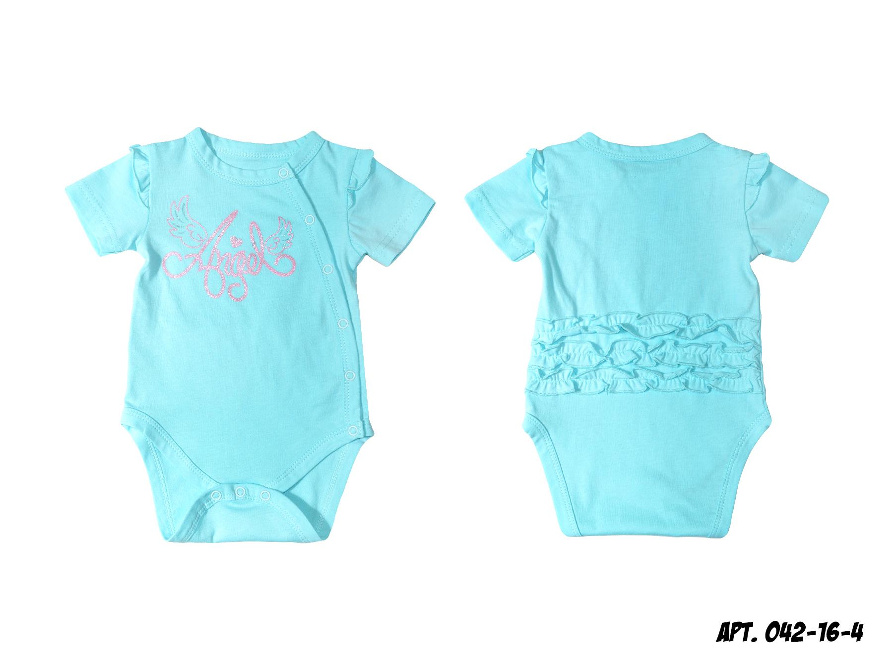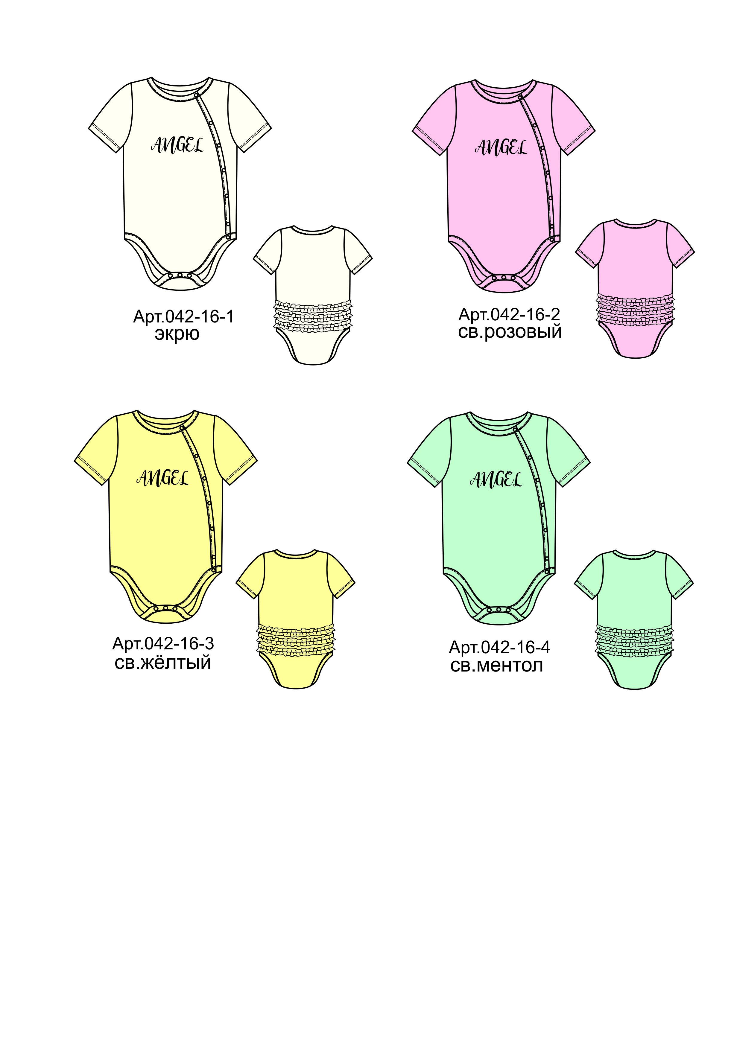 Трикотажное полотно 100% х/б. Полукомбинезон (боди). Печать на переде, рукав втачной, короткий, по окату рукава вставлена рюша. На спинке в области бедер настрочены три рюши. Застежка ассиметричная, на кнопки. Горловина, низ изделия окантованы.