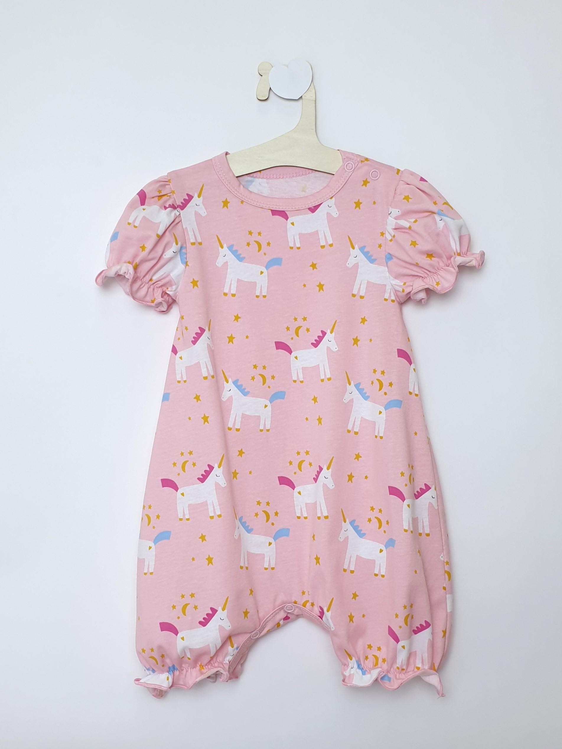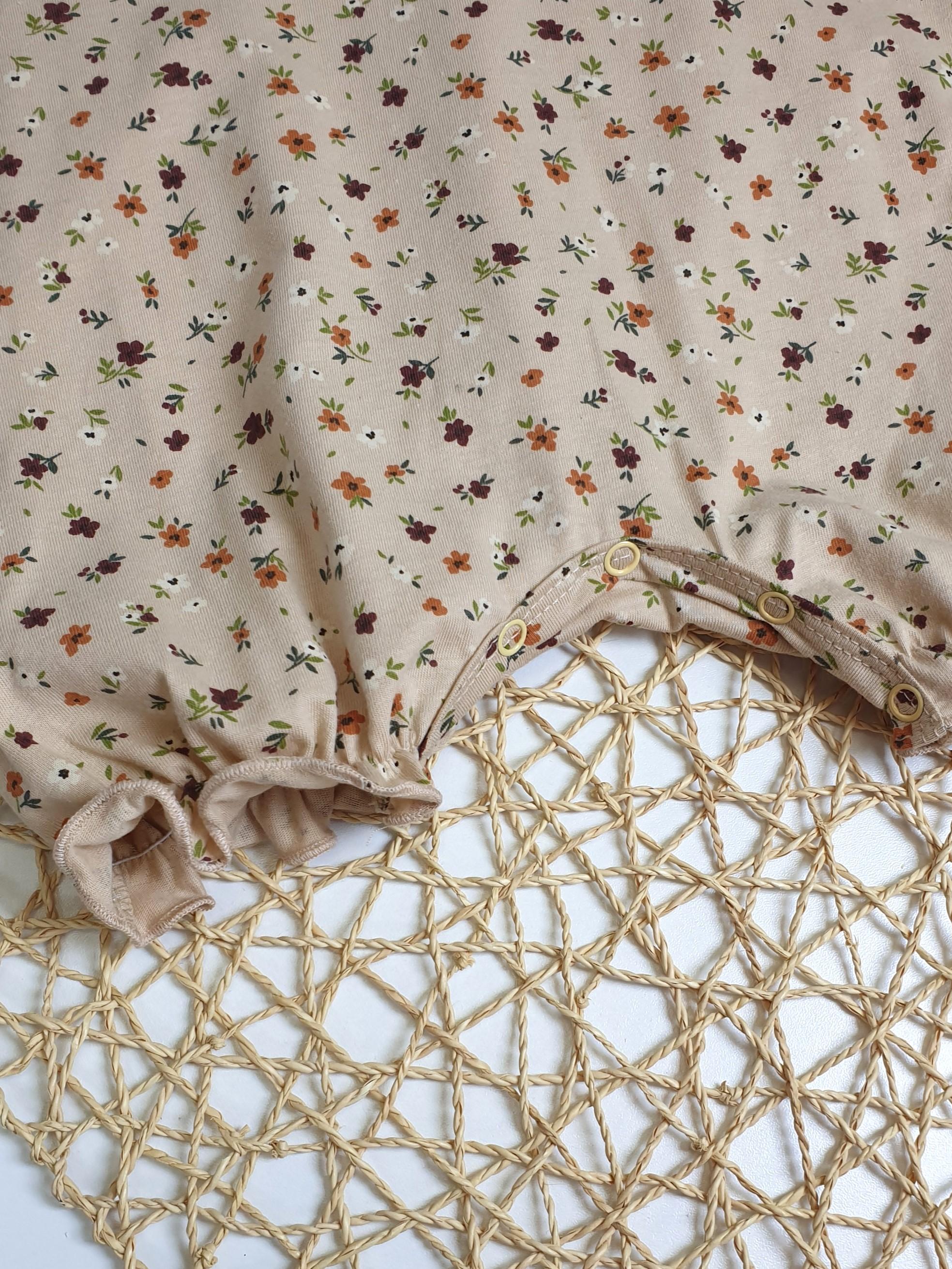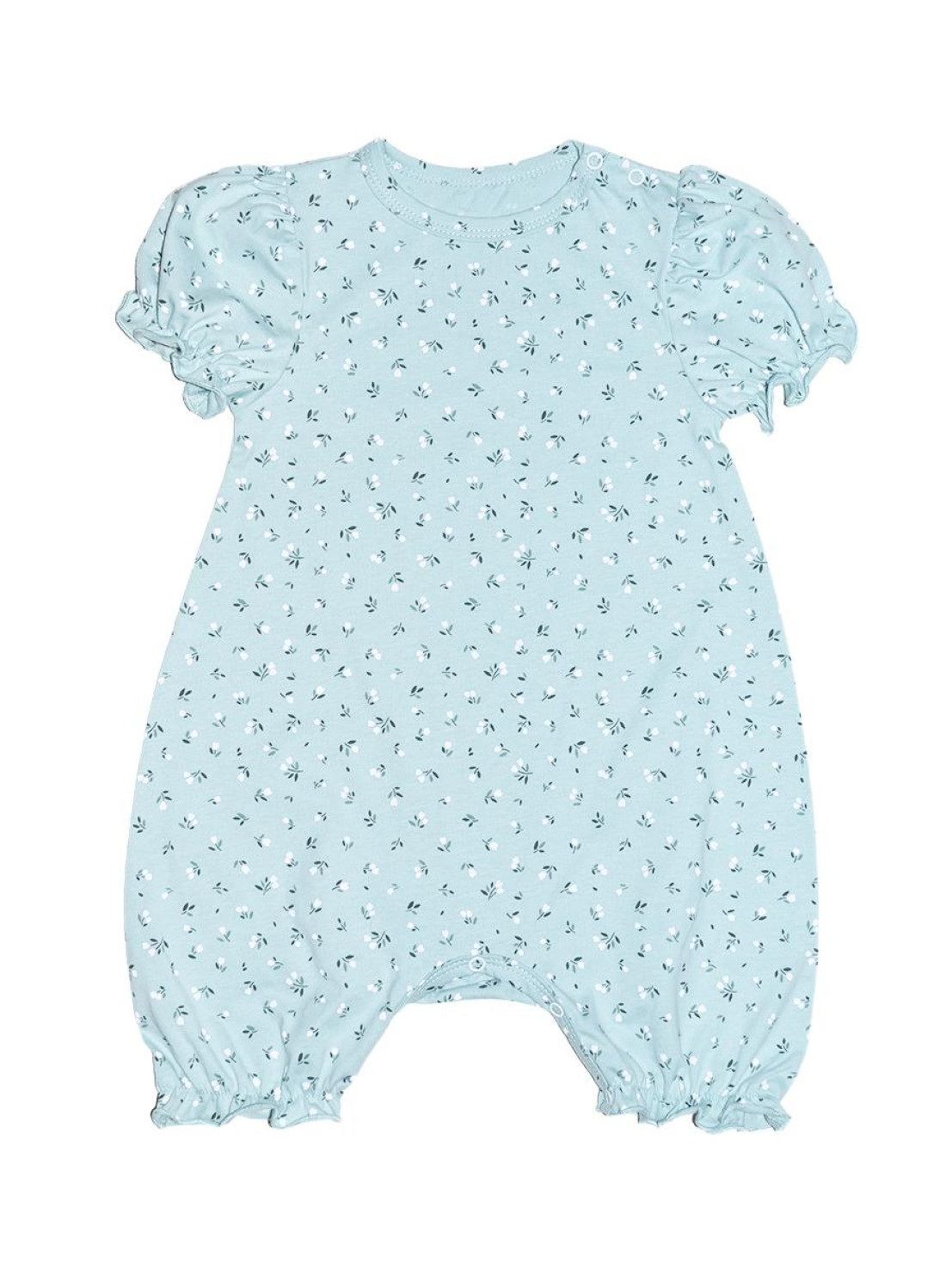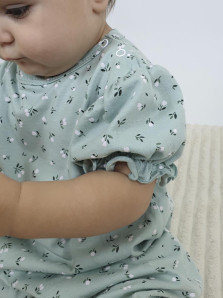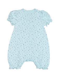 Кулирное полотно(набивка):100% х/б. Полукомбинезон-свободный,рукав короткий"фонарик".Горловина окантована,застежка в плече и по шаговому на кнопки.Внизу ножки собраны на резинку-венгерку.
