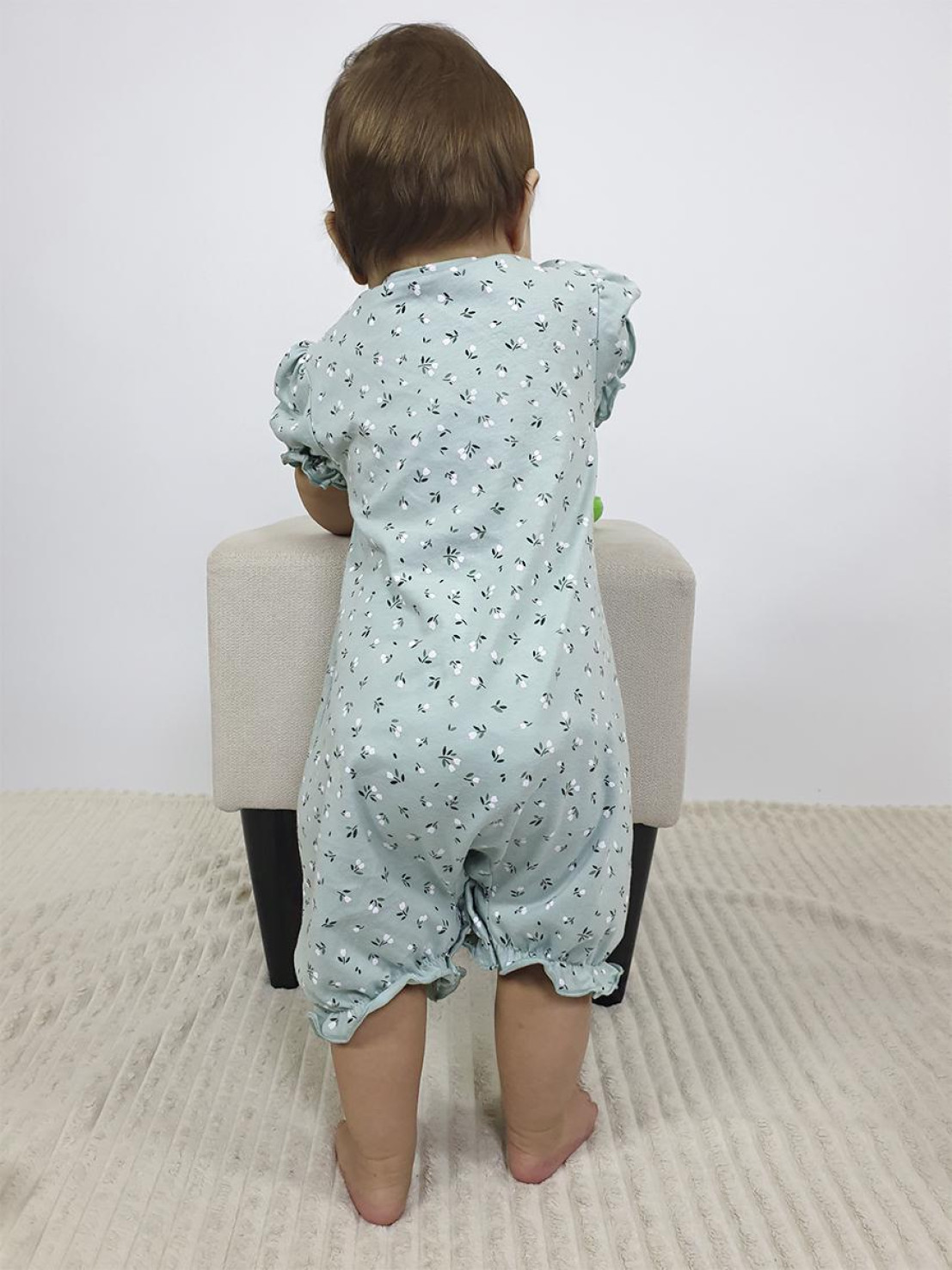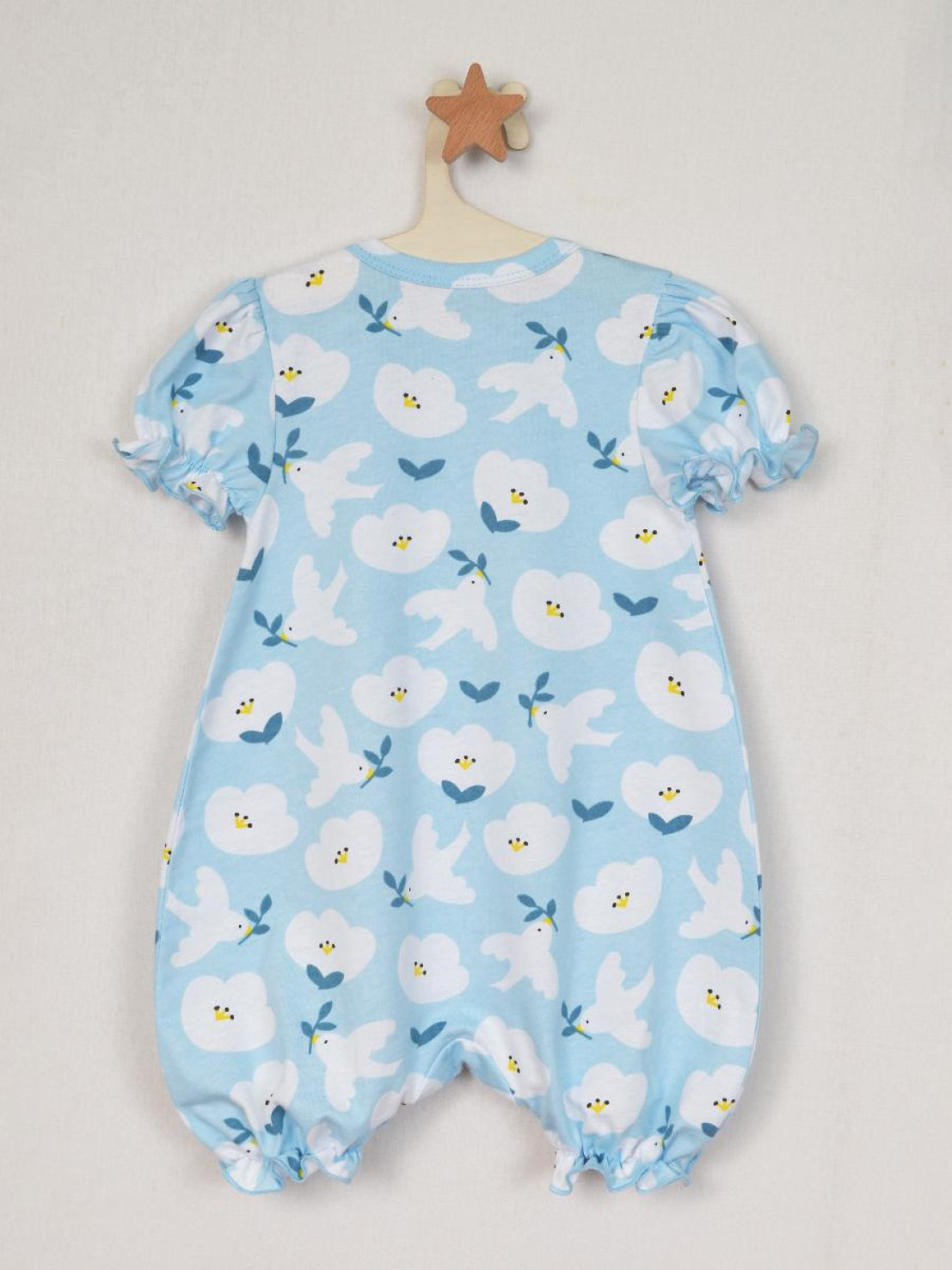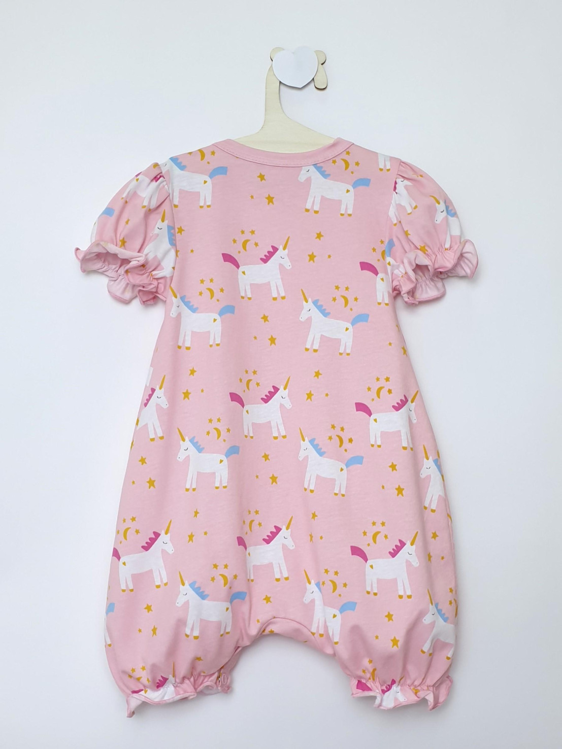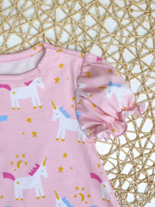 Кулирное полотно(набивка):100% х/б. Полукомбинезон-свободный,рукав короткий"фонарик".Горловина окантована,застежка в плече и по шаговому на кнопки.Внизу ножки собраны на резинку-венгерку.