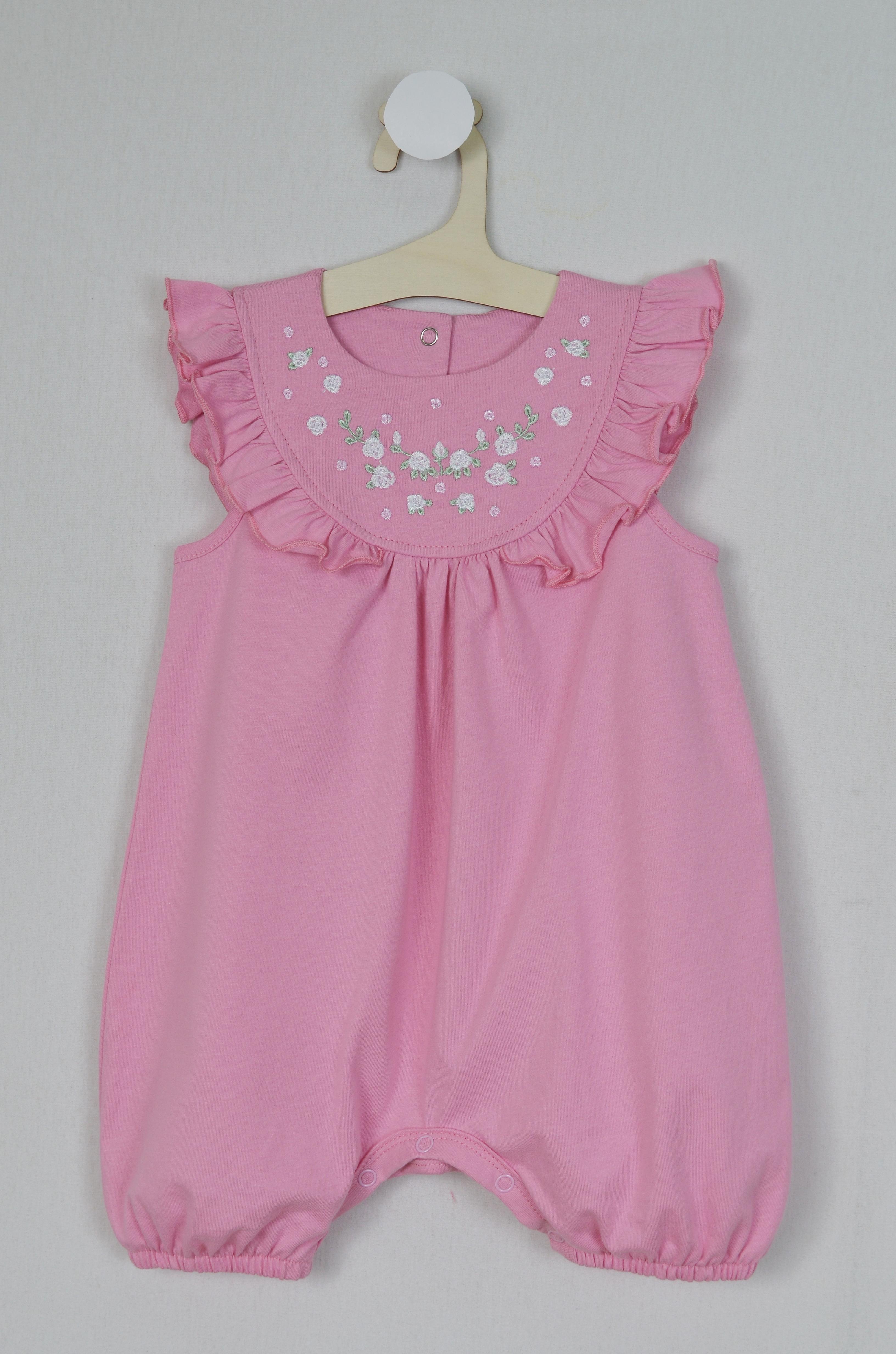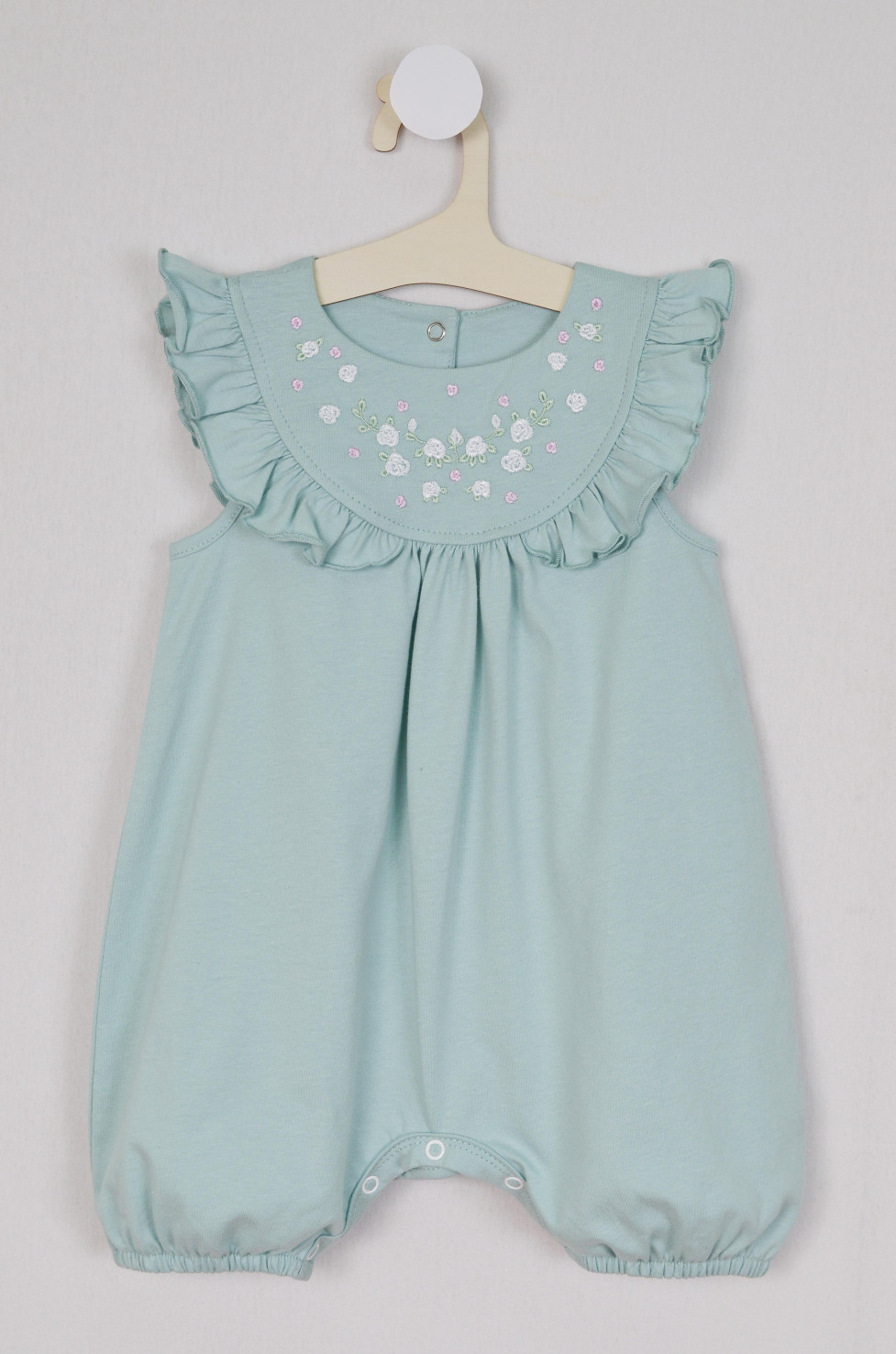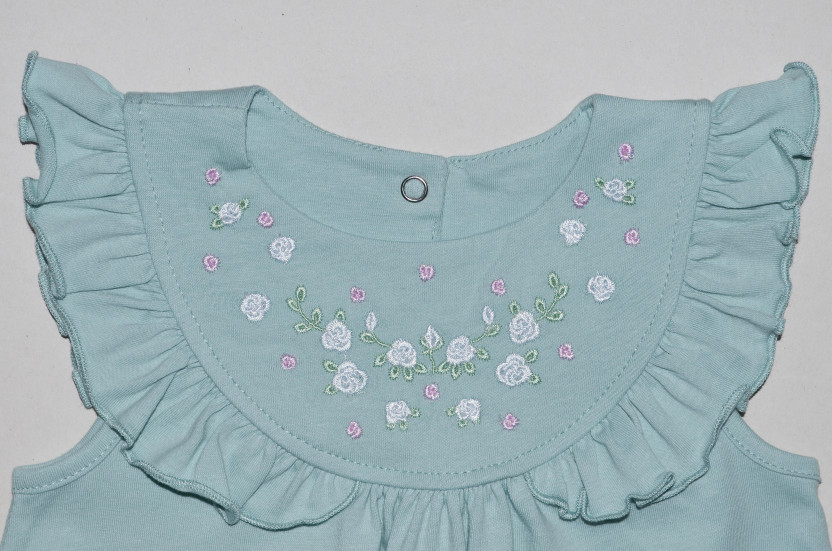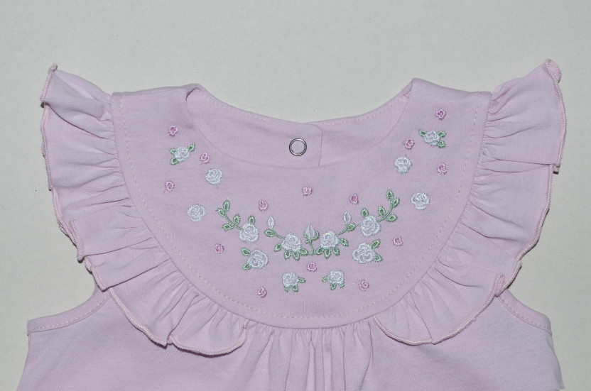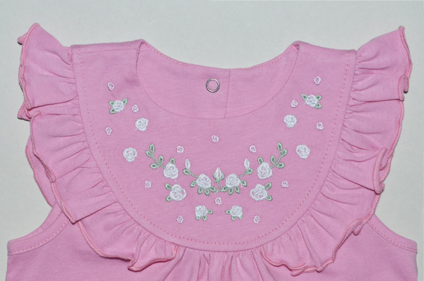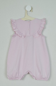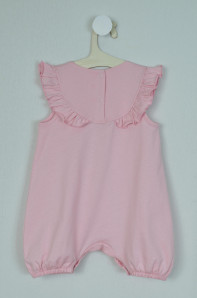Кулирное полотно:100% х/б. Полукомбинезон-свободный,перед и спинка с кокеткой и рюшей.Горловина обработана обтачкой.Застежка по спинке и по шаговому на кнопки.Низ ножек на резинке.