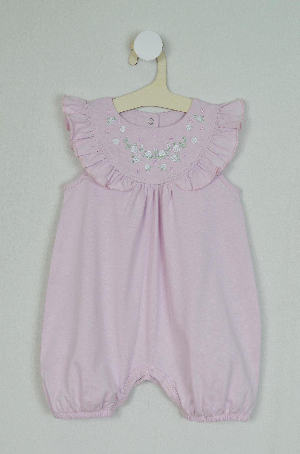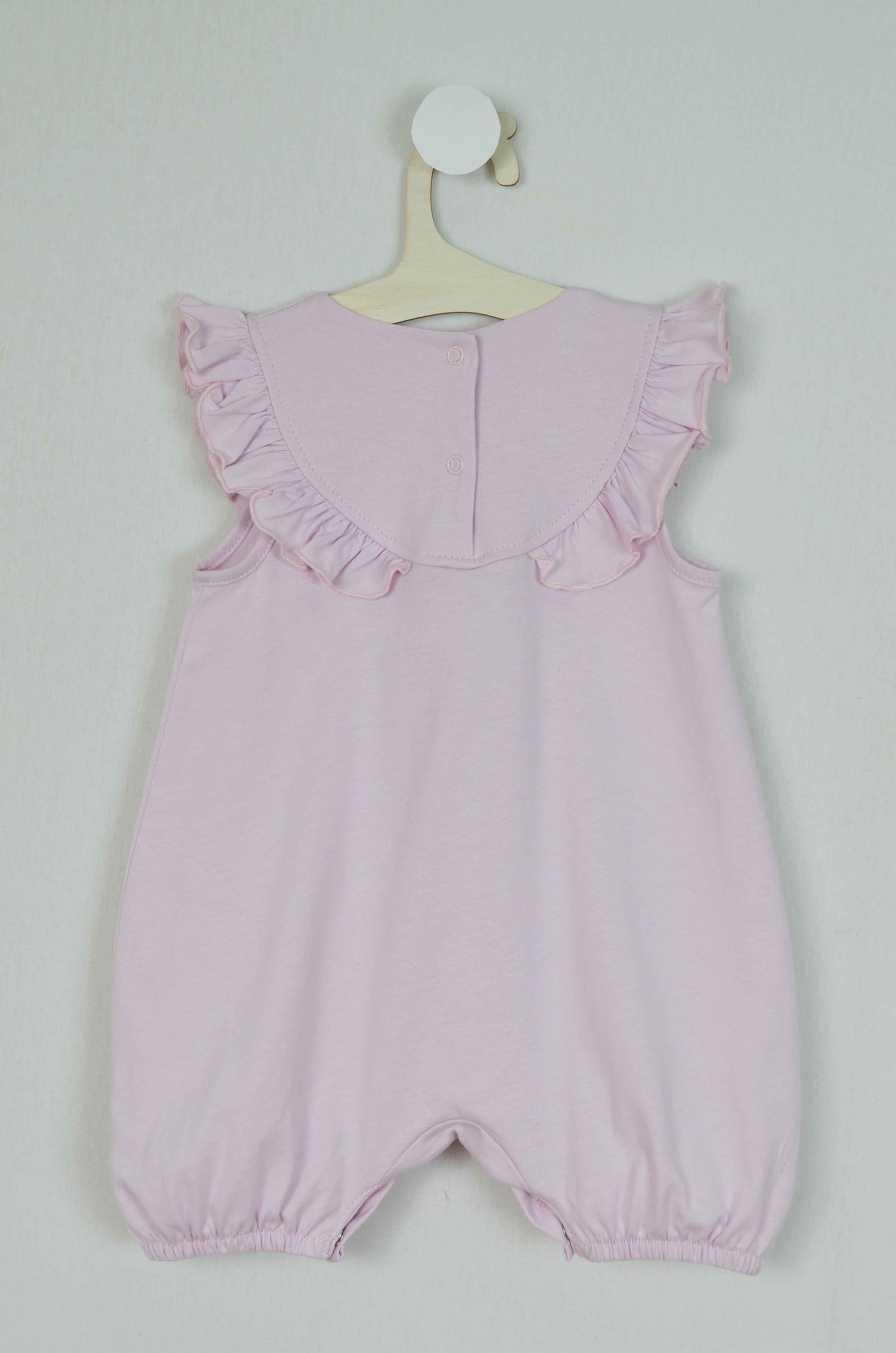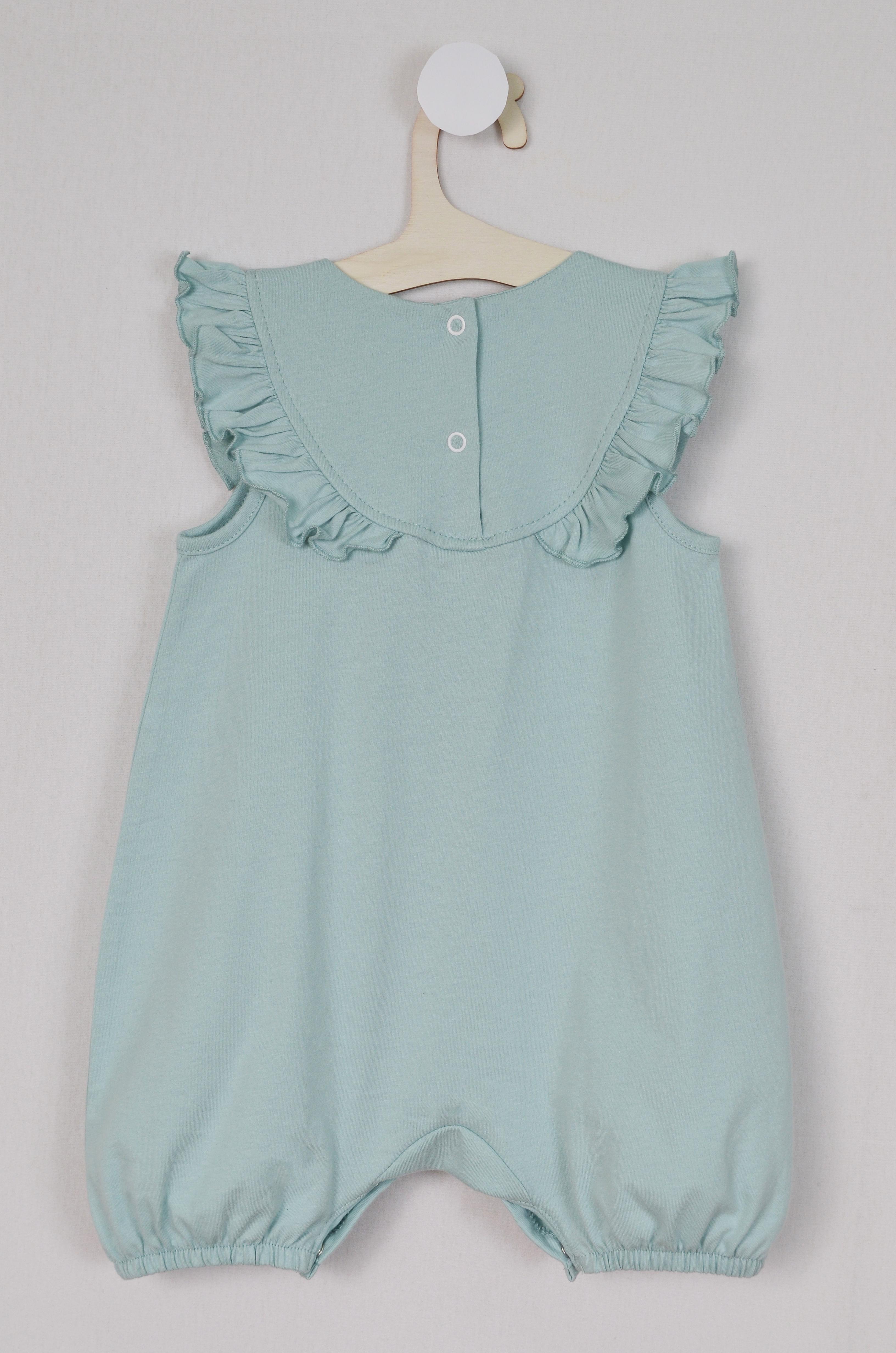 Кулирное полотно:100% х/б. Полукомбинезон-свободный,перед и спинка с кокеткой и рюшей.Горловина обработана обтачкой.Застежка по спинке и по шаговому на кнопки.Низ ножек на резинке.