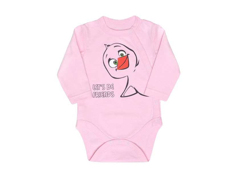 Кулирное полотно 100% х/б. Полукомбинезон (боди).Застежка ассиметричная на переде слева(справа) и по низу изделия на кнопки. Рукав втачной длинный, печать на переде. Горловина, край борта и низ изделия окантованы.