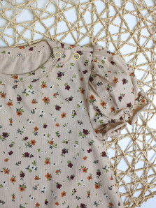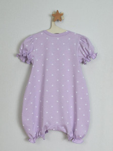 Кулирное полотно(набивка):100% х/б. Полукомбинезон-свободный,рукав короткий"фонарик".Горловина окантована,застежка в плече и по шаговому на кнопки.Внизу ножки собраны на резинку-венгерку.