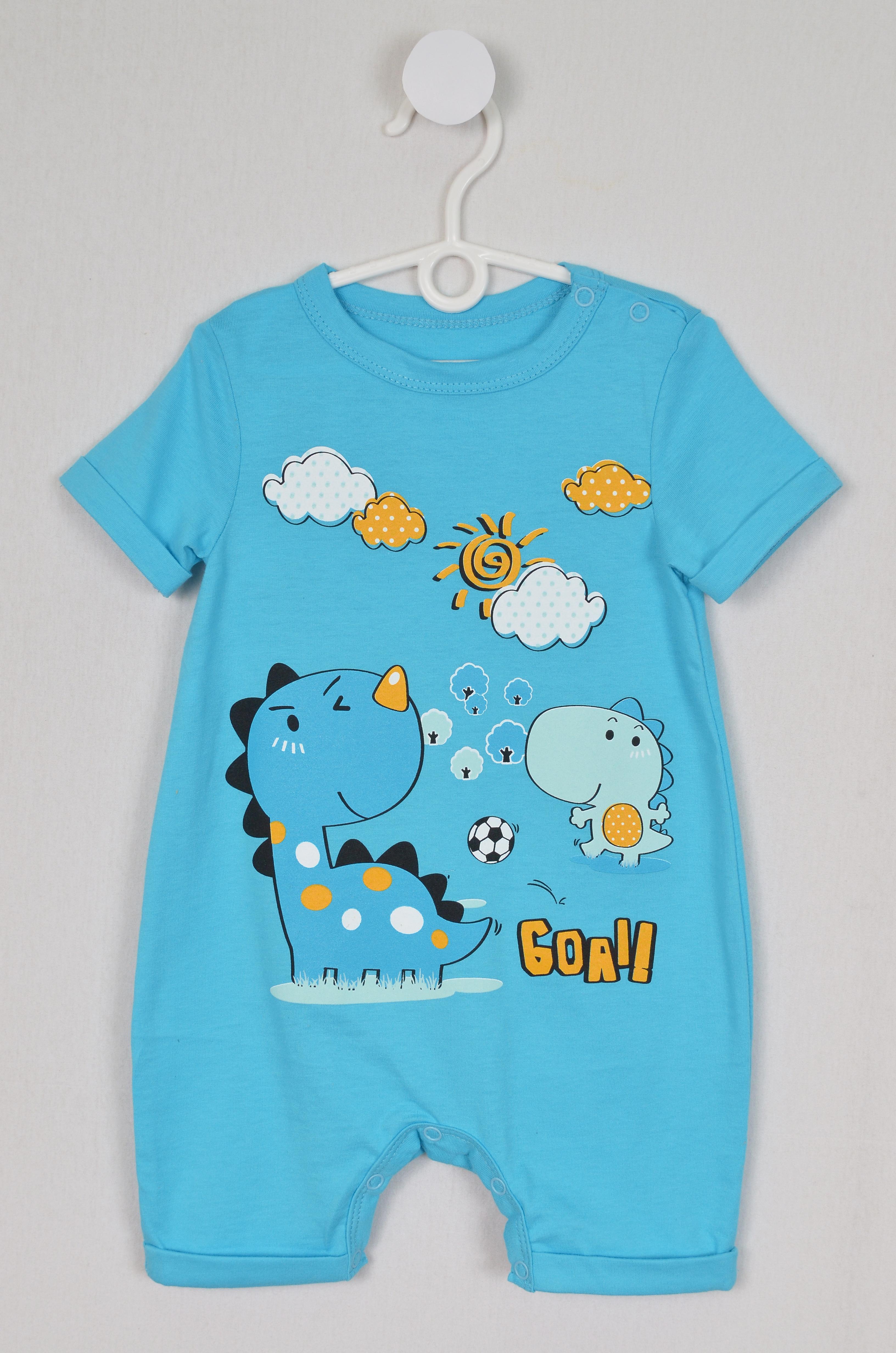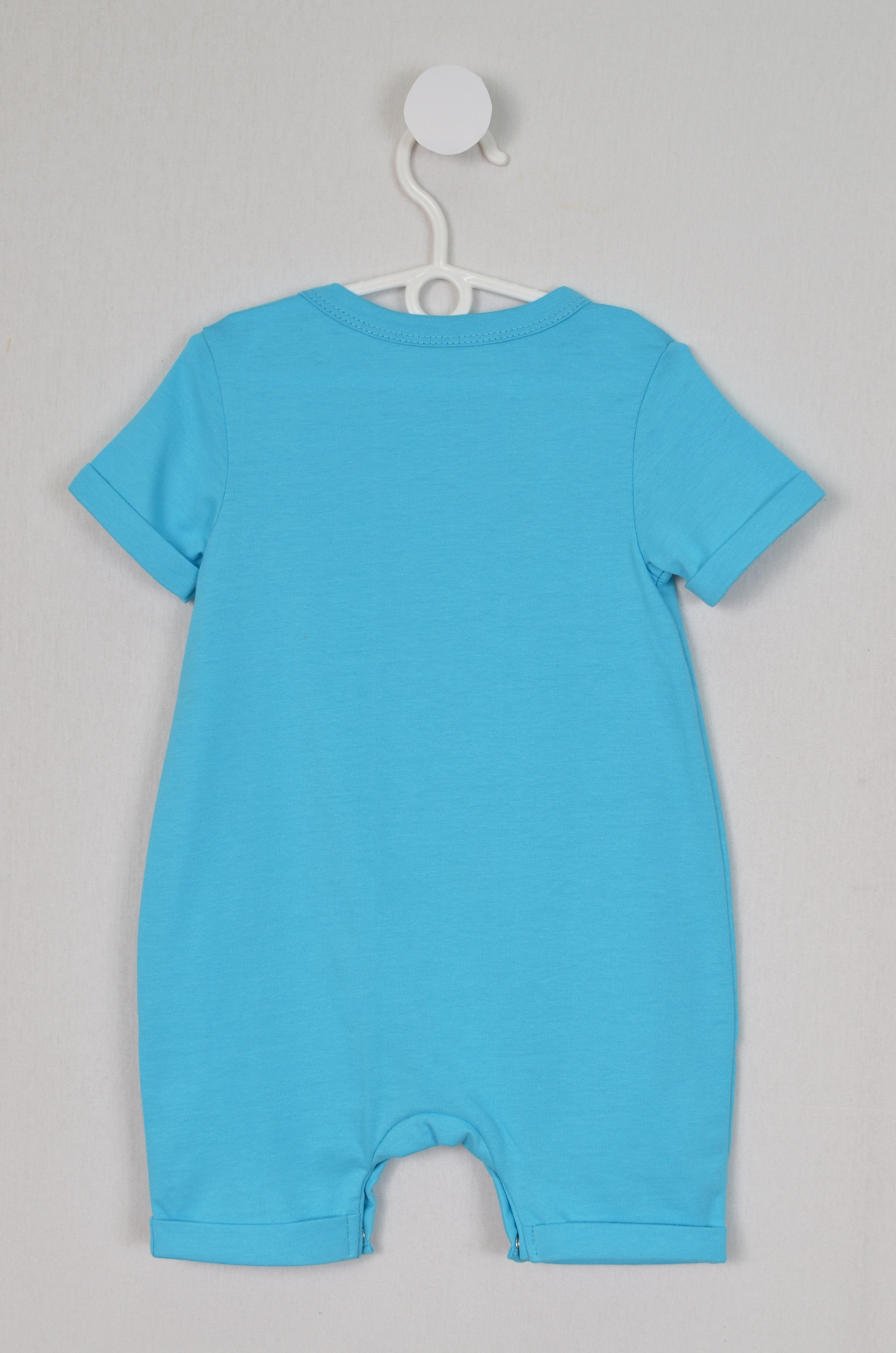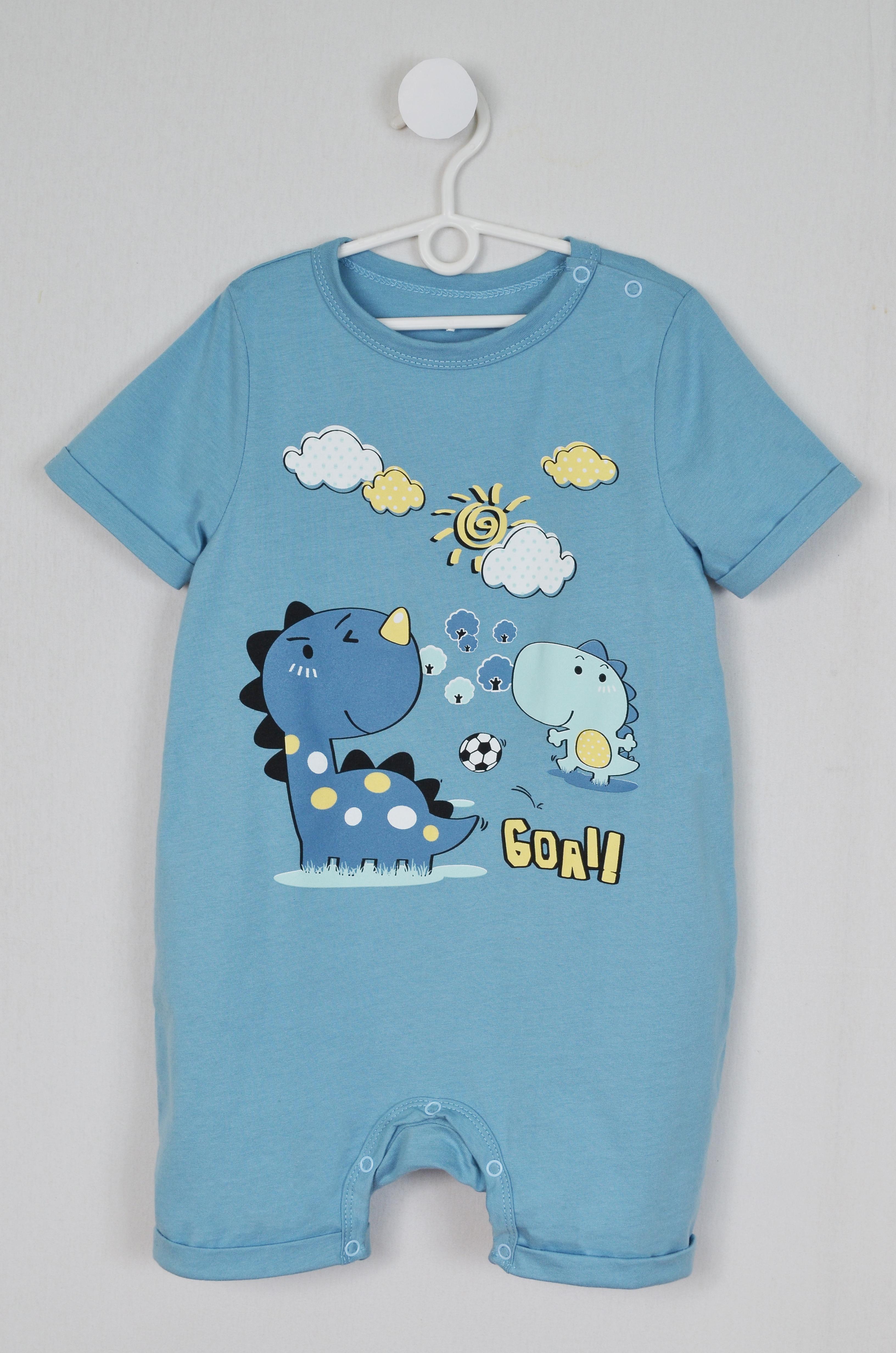 Кулирное полотно:100% х/б. Полукомбинезон-свободный,перед с печатью.Горловина окантована,застежка в плече на кнопки.Короткий рукав с отворотом.Низ ножек с отворотом,застежка по шаговому шву на кнопки.