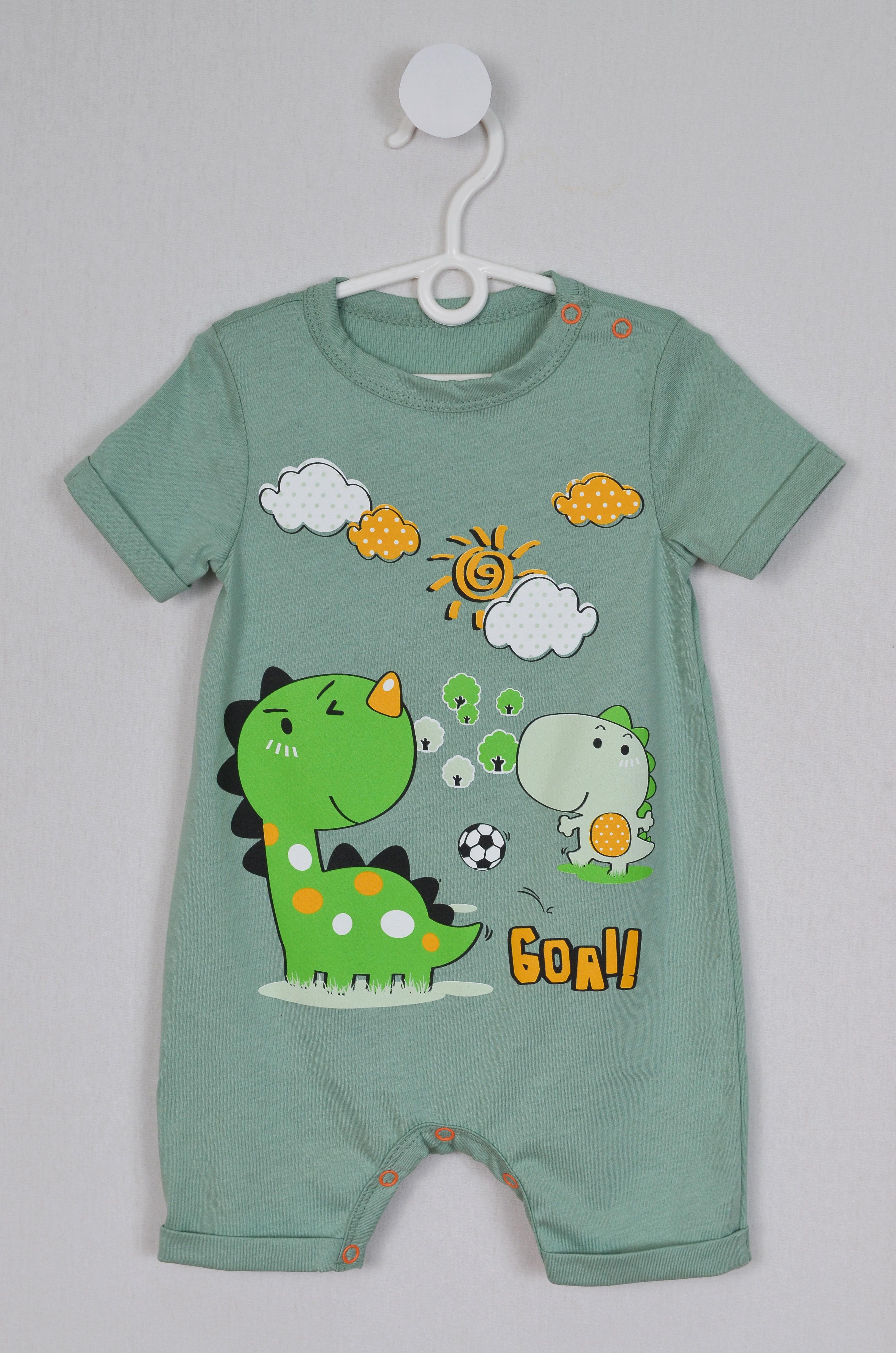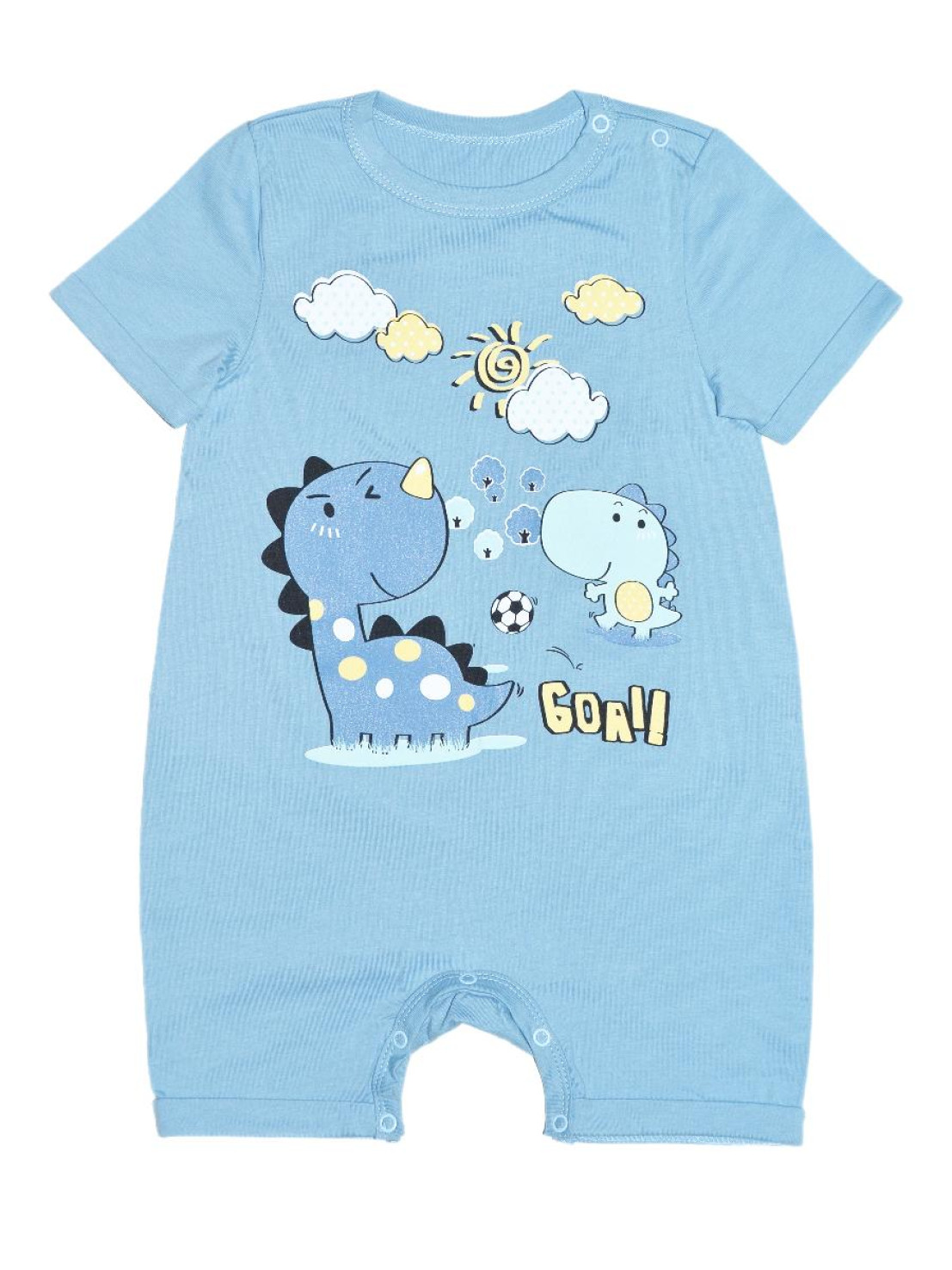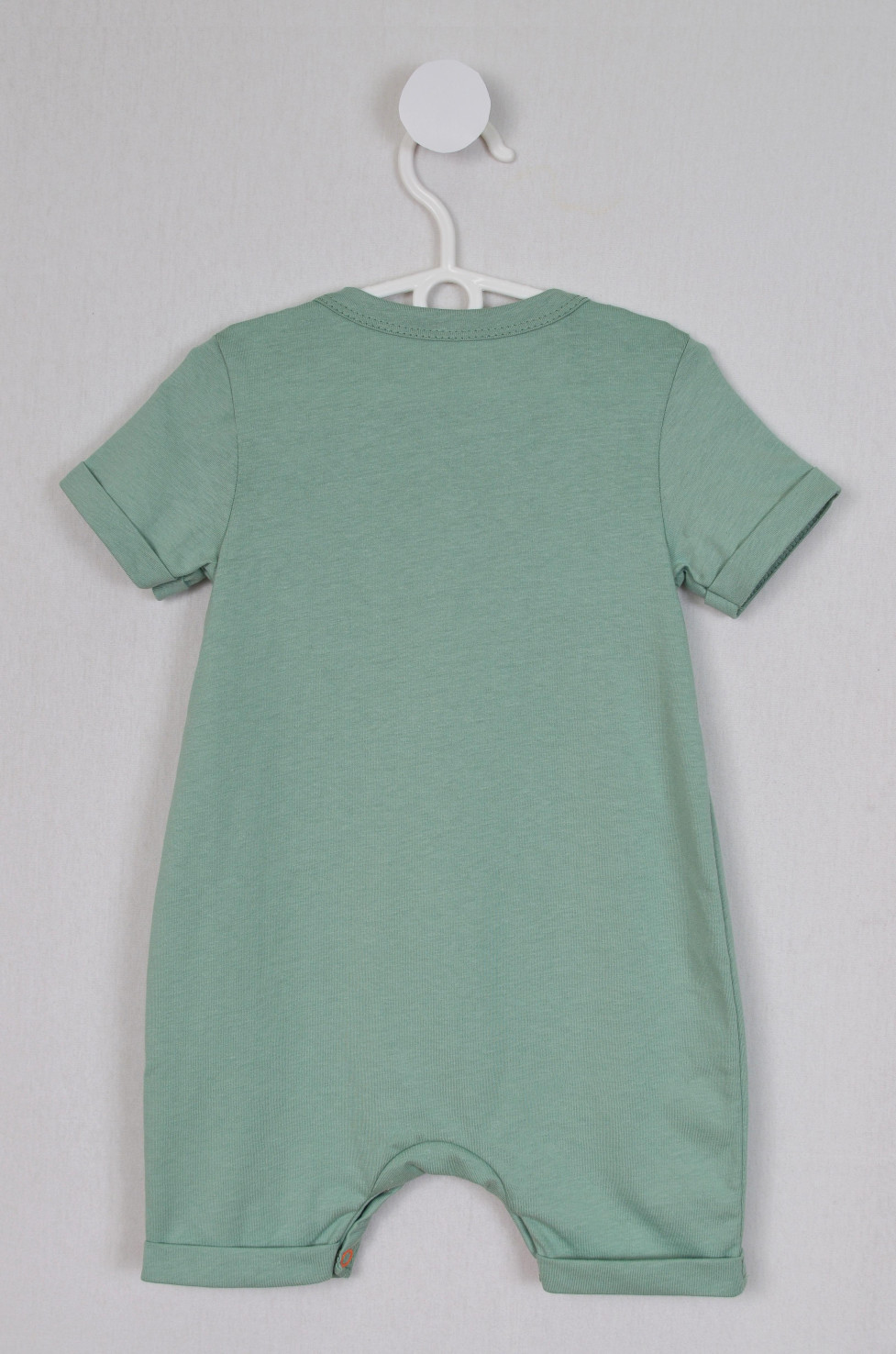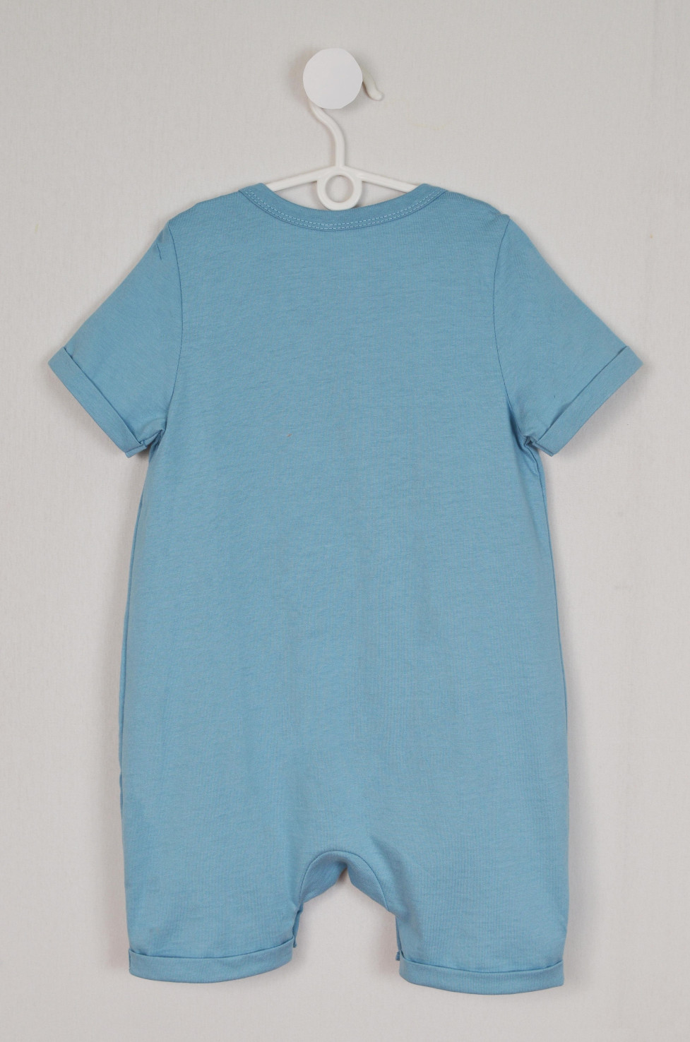 Кулирное полотно:100% х/б. Полукомбинезон-свободный,перед с печатью.Горловина окантована,застежка в плече на кнопки.Короткий рукав с отворотом.Низ ножек с отворотом,застежка по шаговому шву на кнопки.
