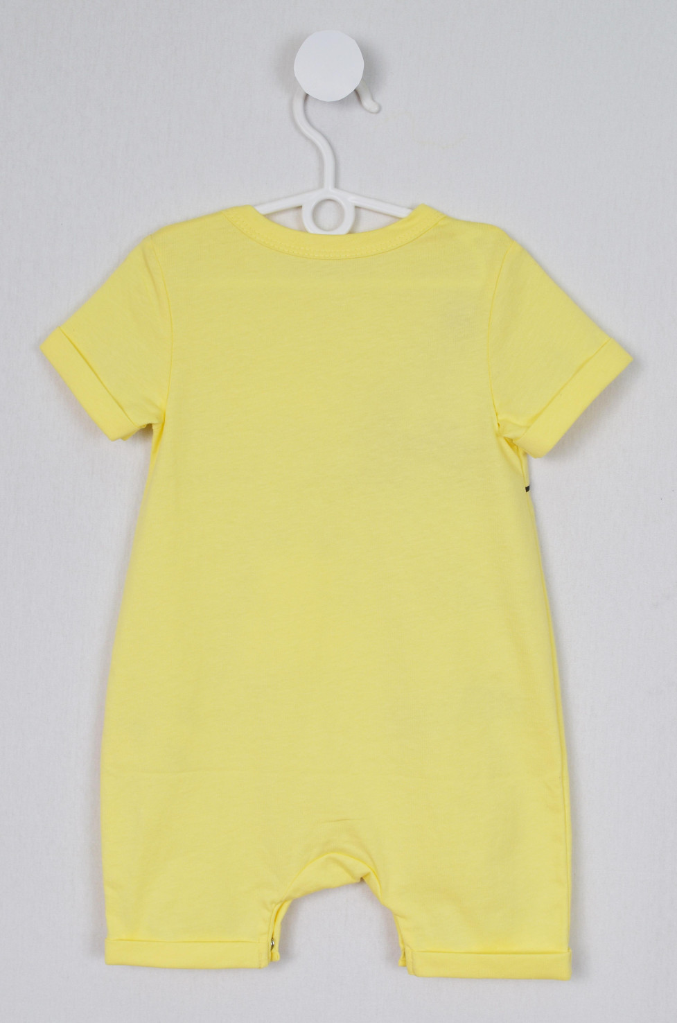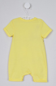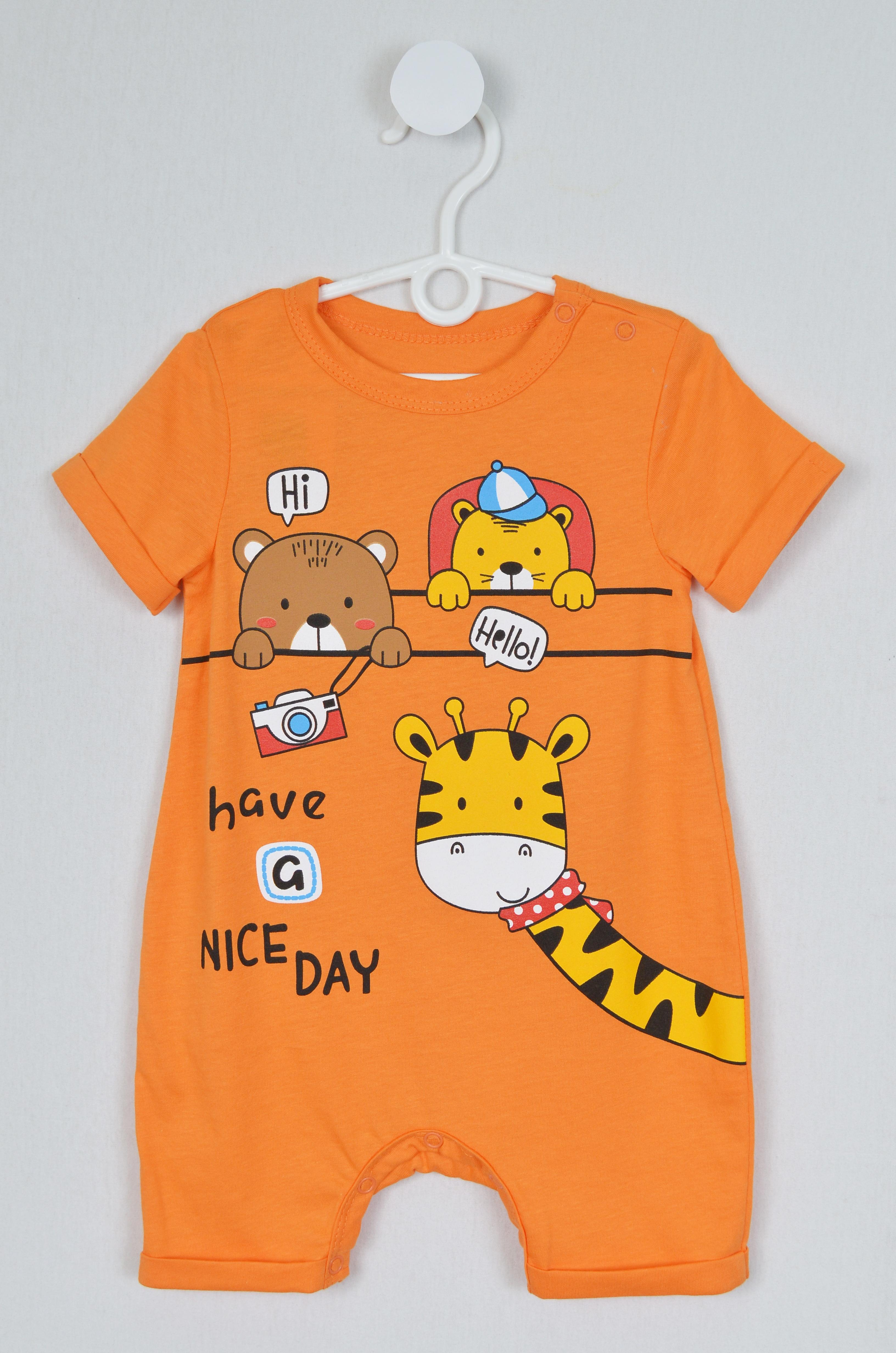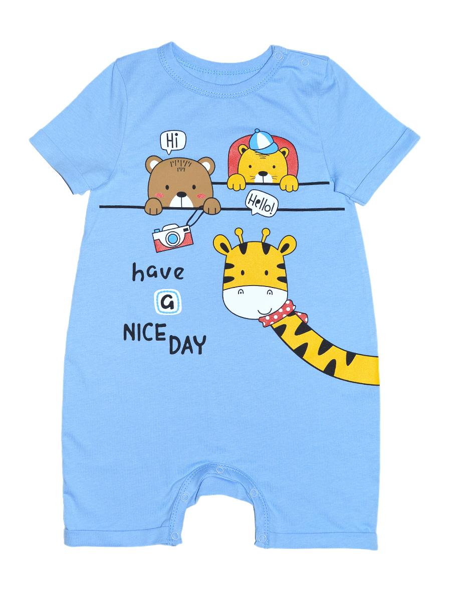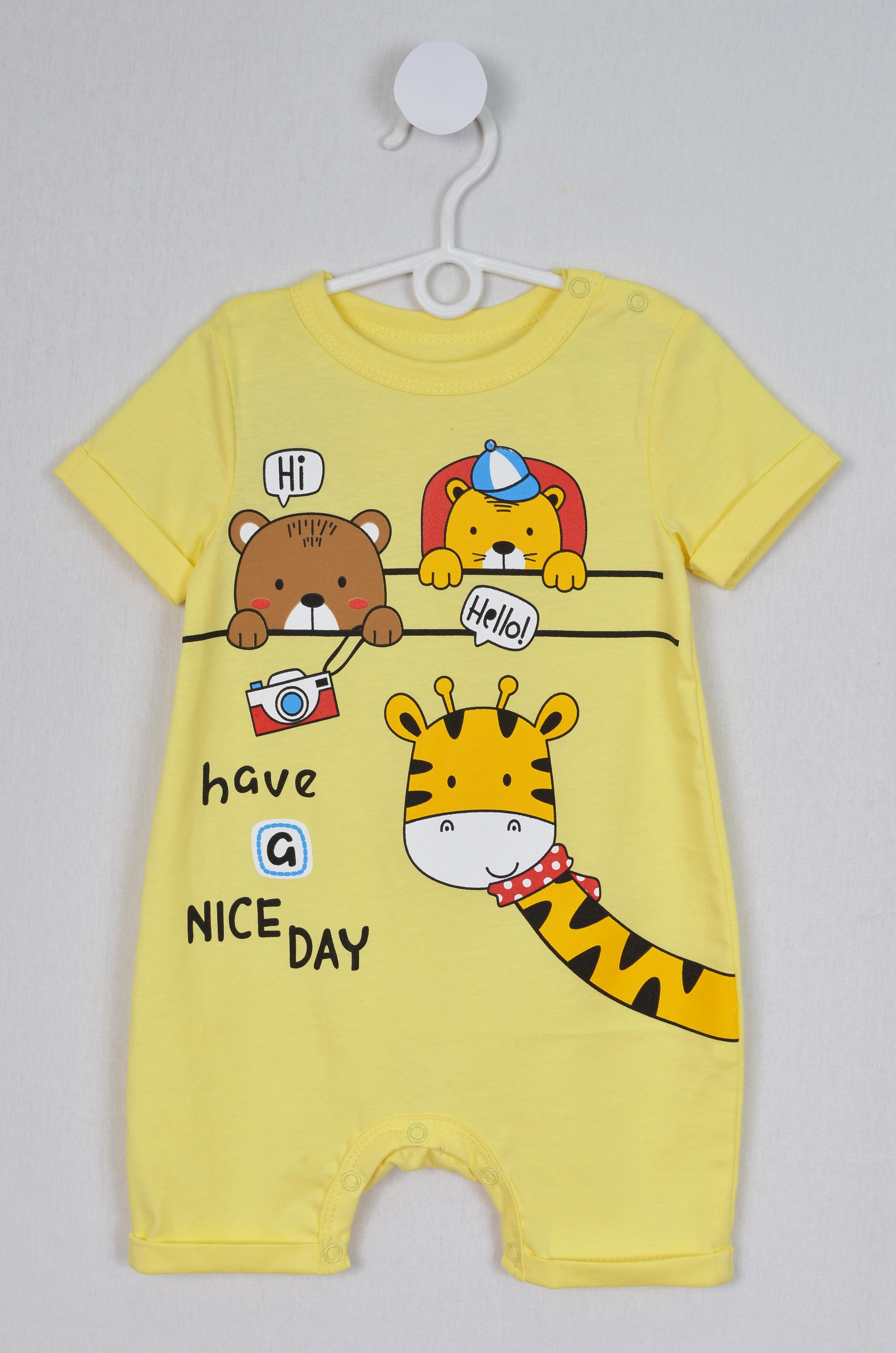 Кулирное полотно:100% х/б. Полукомбинезон-свободный,перед с печатью.Горловина окантована,застежка в плече на кнопки.Короткий рукав с отворотом.Низ ножек с отворотом,застежка по шаговому шву на кнопки.