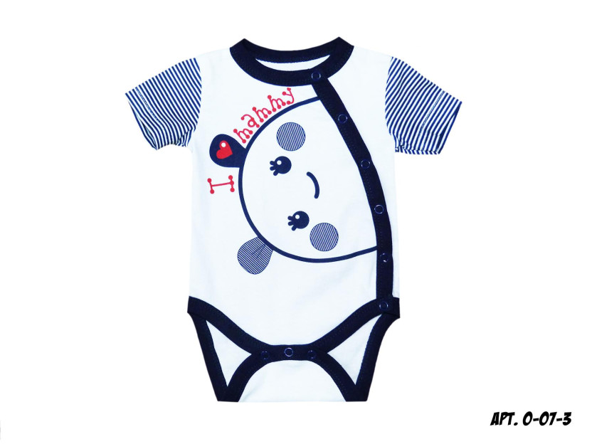 Полукомбинезон (боди). Кулирное полотно, 100% х/б. Застежка ассиметричная на переде слева(справа) и но низу изделия на кнопки. Рукав втачной, короткий, печать на переде. Горловина, край борта и низ изделия окантованы.